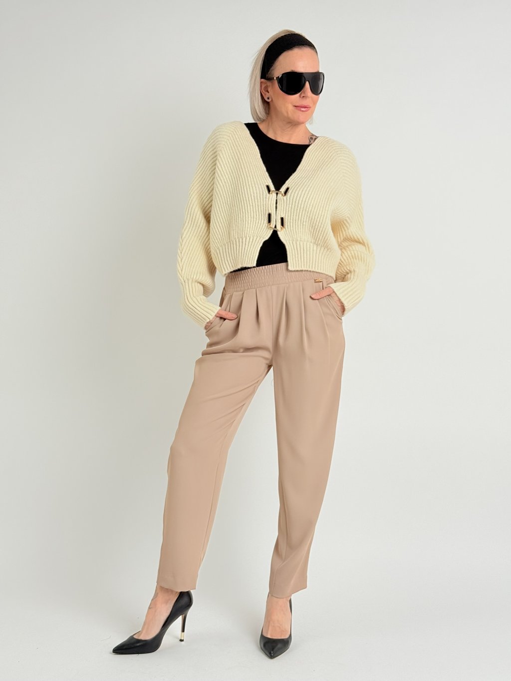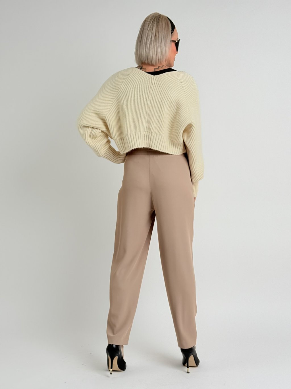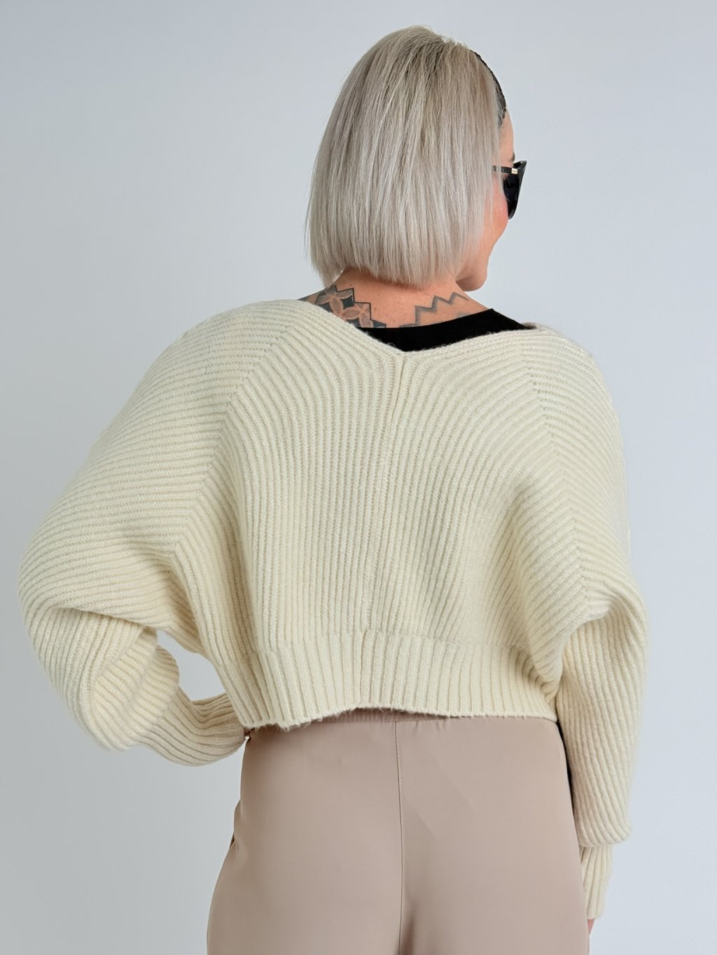 Svetr v kratším, raglánovém střihu, s výstřihem do V a zapínáním na spony ve zlaté barvě barvě.
