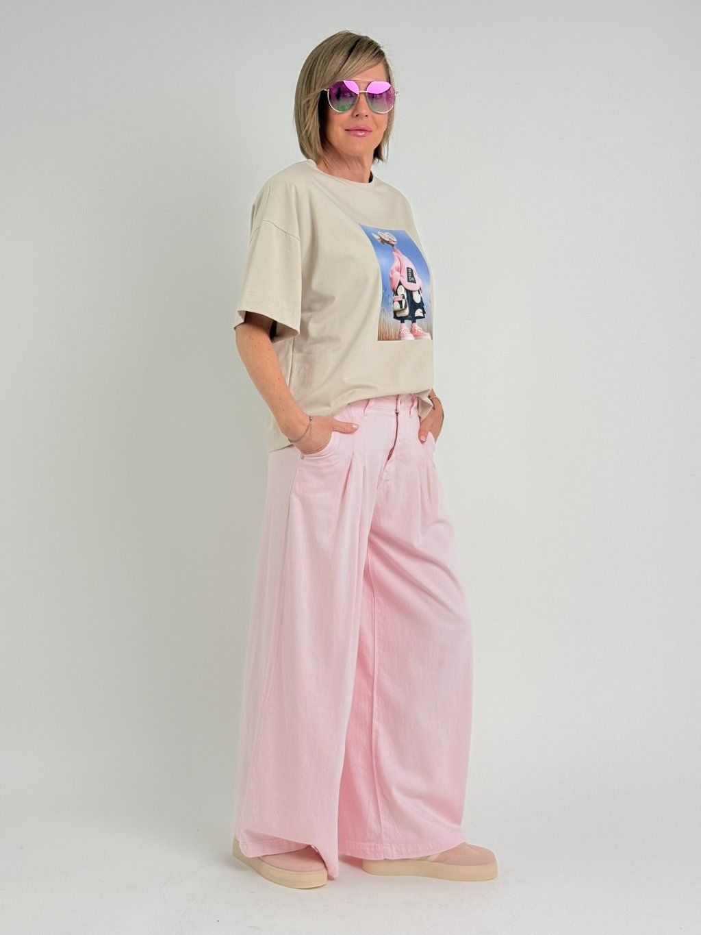 Krásné, volnější triko s kulatým výstřihem, krátkým rukávem, malými, ramenními vycpávkami a potiskem na předním dílu.