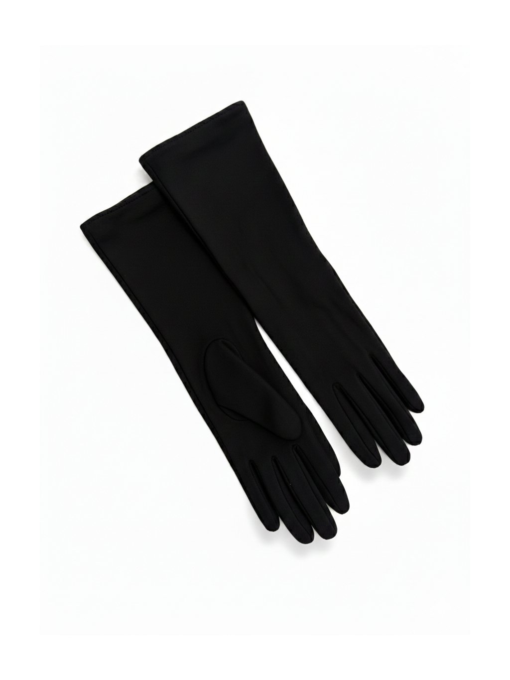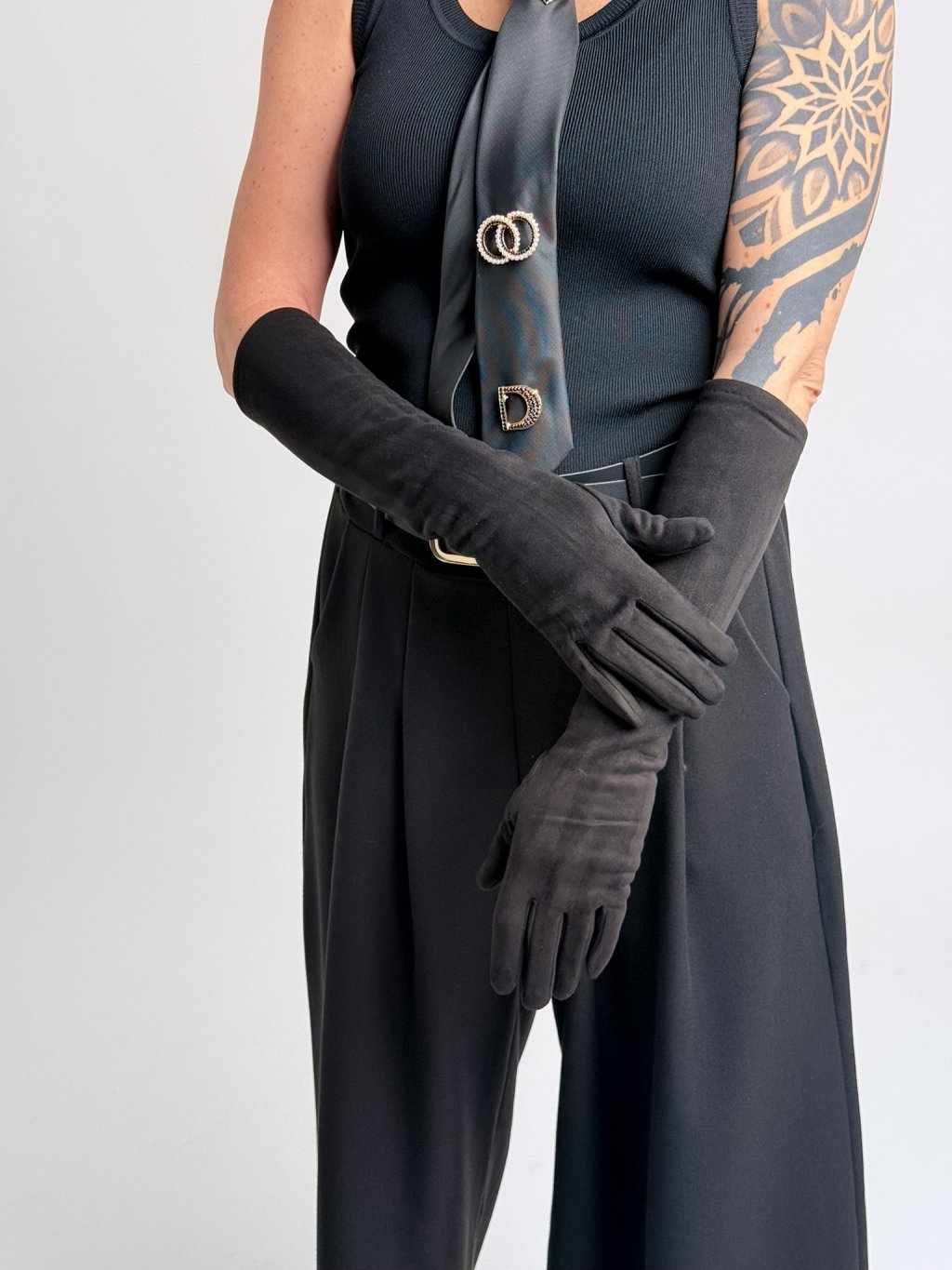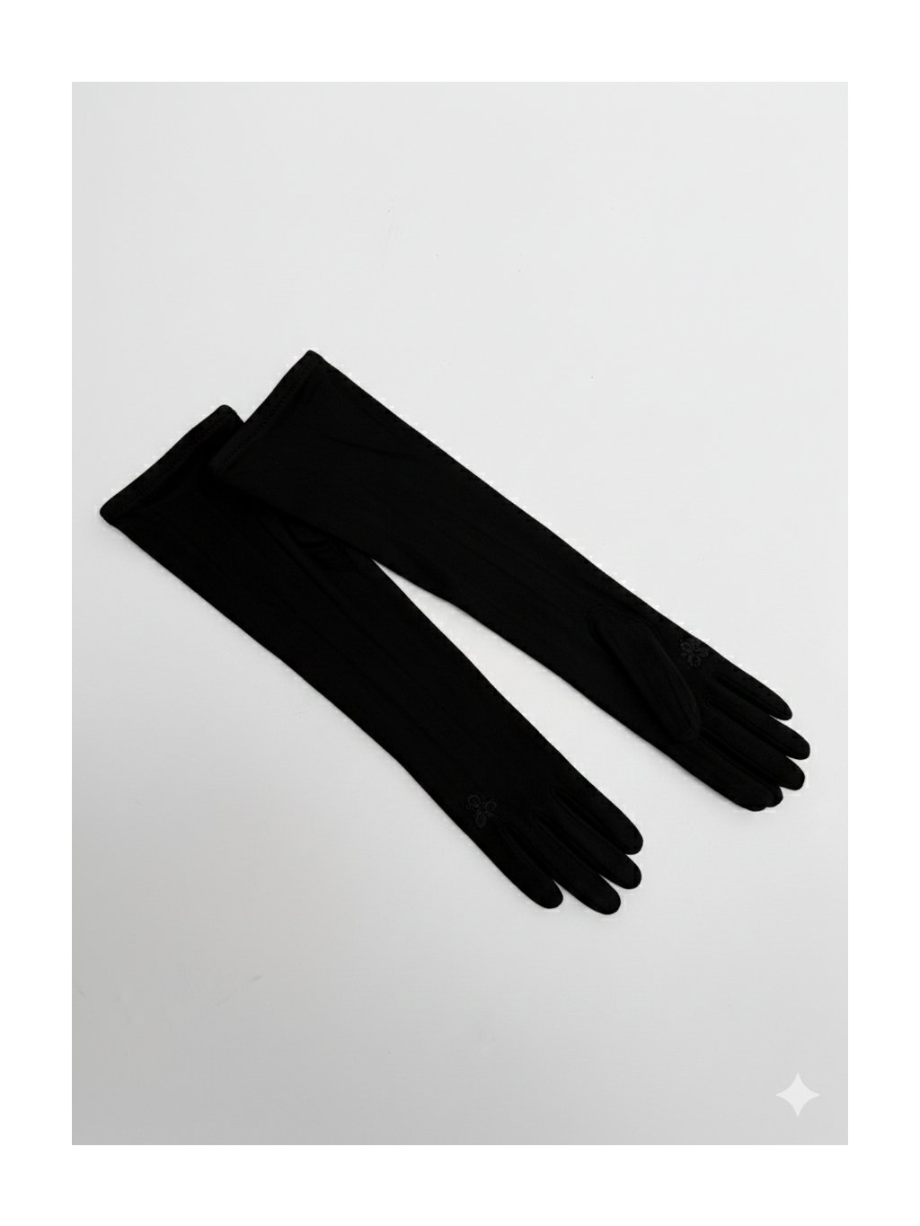 Vyšší, černé, látkové rukavice, které sedí na velikost S-L, výška od prostředního prstu ke kraji je 44 cm.