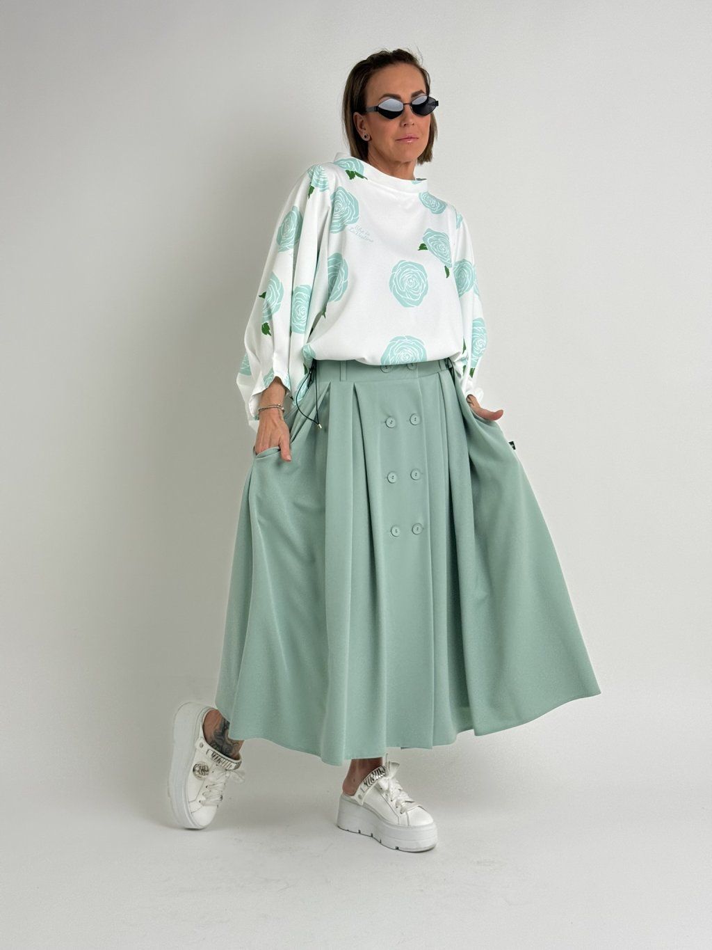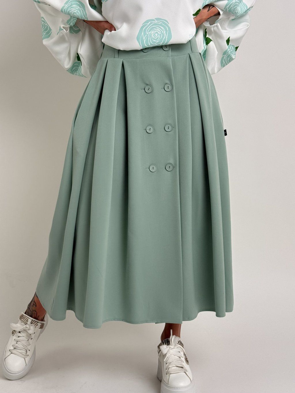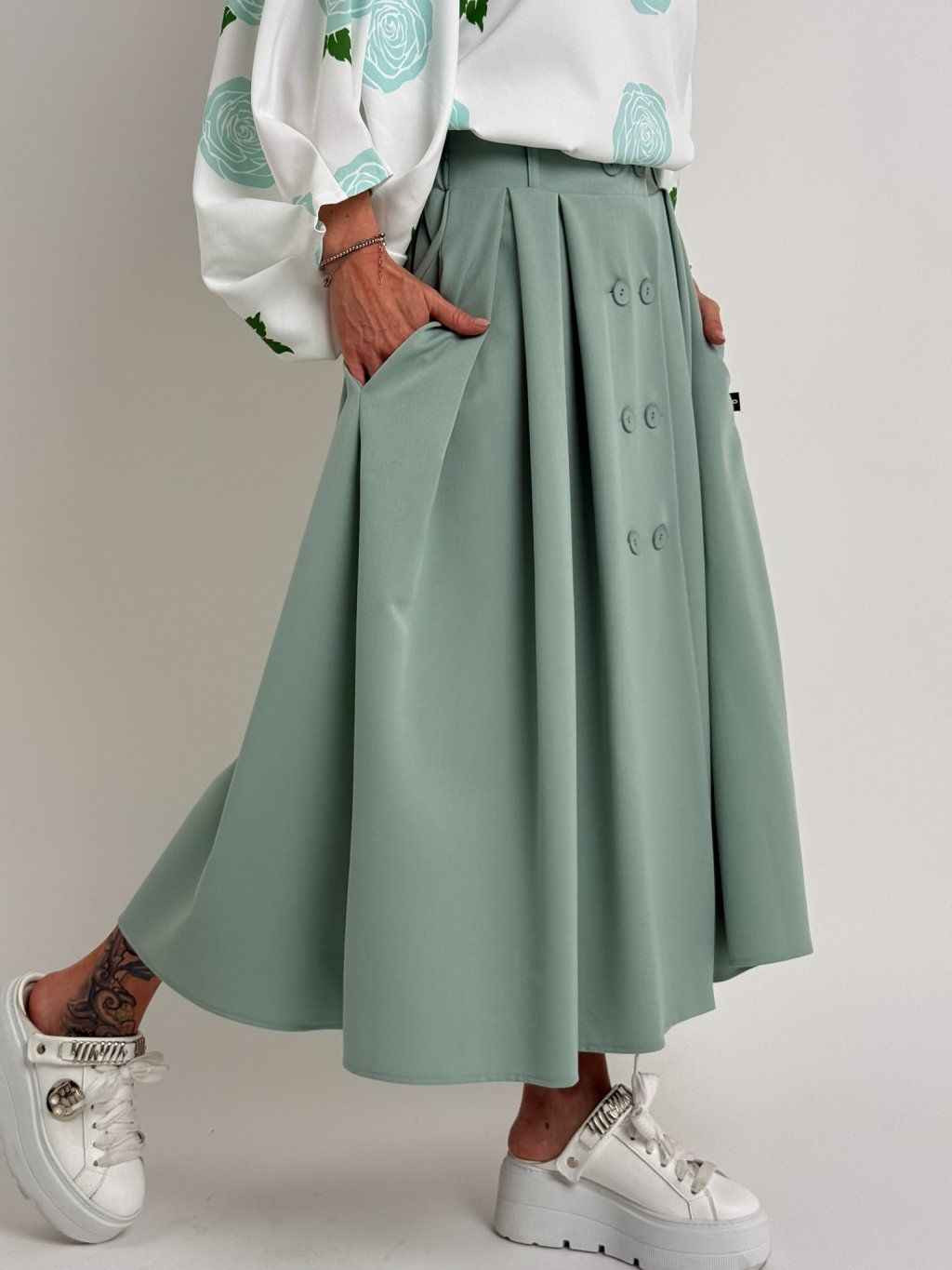 Úžasná sukně v pase do sámků, v zadní části pasu do gumy, vpředu propínací dvěma řadami knoflíků.