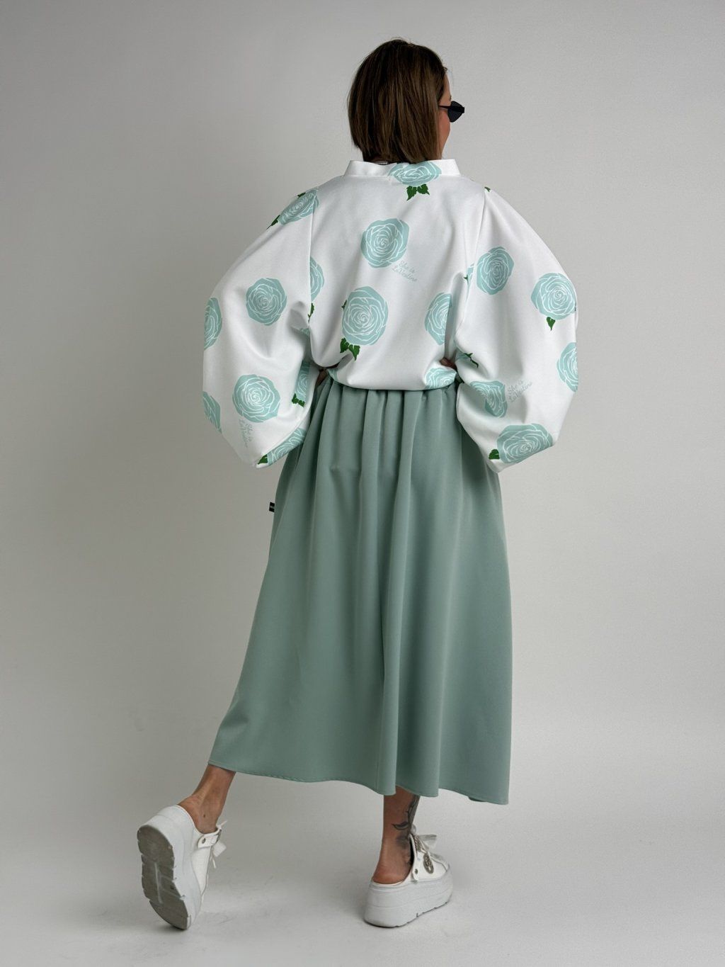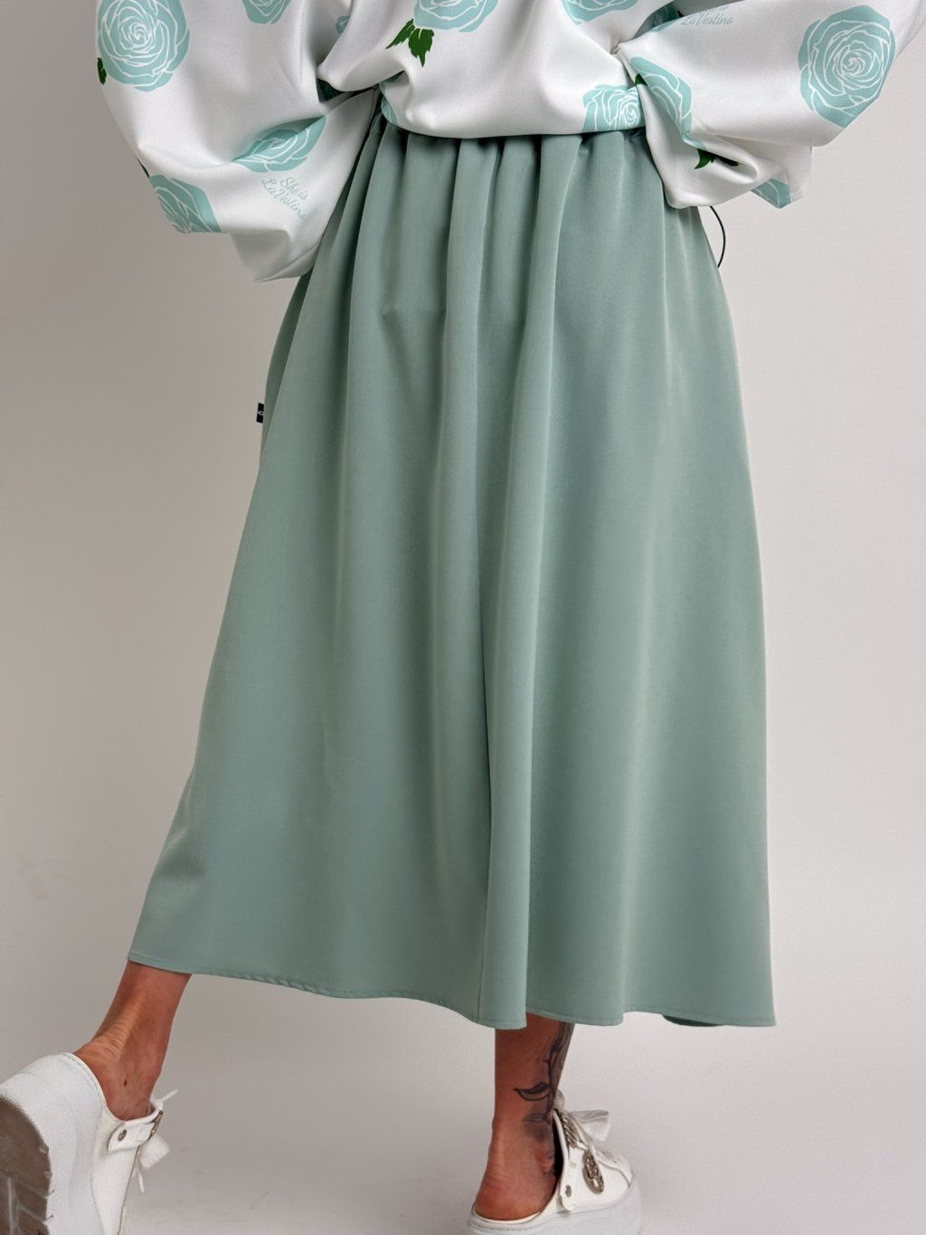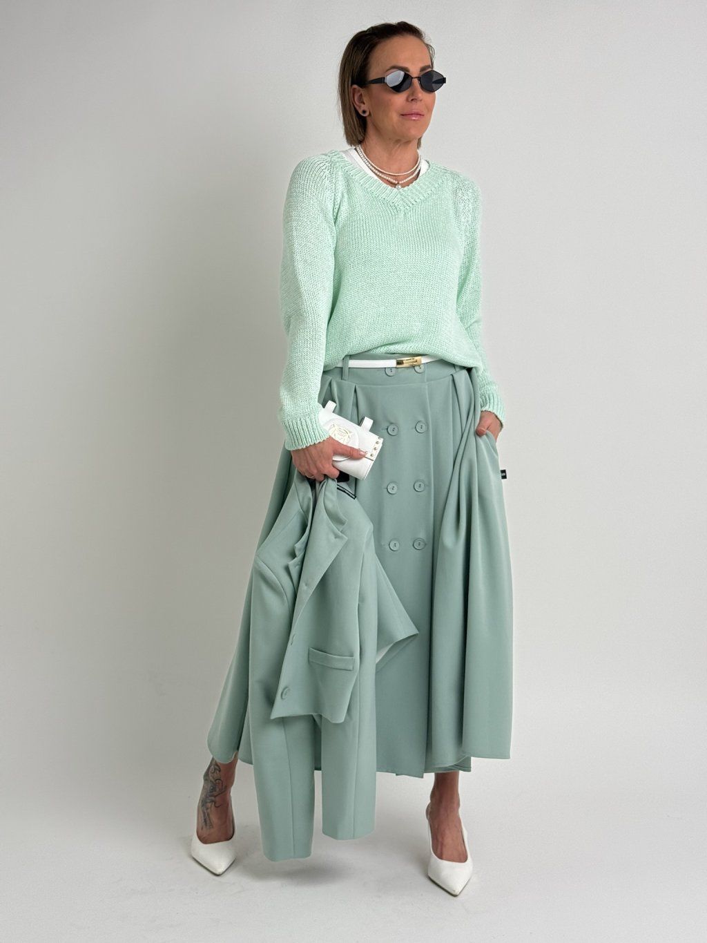 Úžasná sukně v pase do sámků, v zadní části pasu do gumy, vpředu propínací dvěma řadami knoflíků.