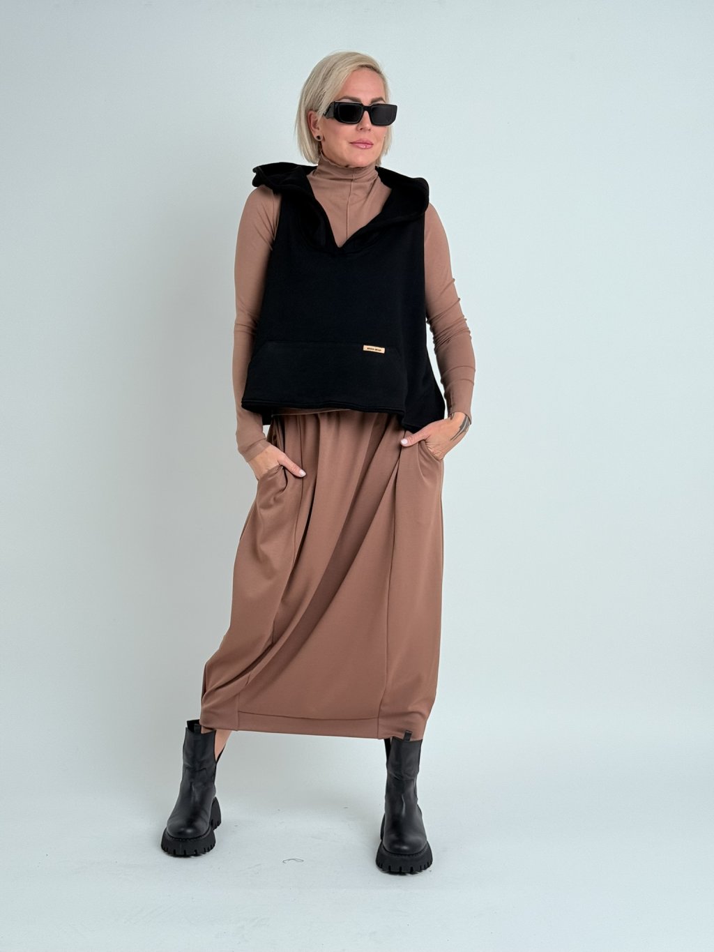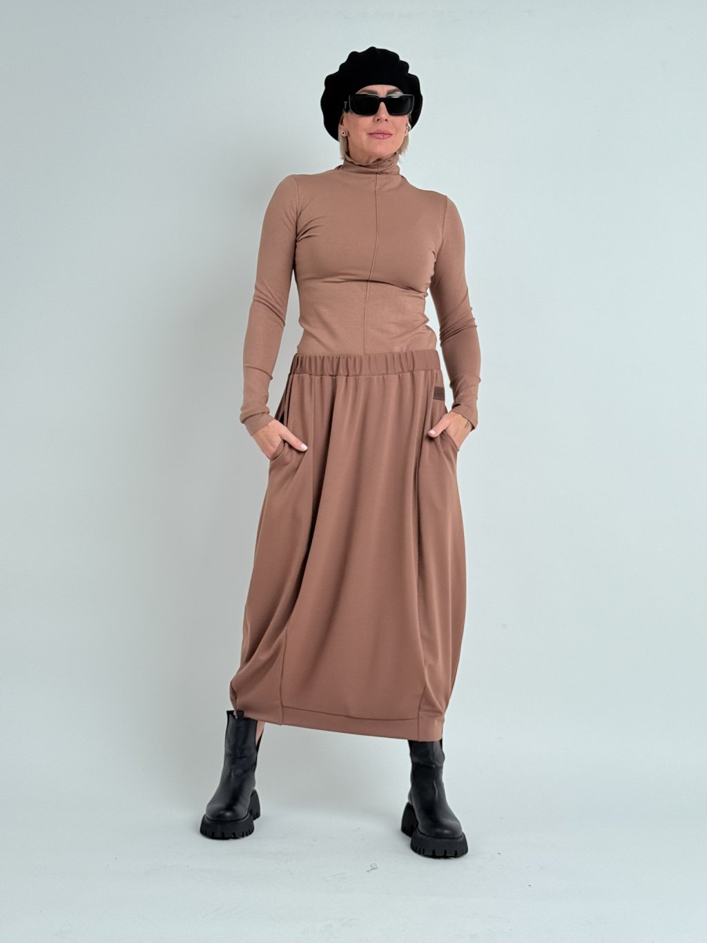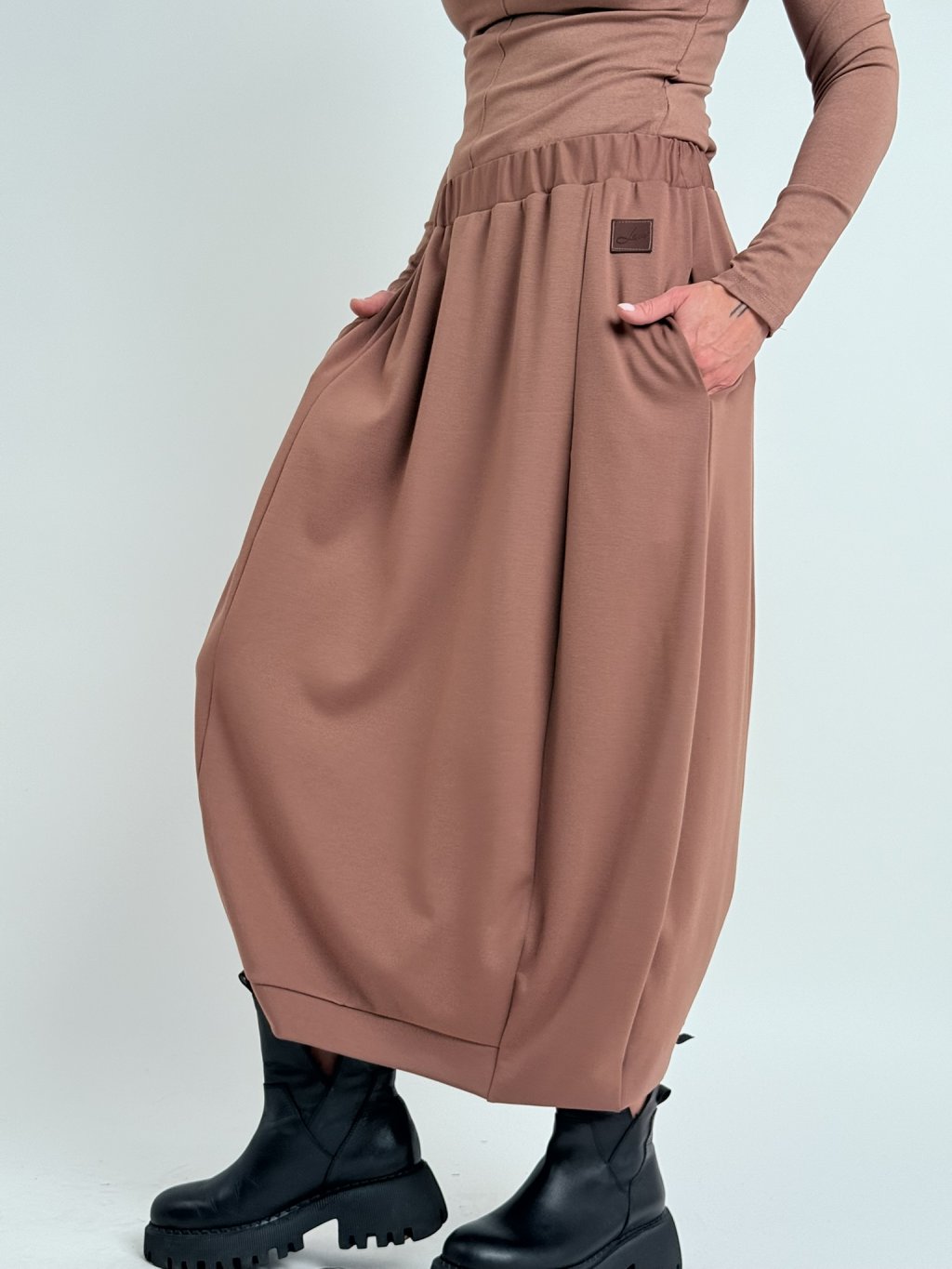 Super pohodlná sukně v balonovém střihu, v pase do gumy a vnitřními, postranními kapsami.