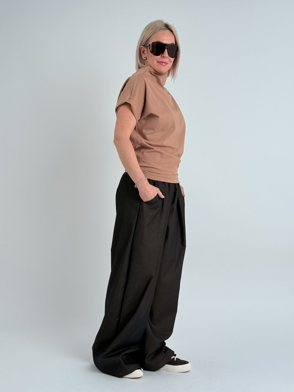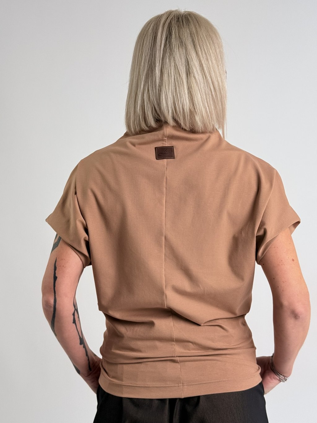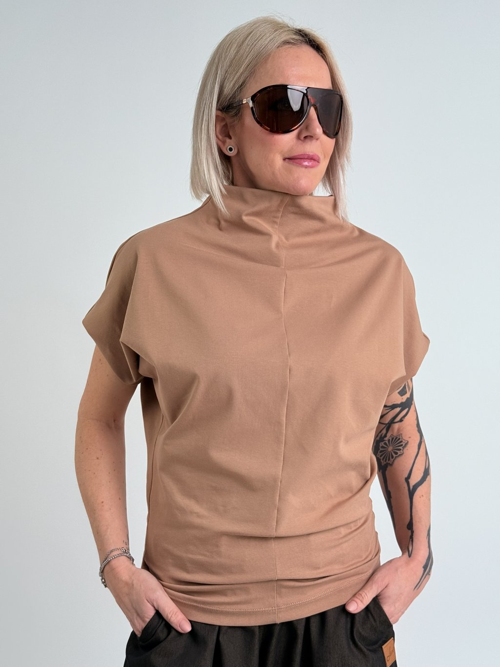 Jednoduché, příjemné, lehce pružné triko se spadlým rukávem a stojáčkem.