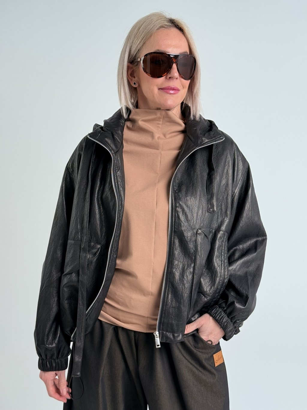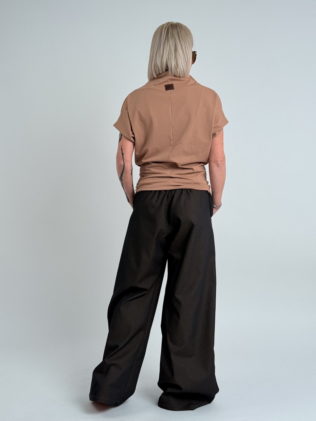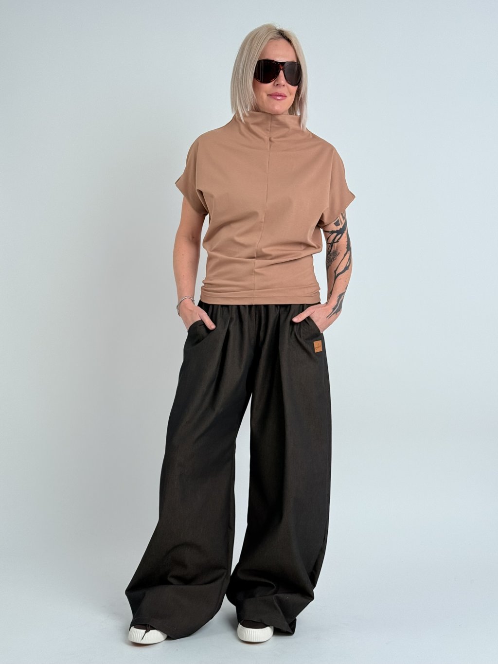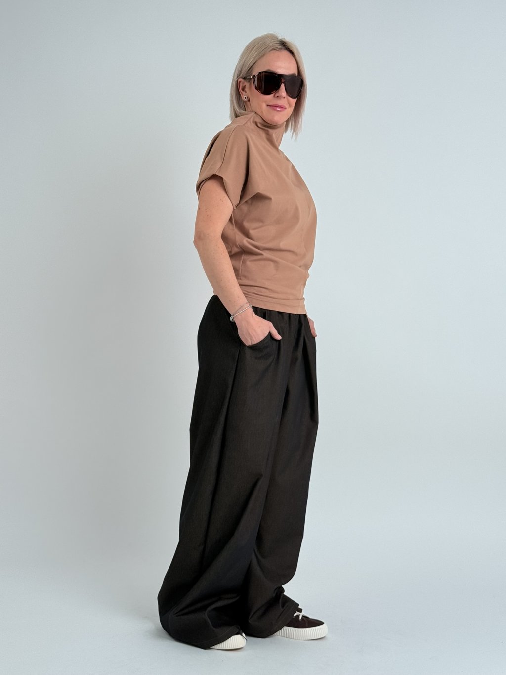 Jednoduché, příjemné, lehce pružné triko se spadlým rukávem a stojáčkem.