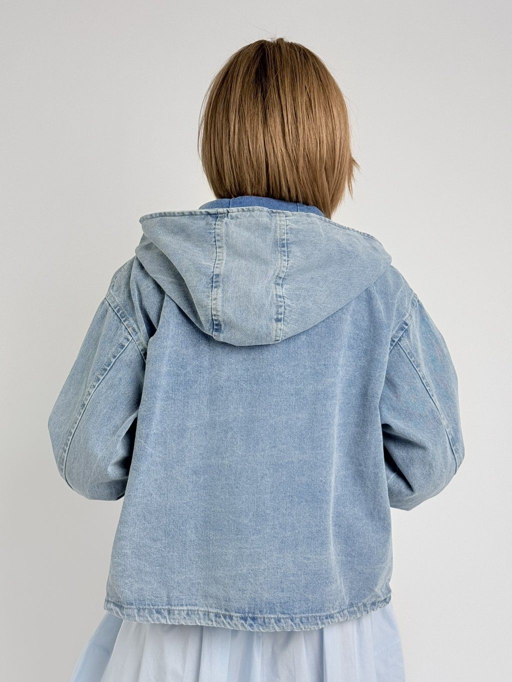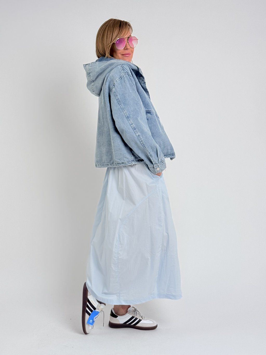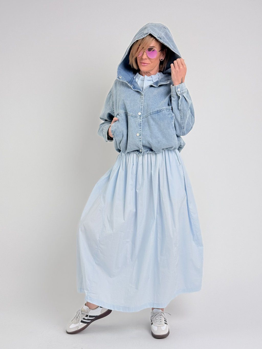 Super, oversize džínová bunda se zapínáním na patenty, s kapucí, kapsami na předním dílu a možností stažení v dolní části.