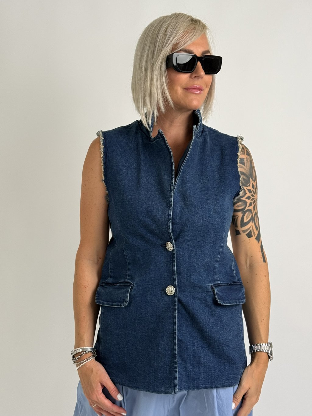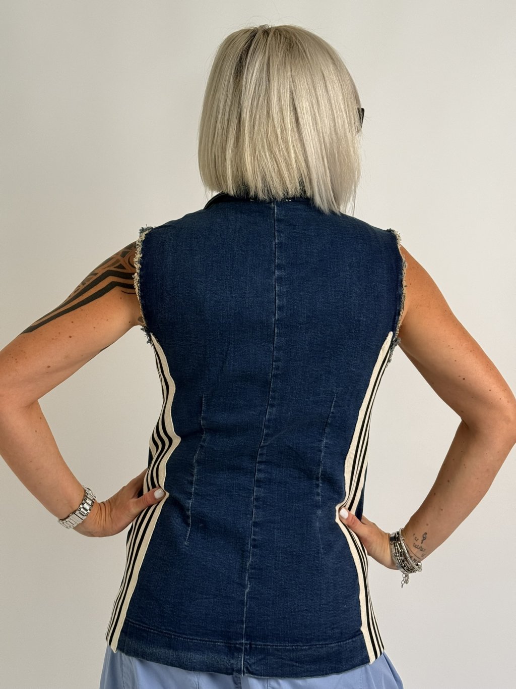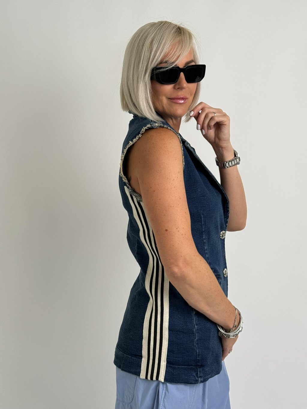 Úžasný a originální kousek, zajímavě řešená vesta se zapínáním na knoflíky, s límcem a po straně lampasy Vypadá skvěle na triko i košili.