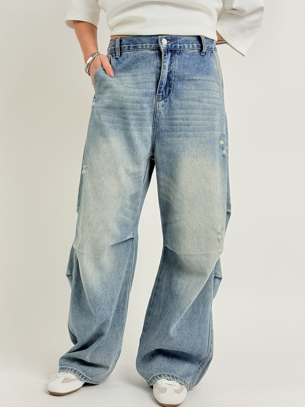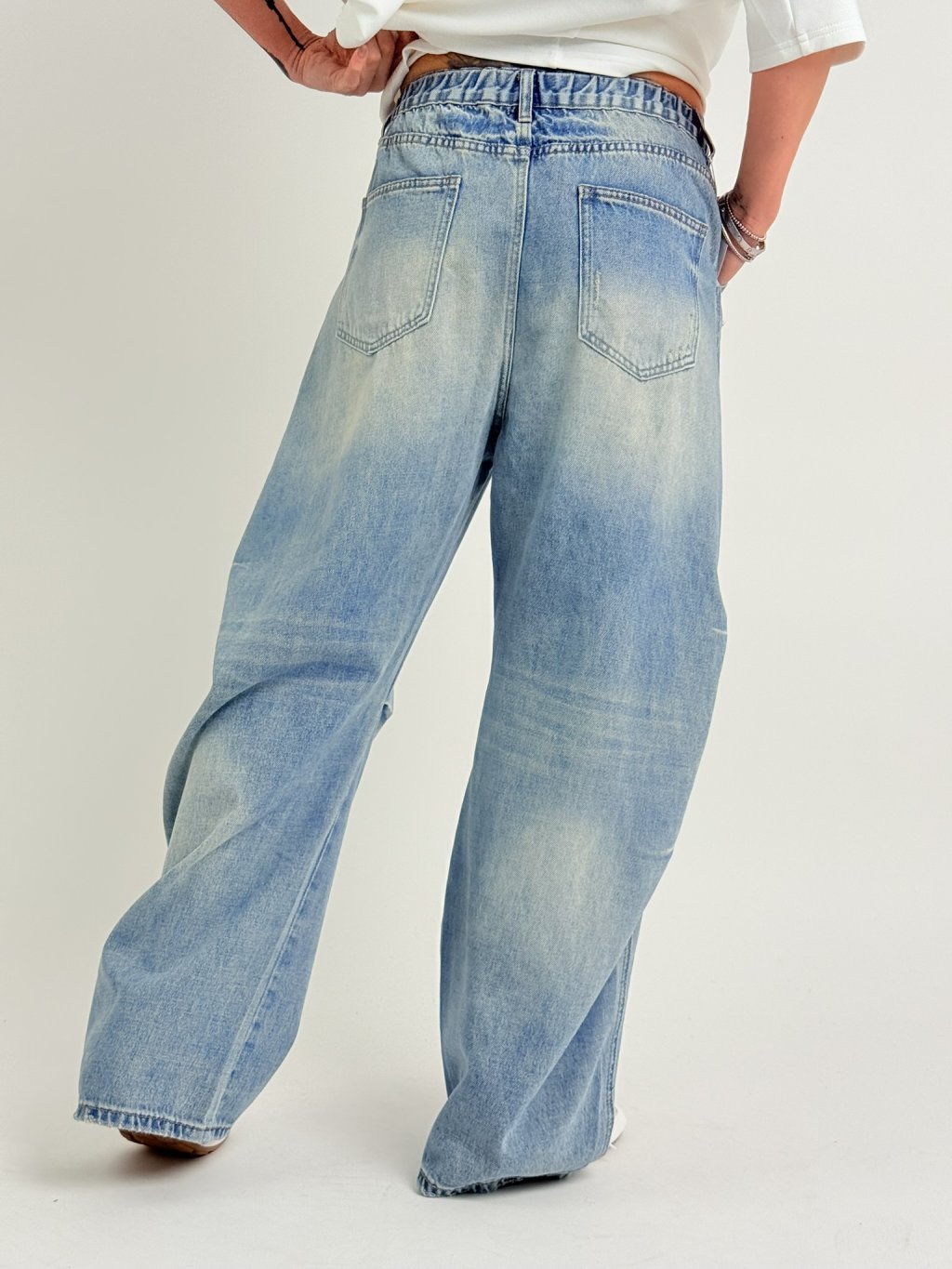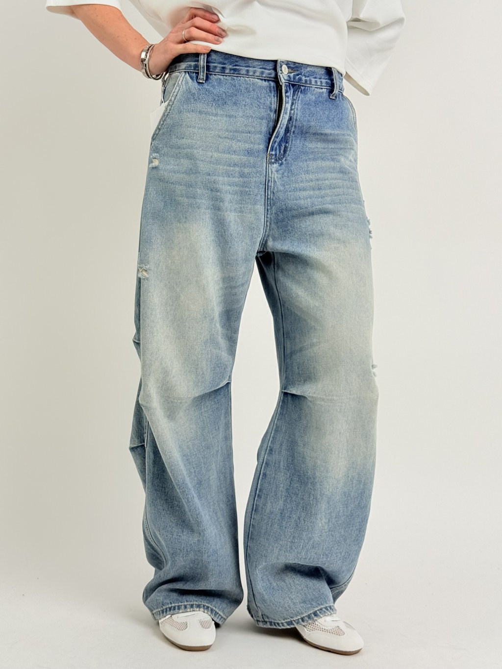 Džíny v balonovém střihu, v zadní části pasu do gumy, lehkým trháním a sámky po stranách nohavic.