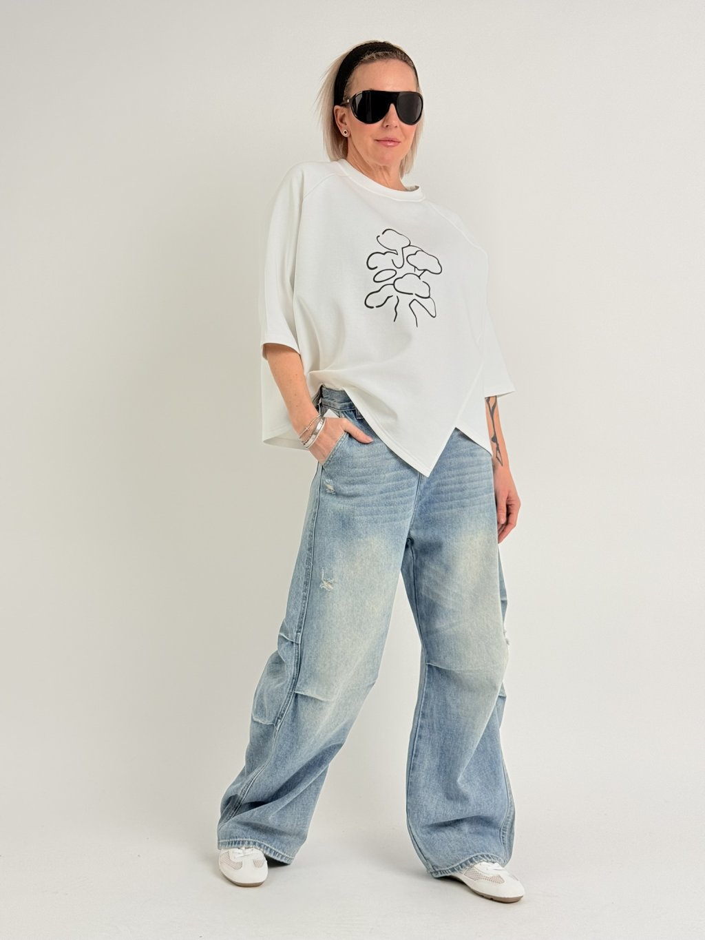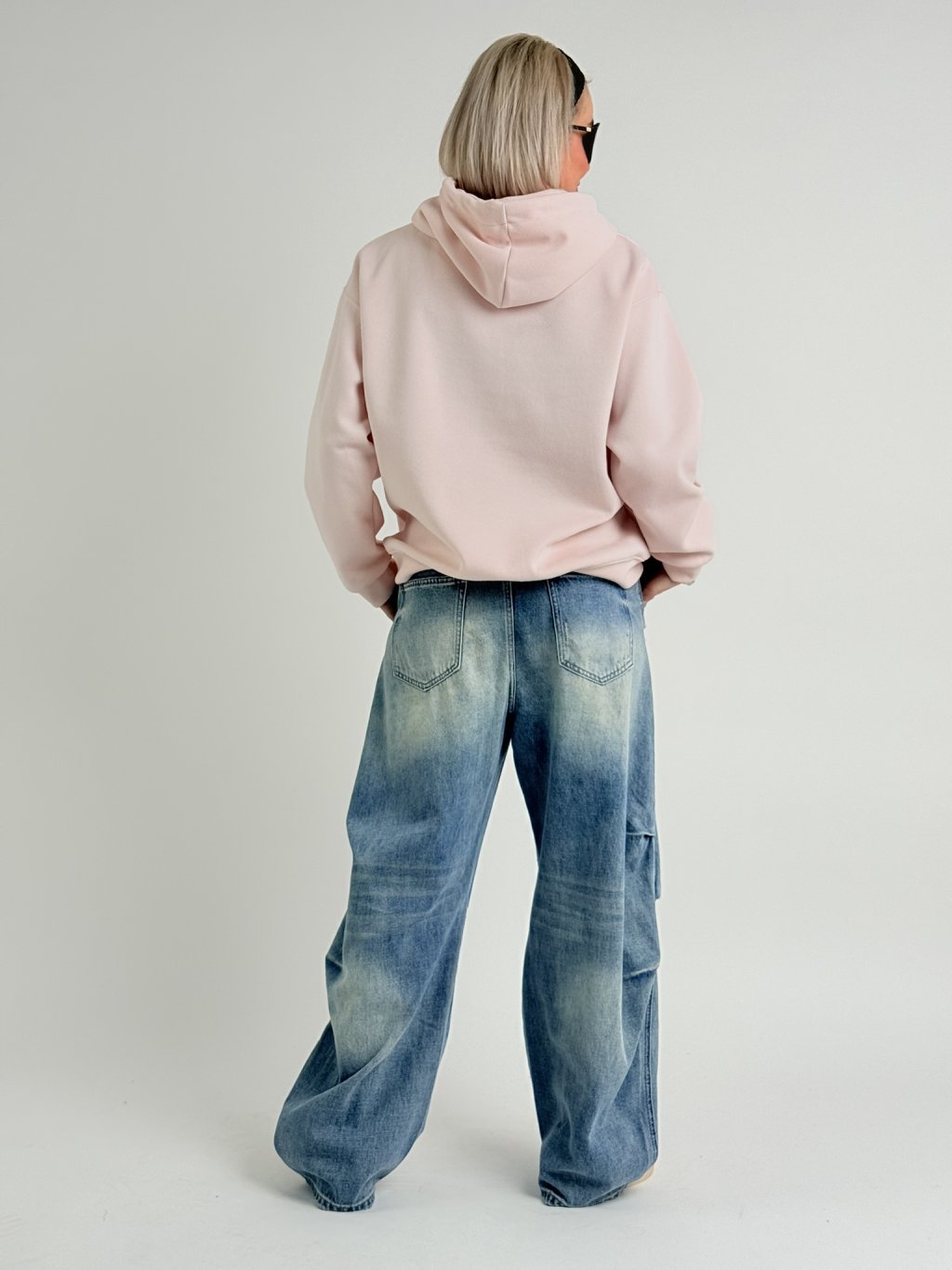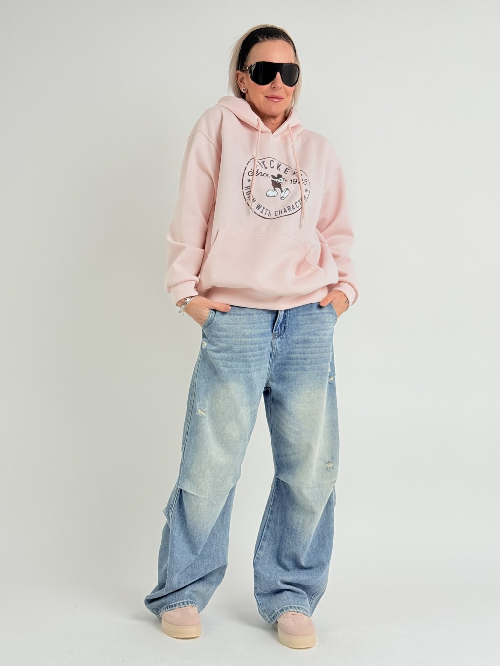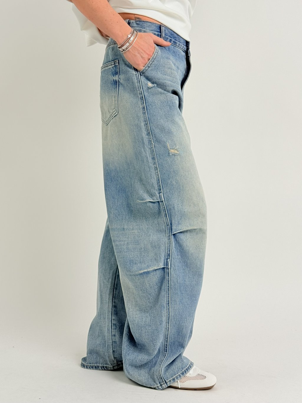 Džíny v balonovém střihu, v zadní části pasu do gumy, lehkým trháním a sámky po stranách nohavic.