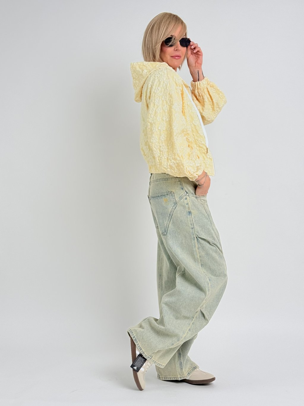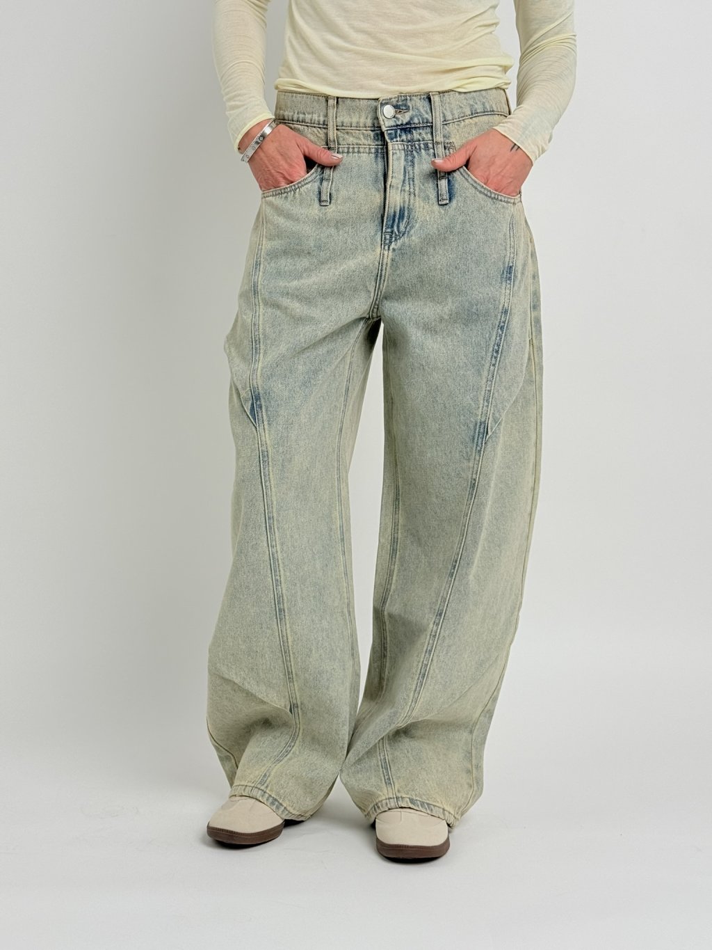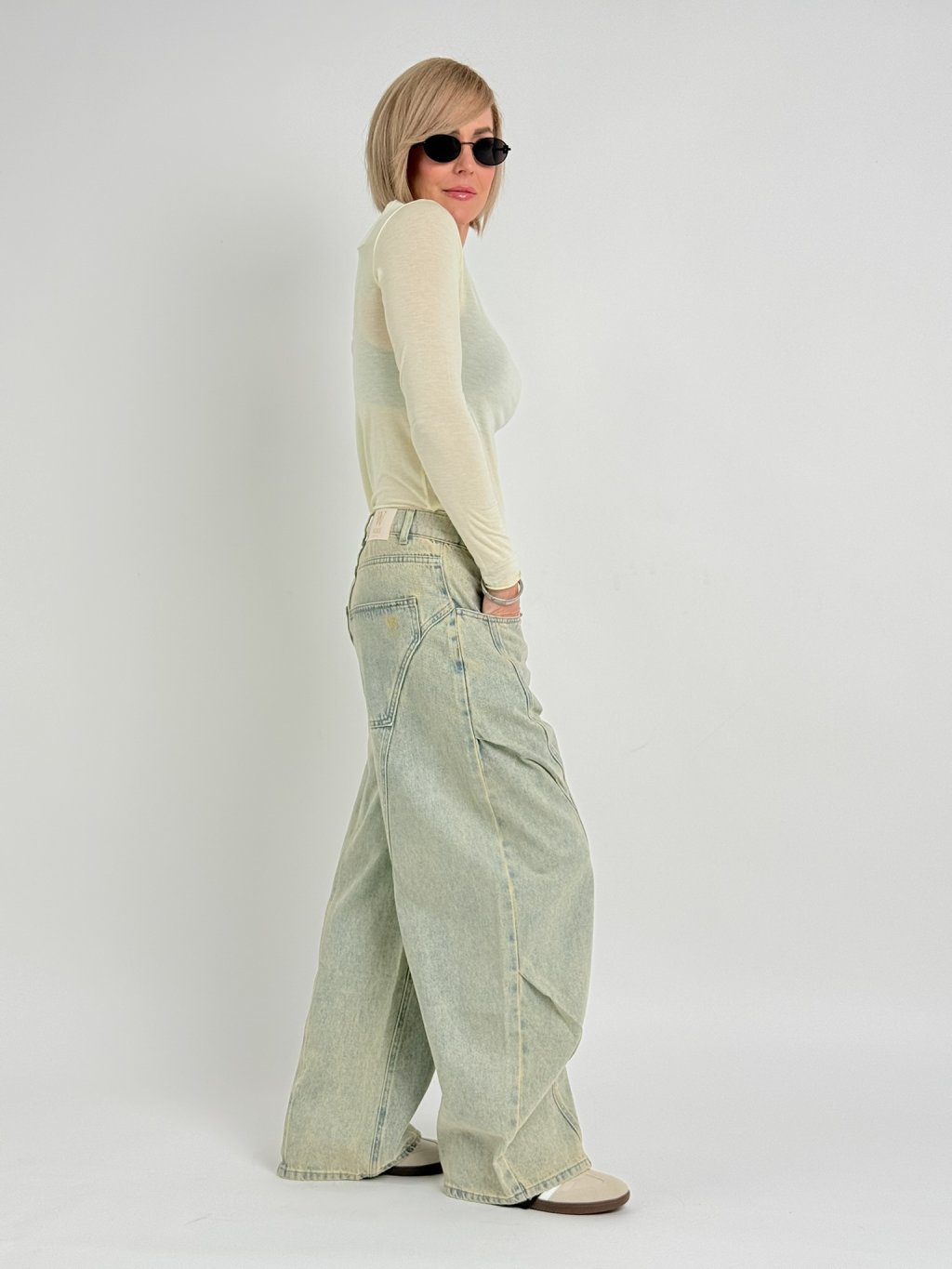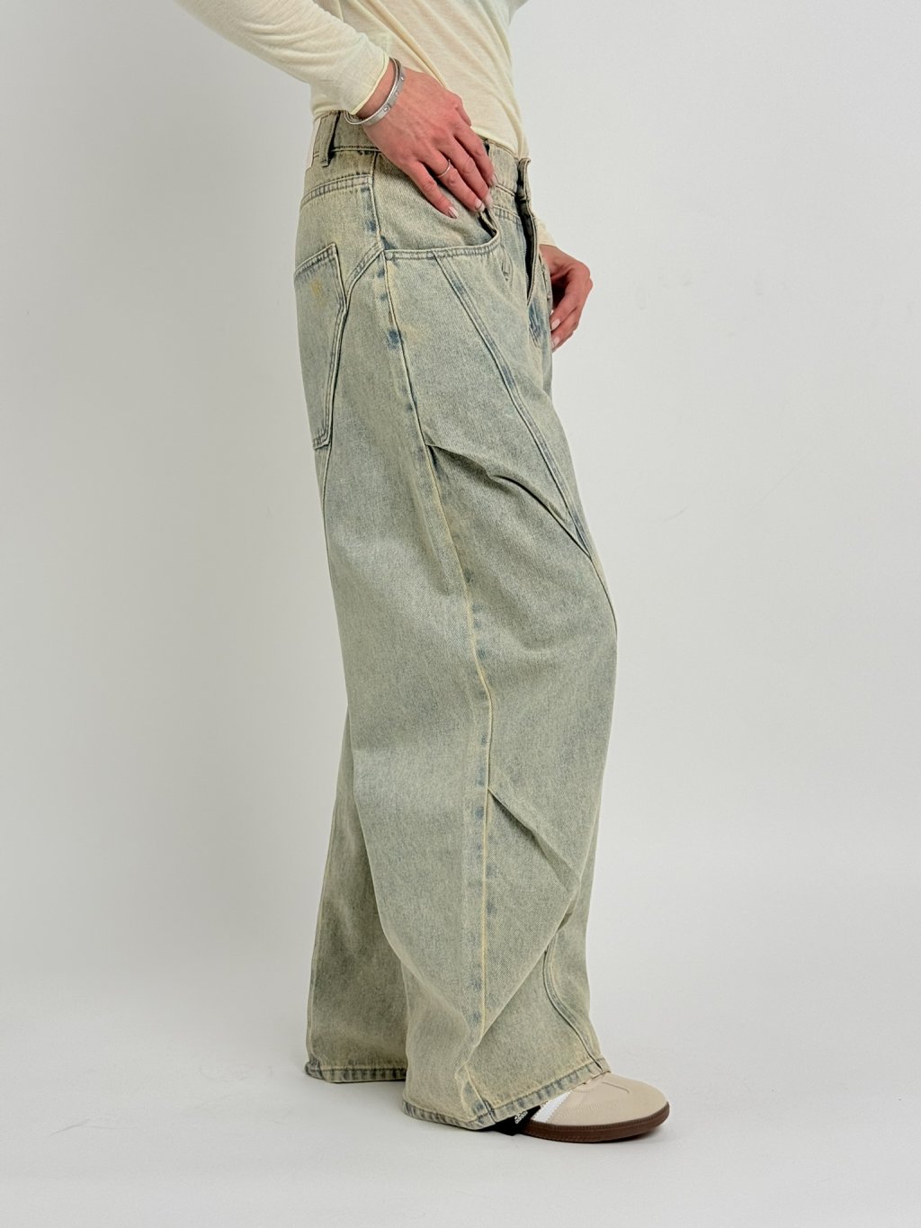 Luxusní, šisované, balonové džíny s poutky na 3 pásky, s předními i zadními kapsami..