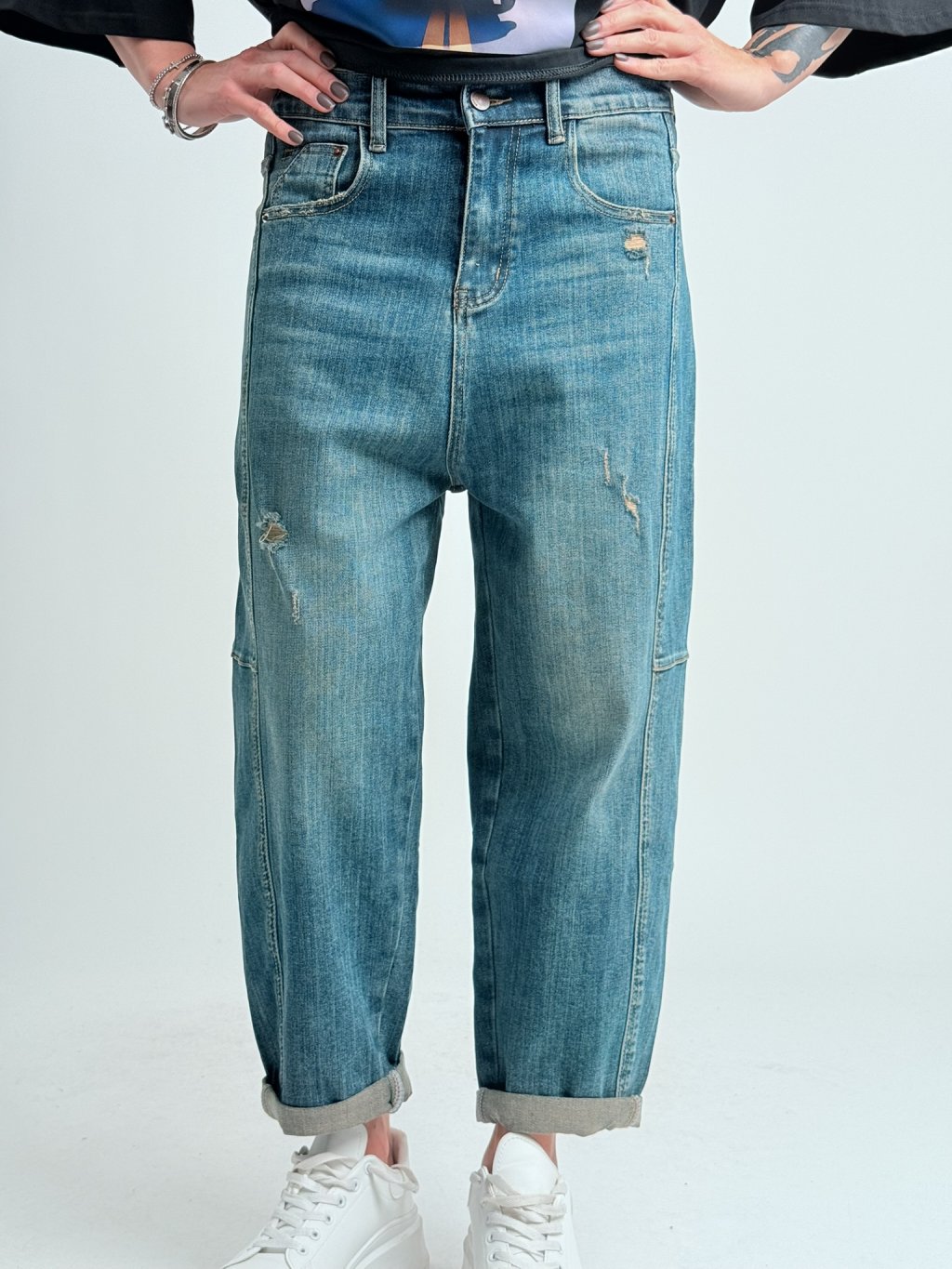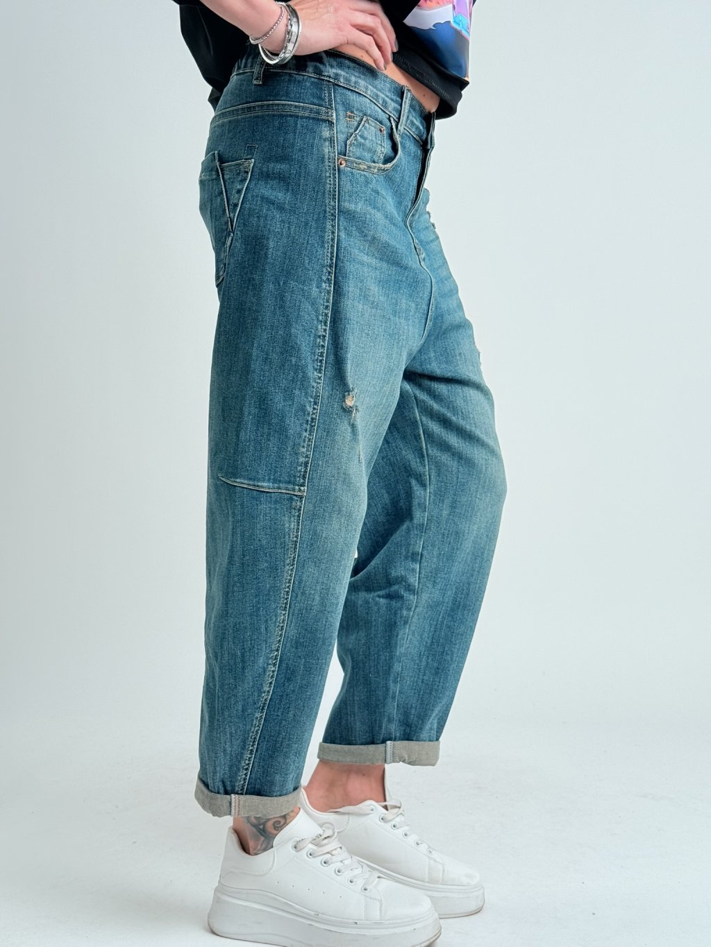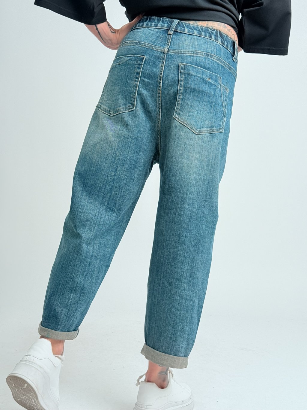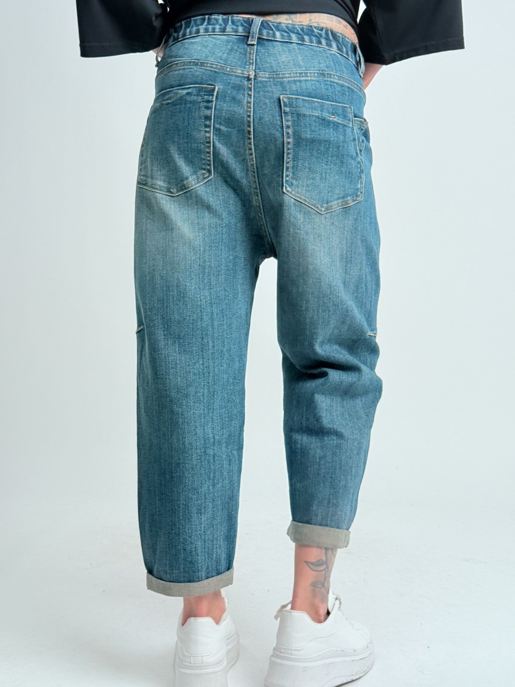 Skvěle padnoucí, boyfriend džíny s gumou v zadní části pasu a širšími nohavicemi v místě stehem, dolu se zužujícími. MĚŘTE!!!!