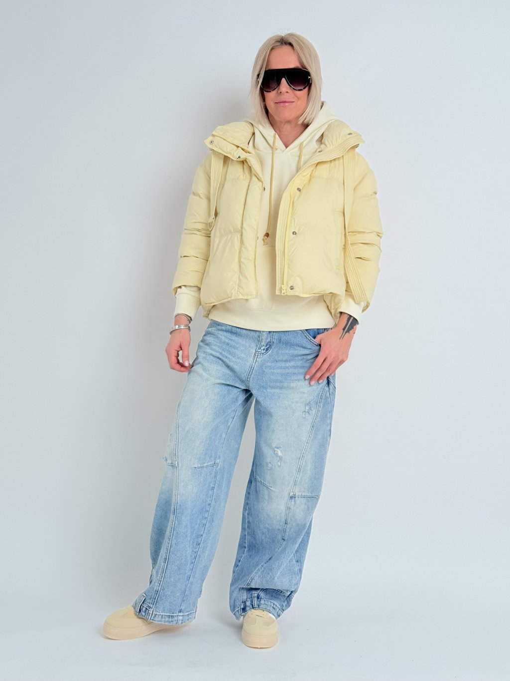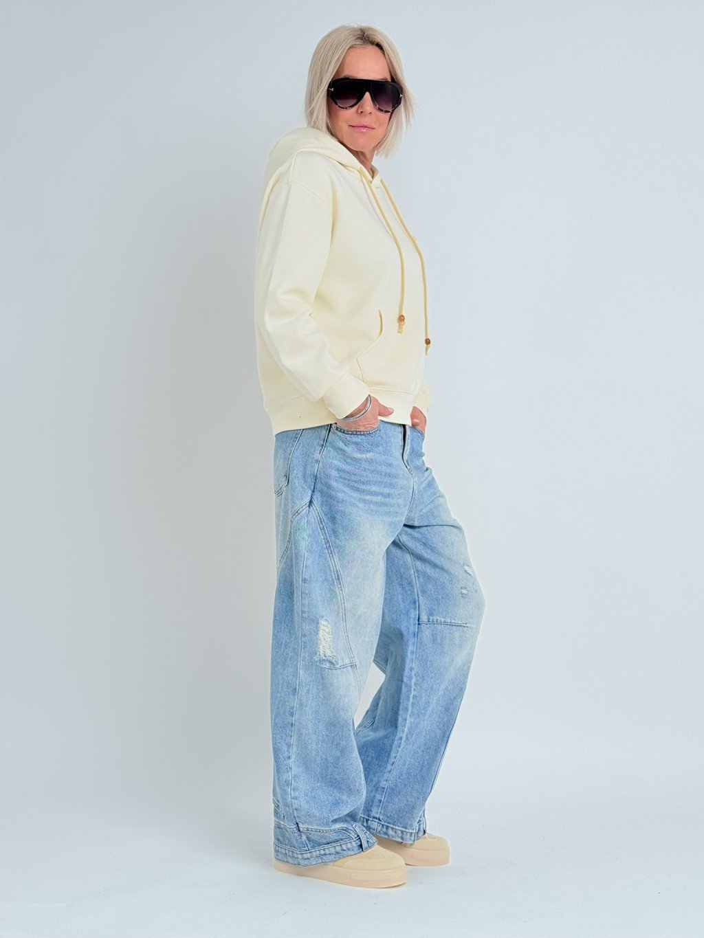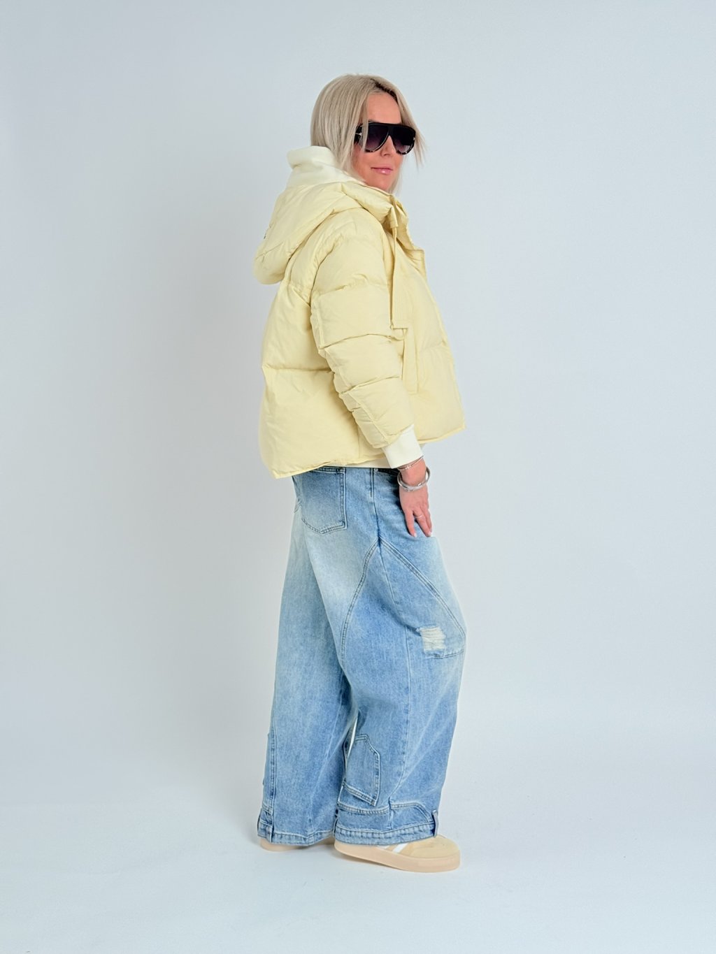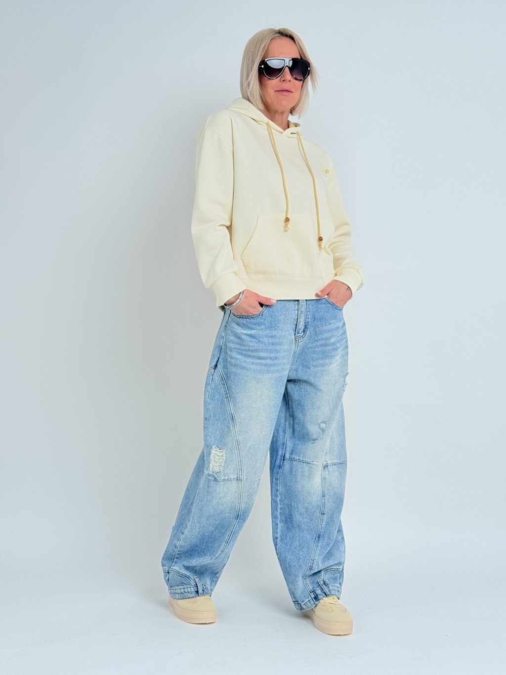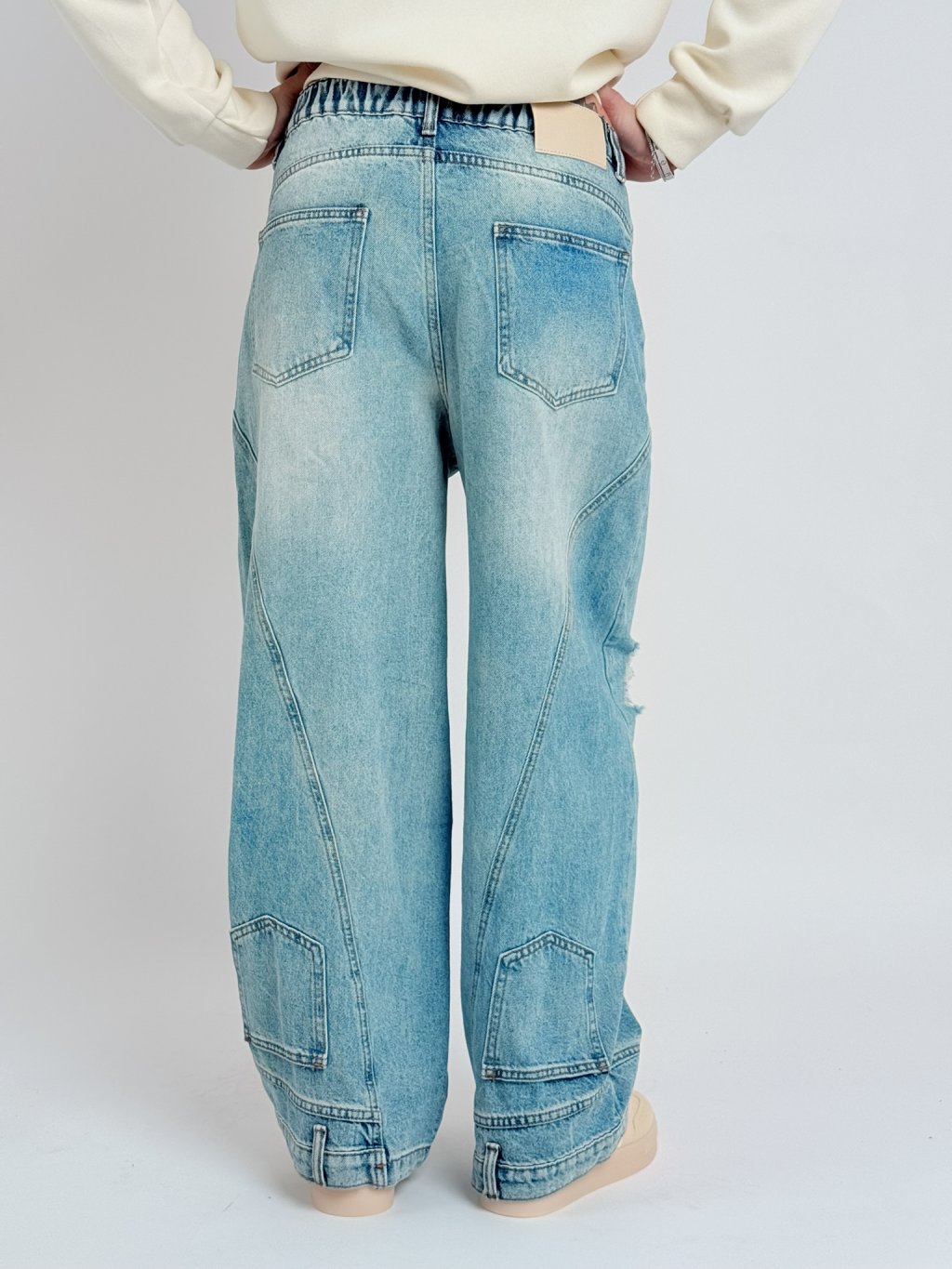 Skvěle padnoucí, širší džíny, v zadní části pasu do gumy. Dolní kraj nohavic zdobí kapsy a poutka.