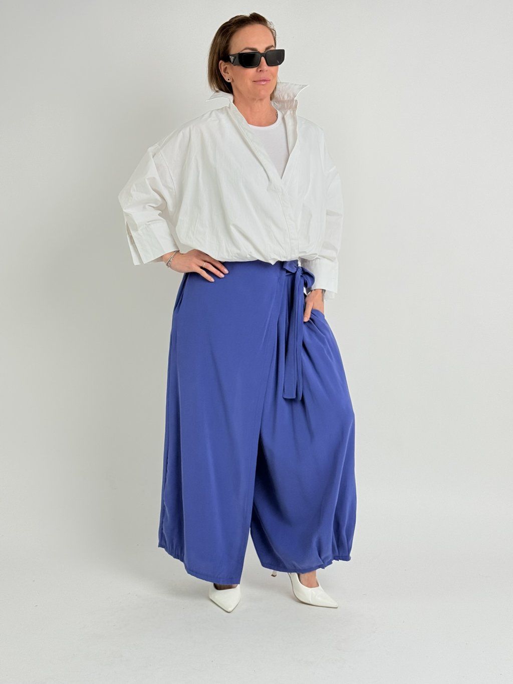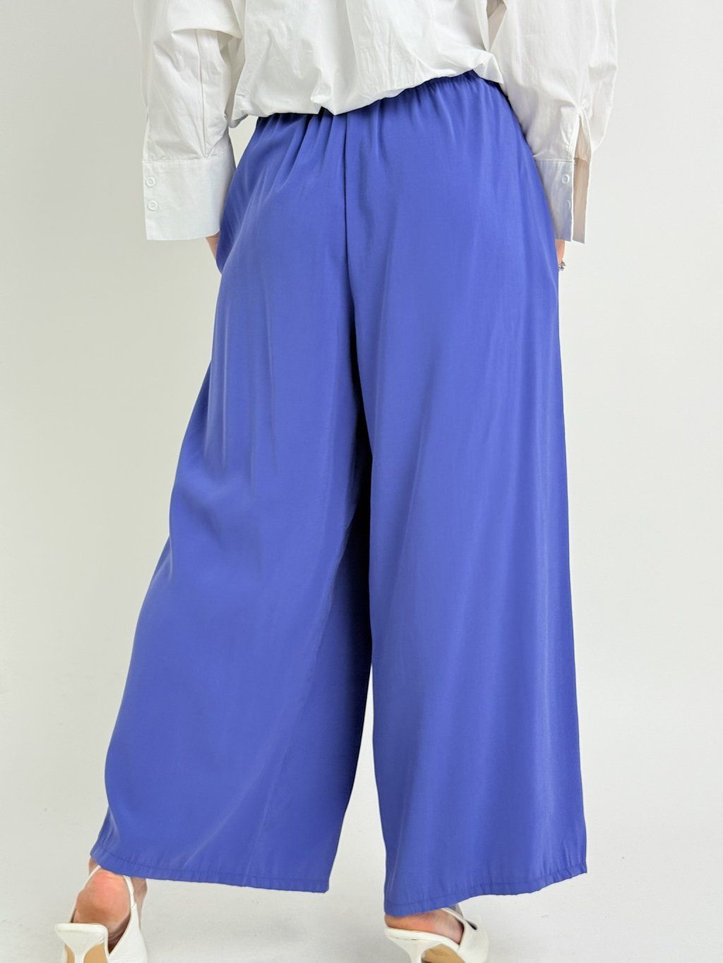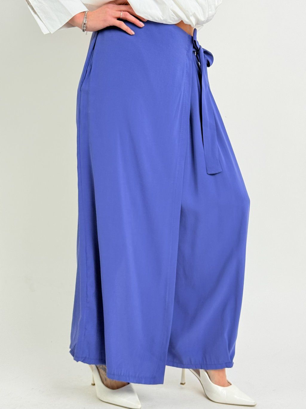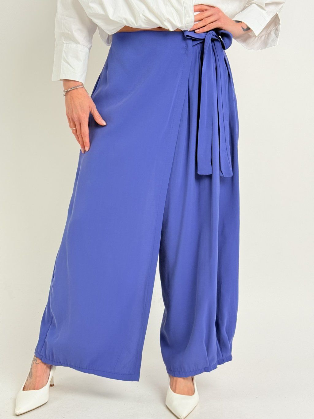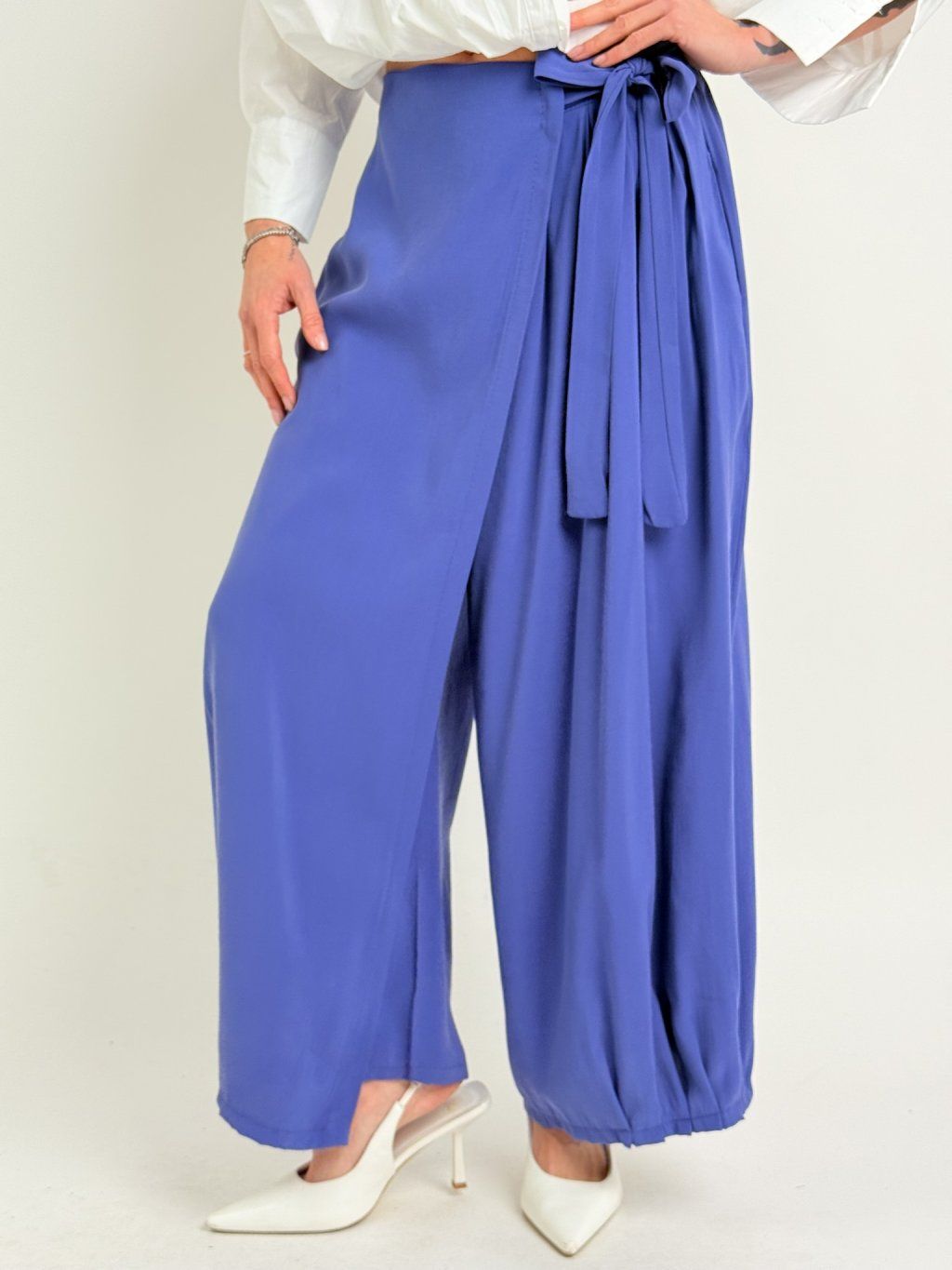 Zajímavé kalhoty se širšími nohavicemi, jedna zakončena sámky, přes druhou je překlad, který se v pase zavazuje na mašli. V zadní části pasu je guma.