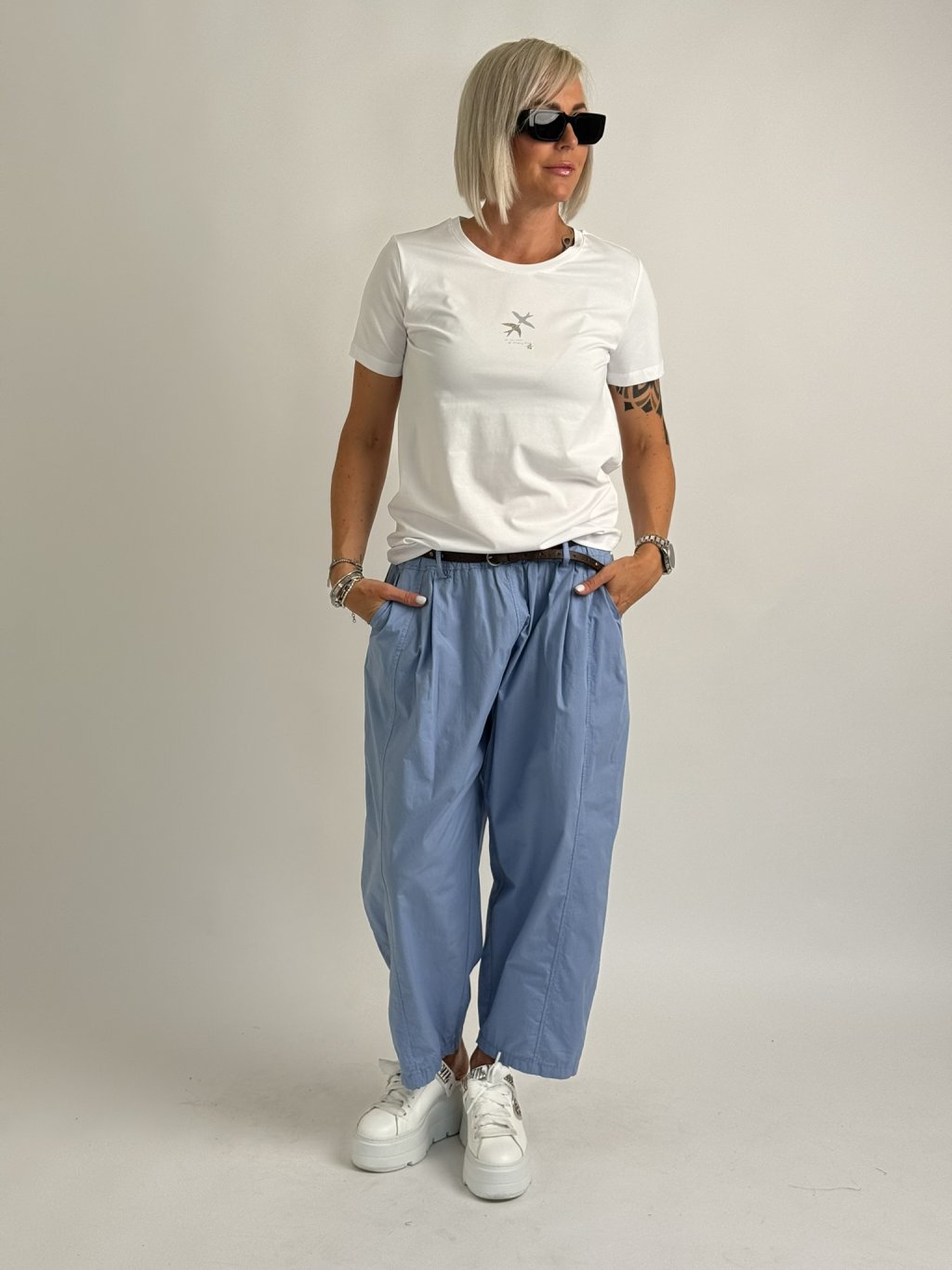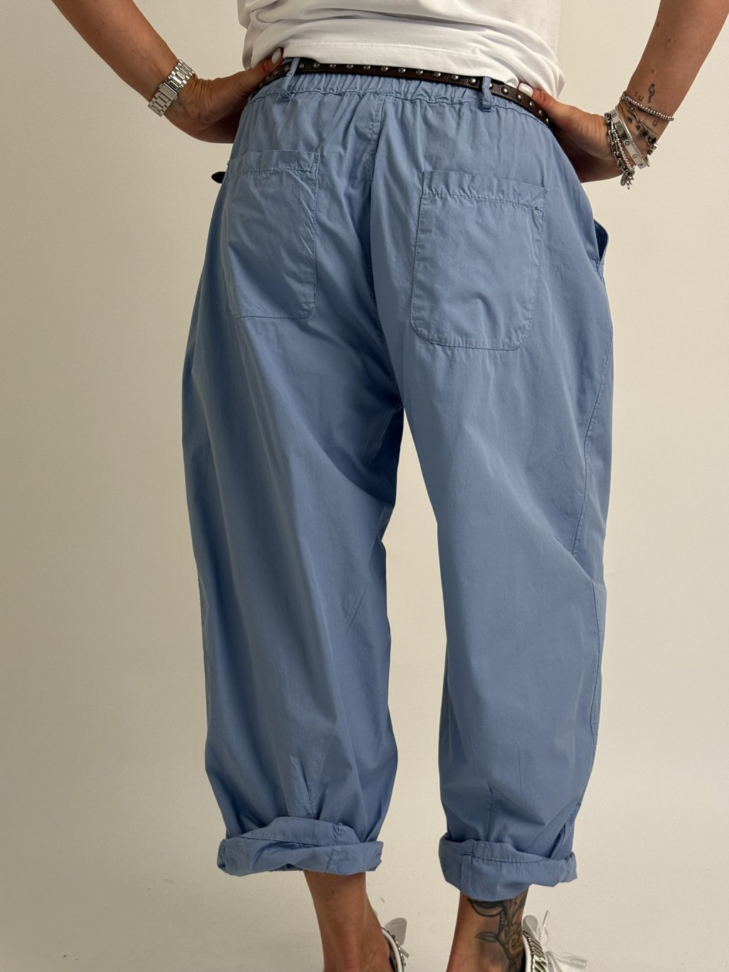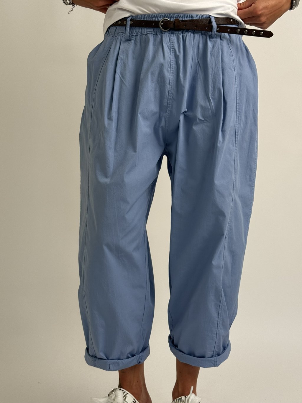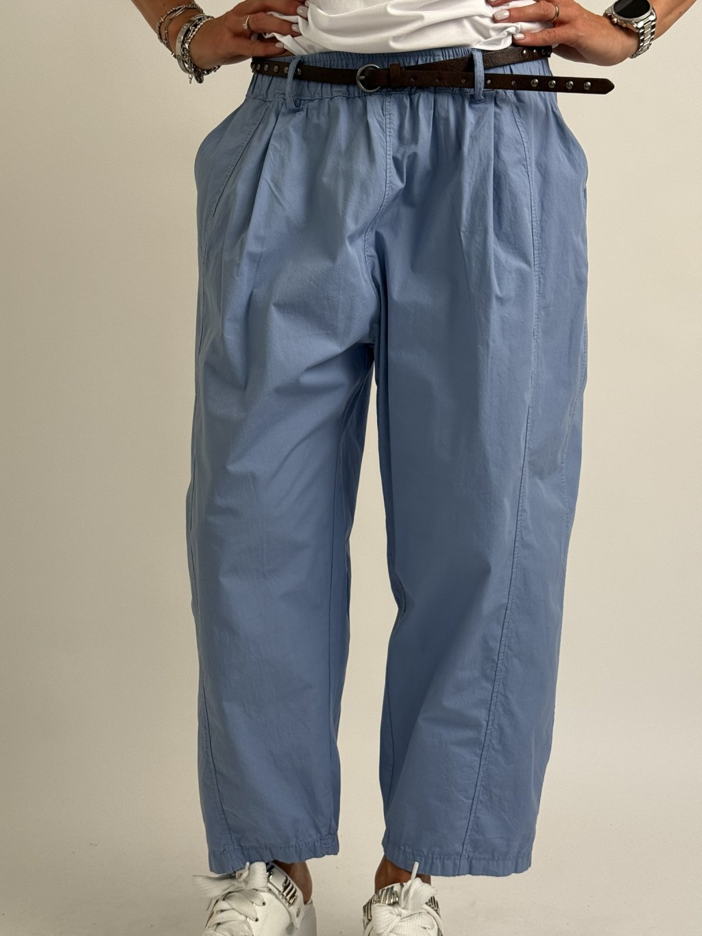 Super, lehké, boyfriend kalhoty s gumou a úzkým páskem v pase.
