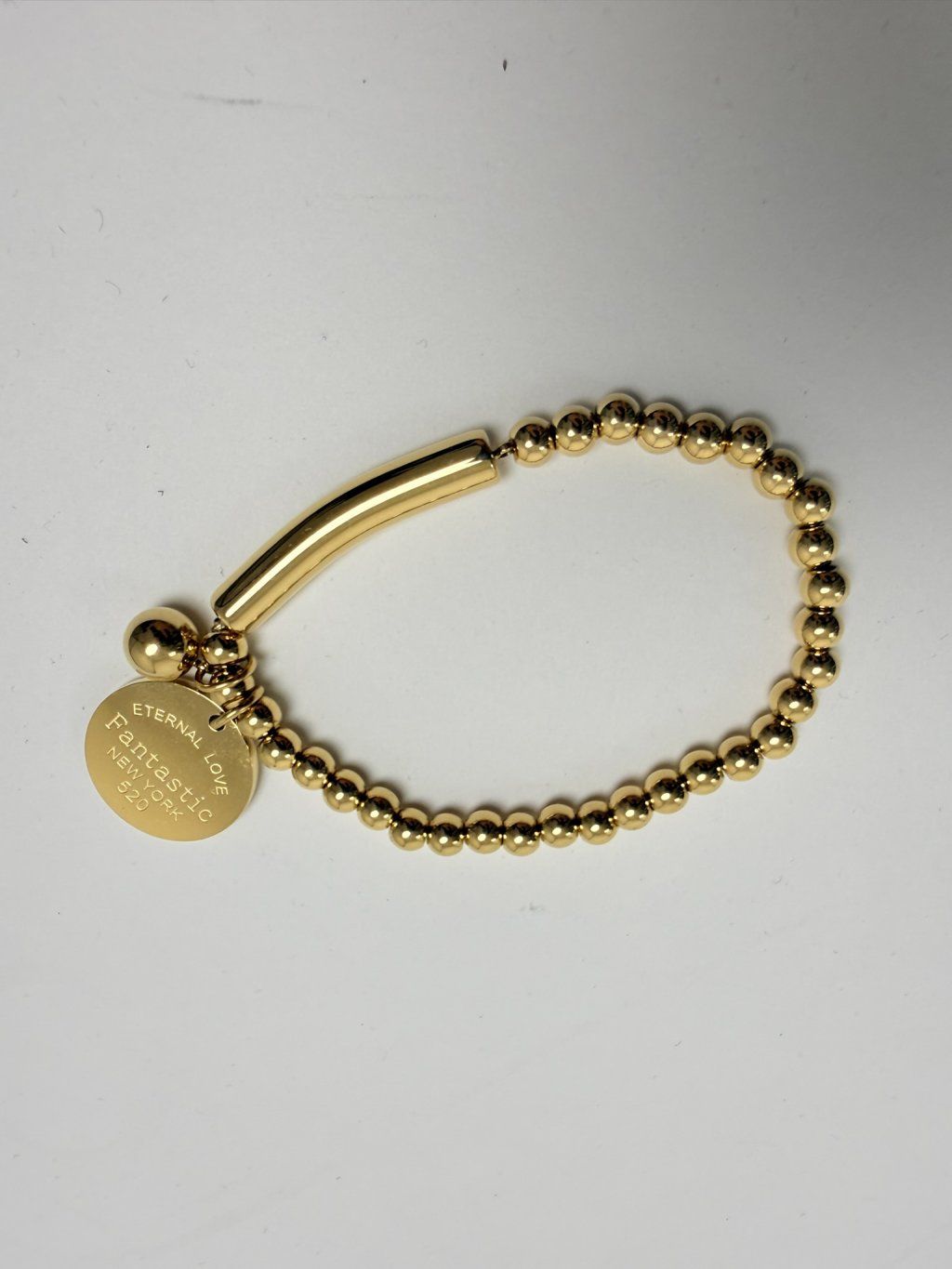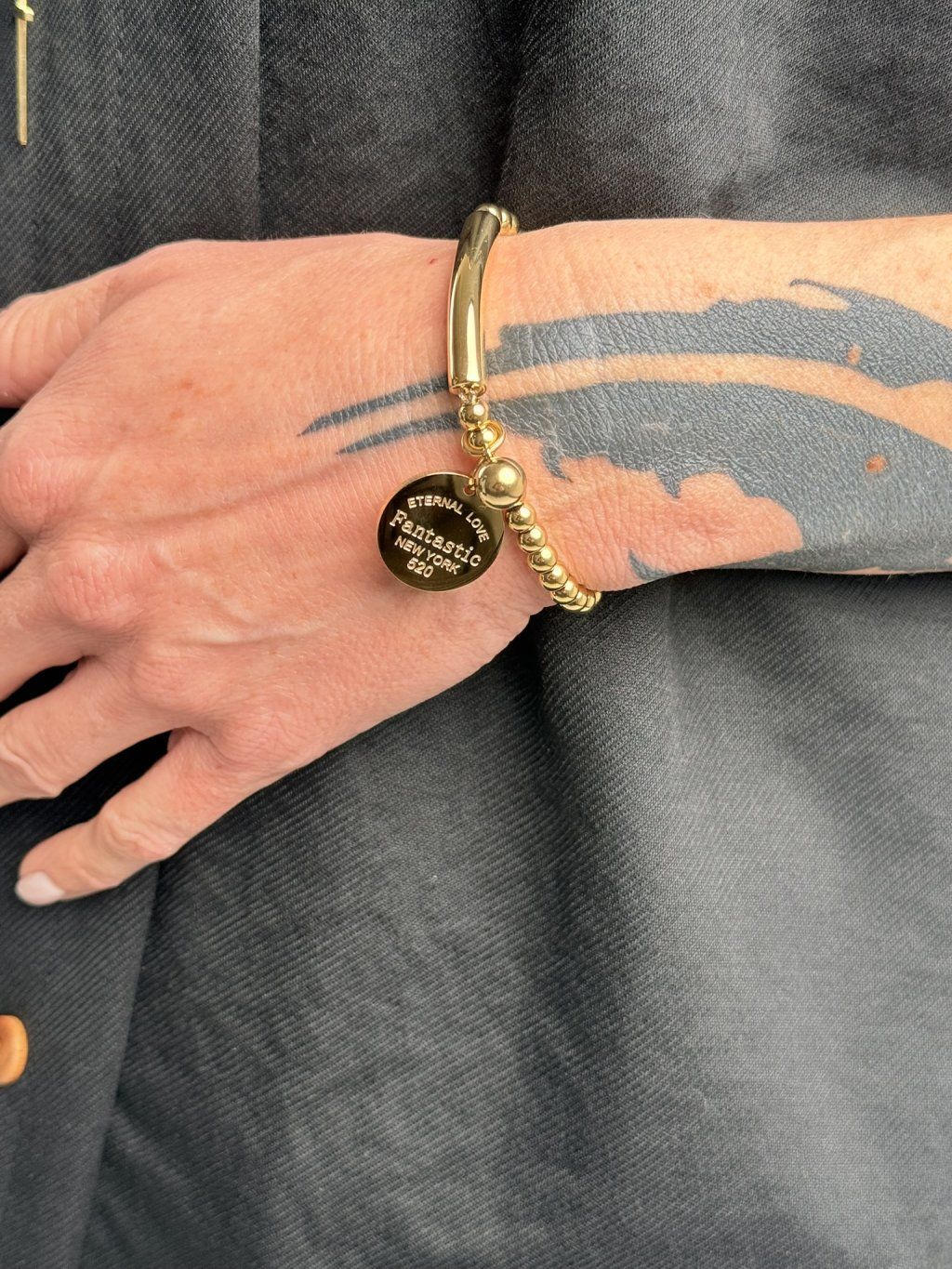 Pružný náramek ve zlaté barvě, s přívěskem.