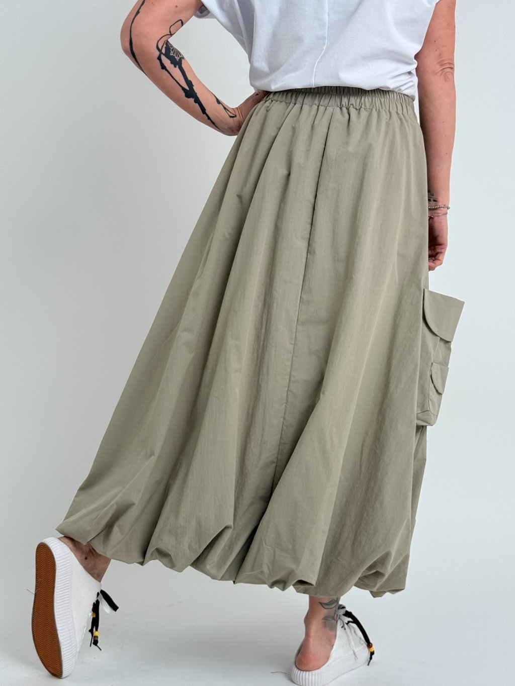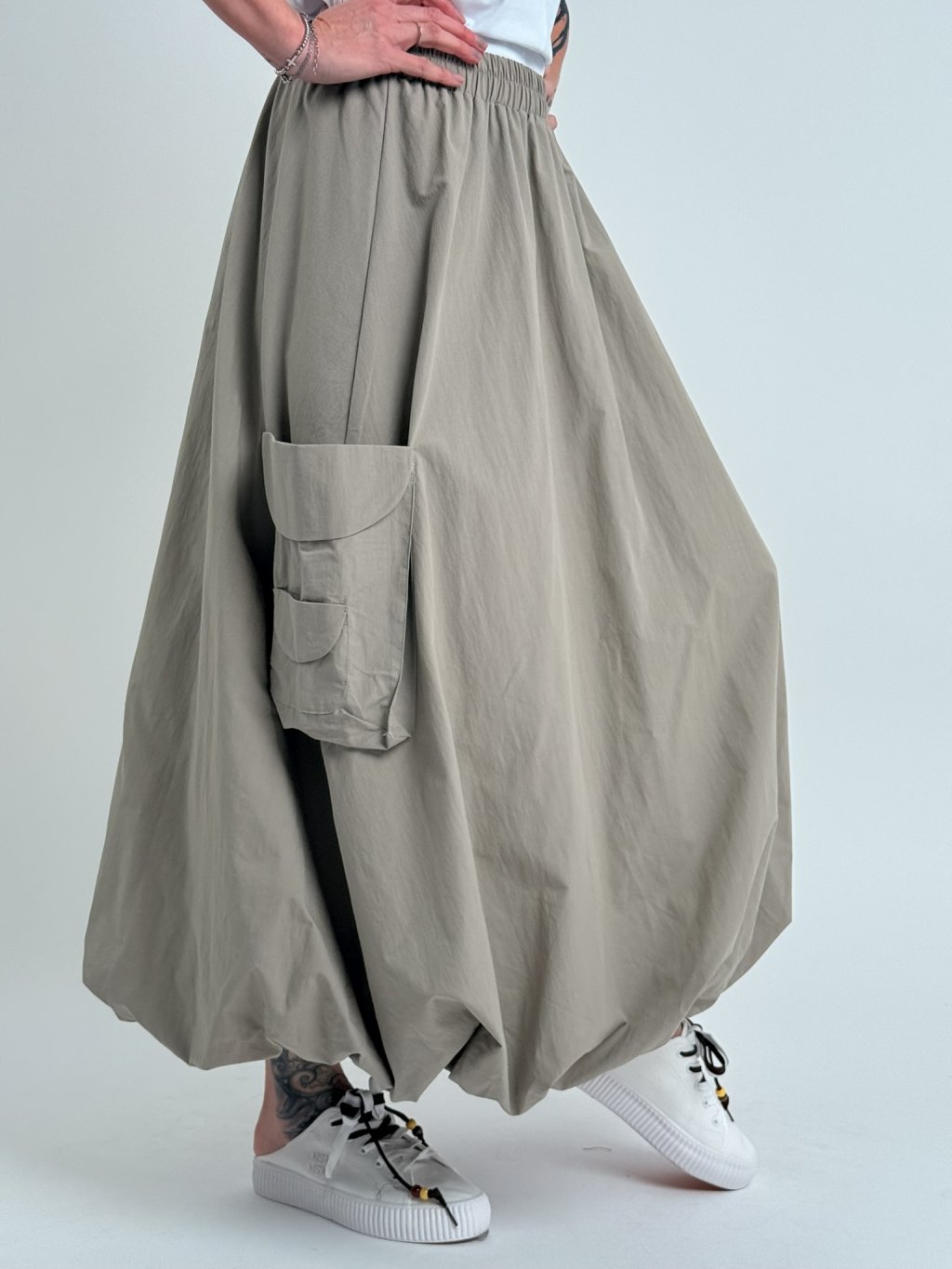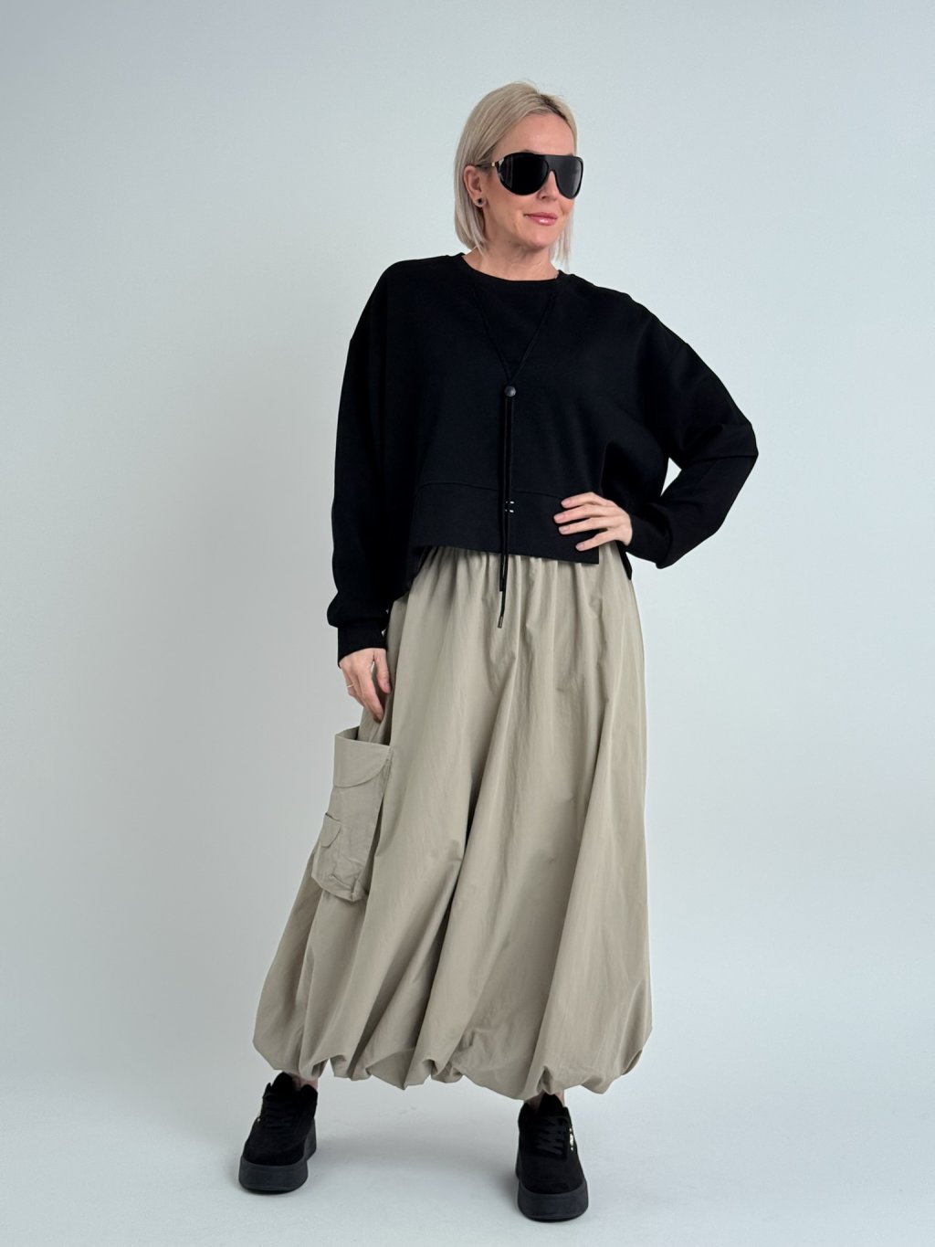 Dvojitá, balonová sukně v pase do gumy, s našitou, větší kapsou na jedné straně..