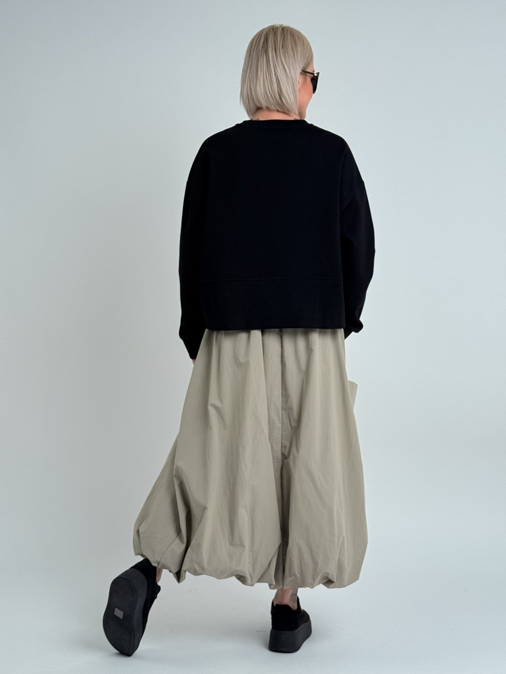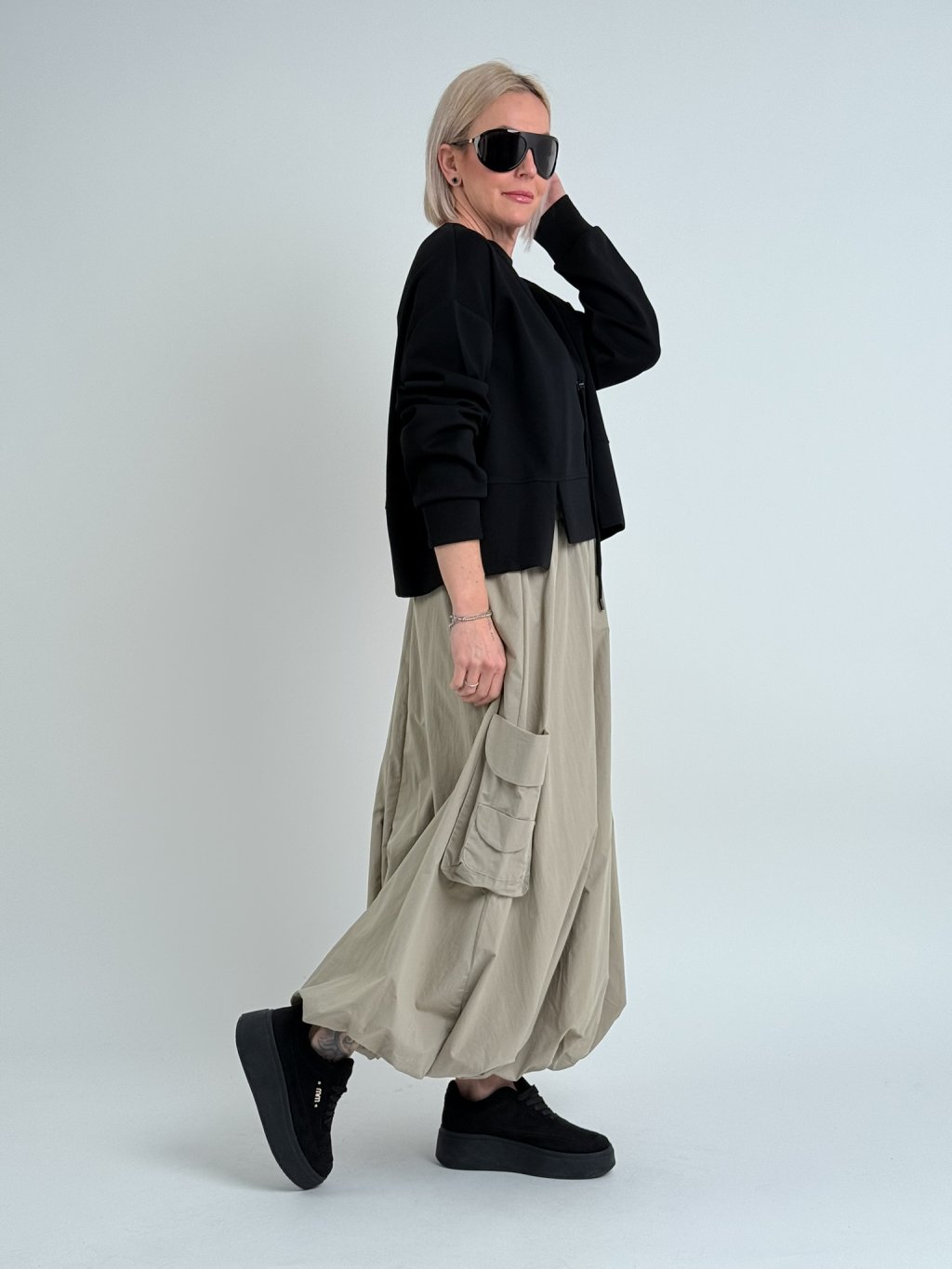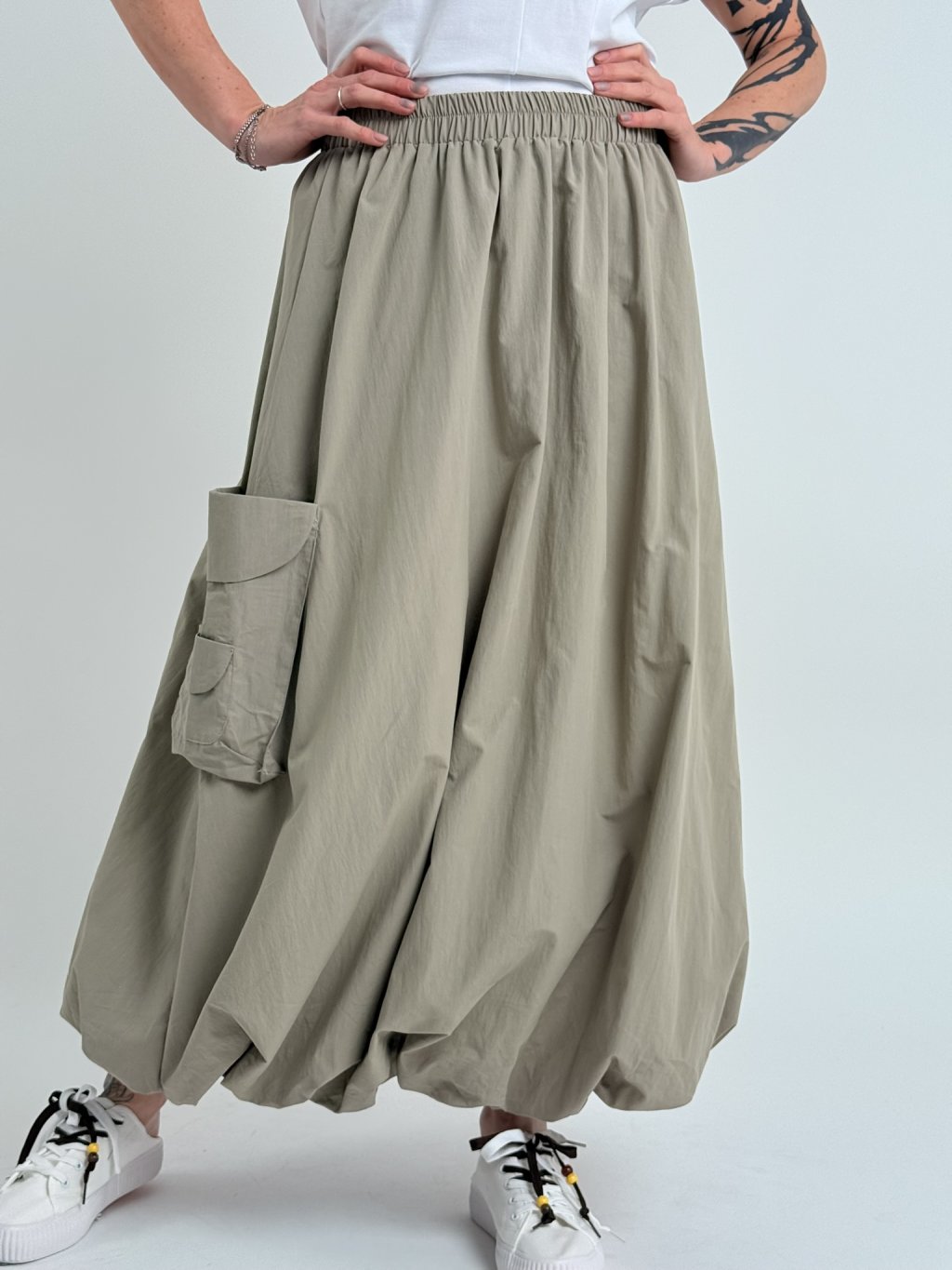 Dvojitá, balonová sukně v pase do gumy, s našitou, větší kapsou na jedné straně..