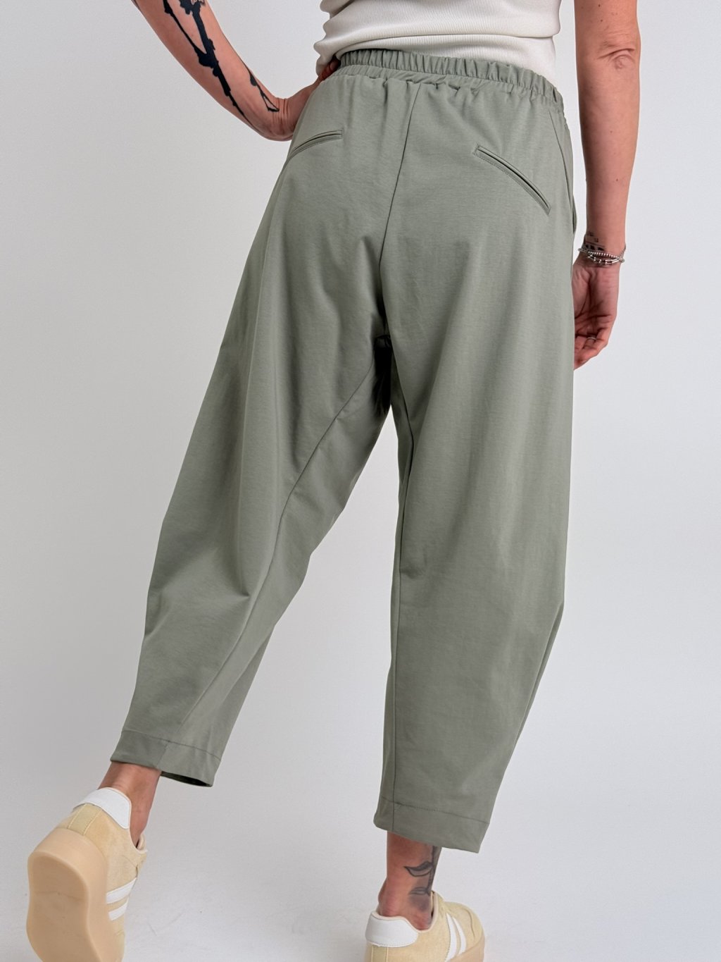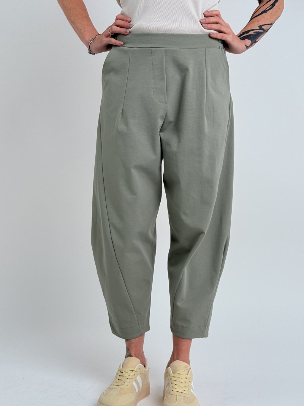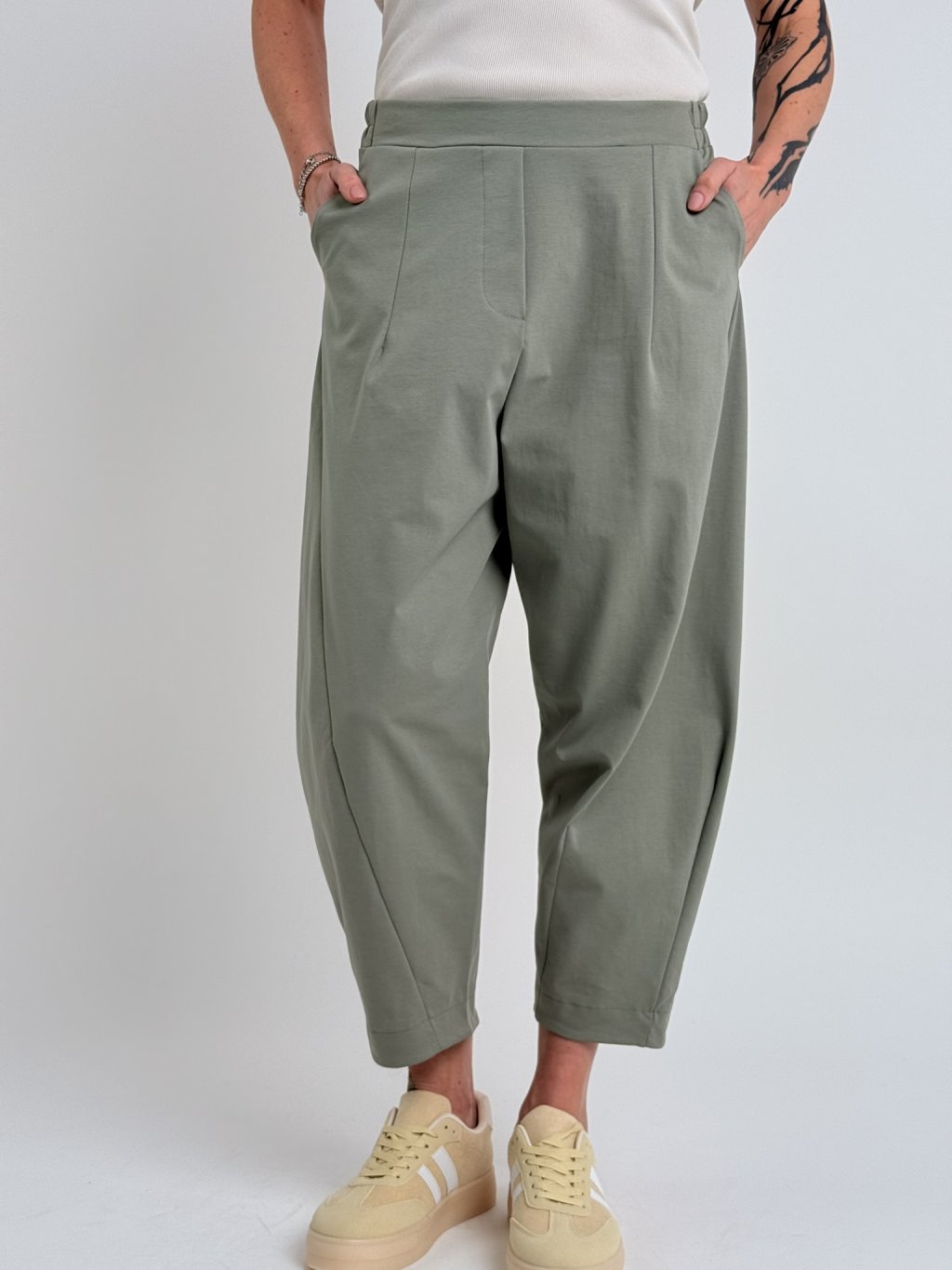 Luxusní kalhoty s gumou v pase, širšími nohavicemi v horní části, dolu se zužujícími. Super střih i materiál.