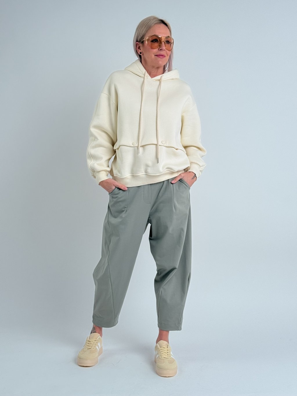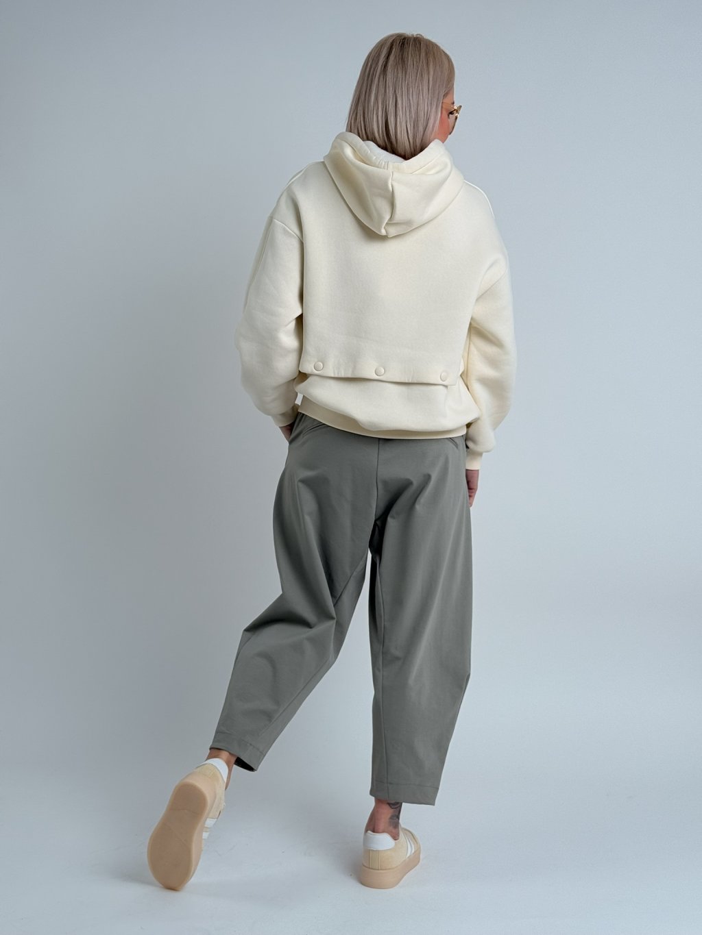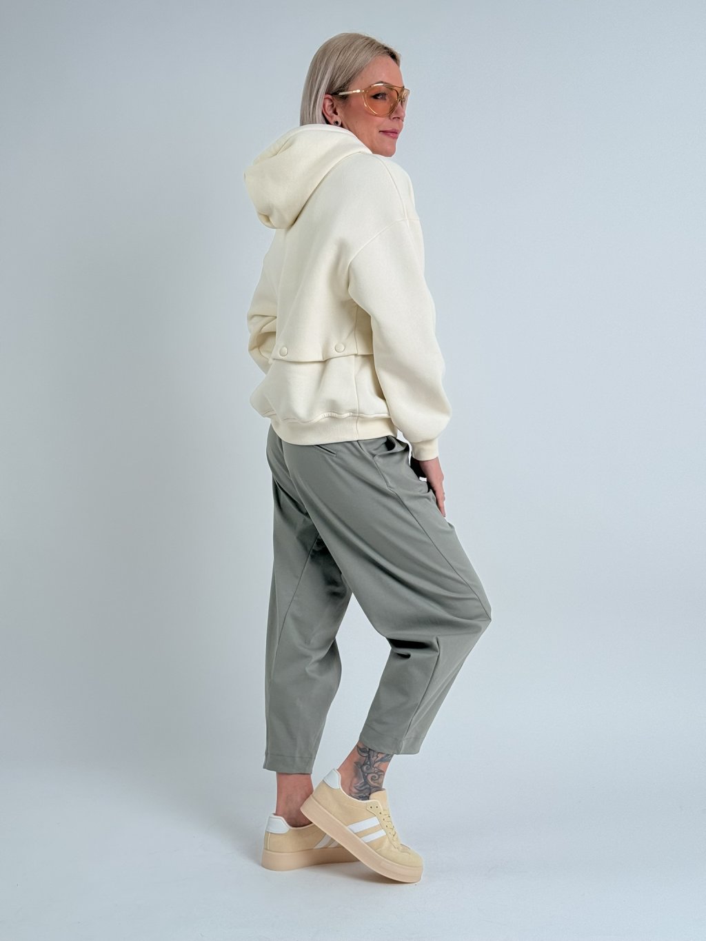 Luxusní kalhoty s gumou v pase, širšími nohavicemi v horní části, dolu se zužujícími. Super střih i materiál.