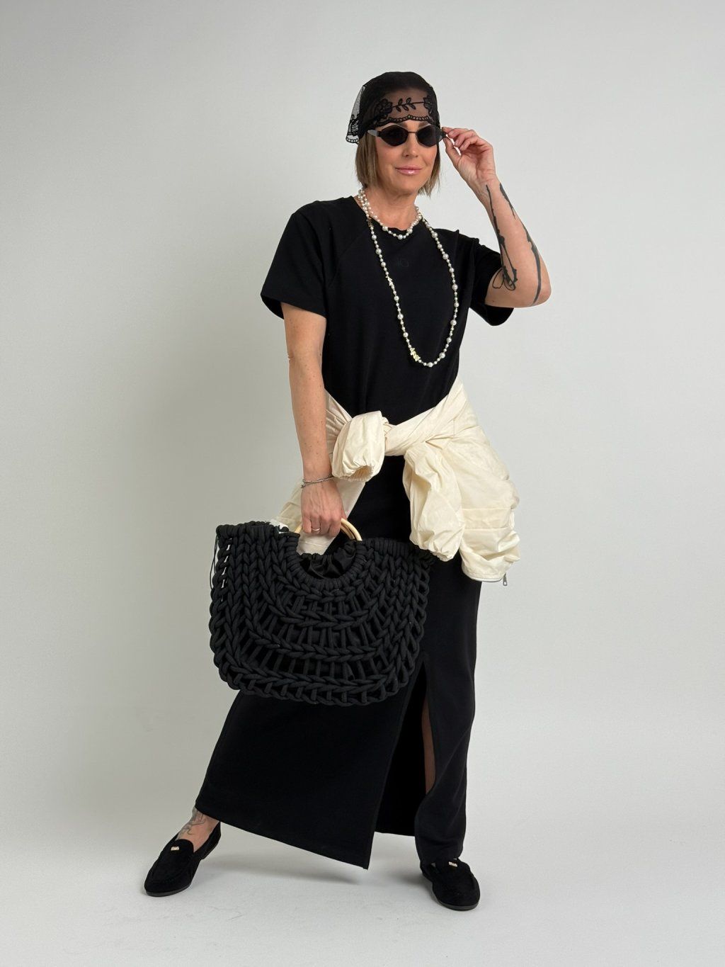 Perlový náhrdelník v kombinaci s kovem ve zlaté barvě a písmeny z jedné strany v černé a z druhé v bílé barvě.