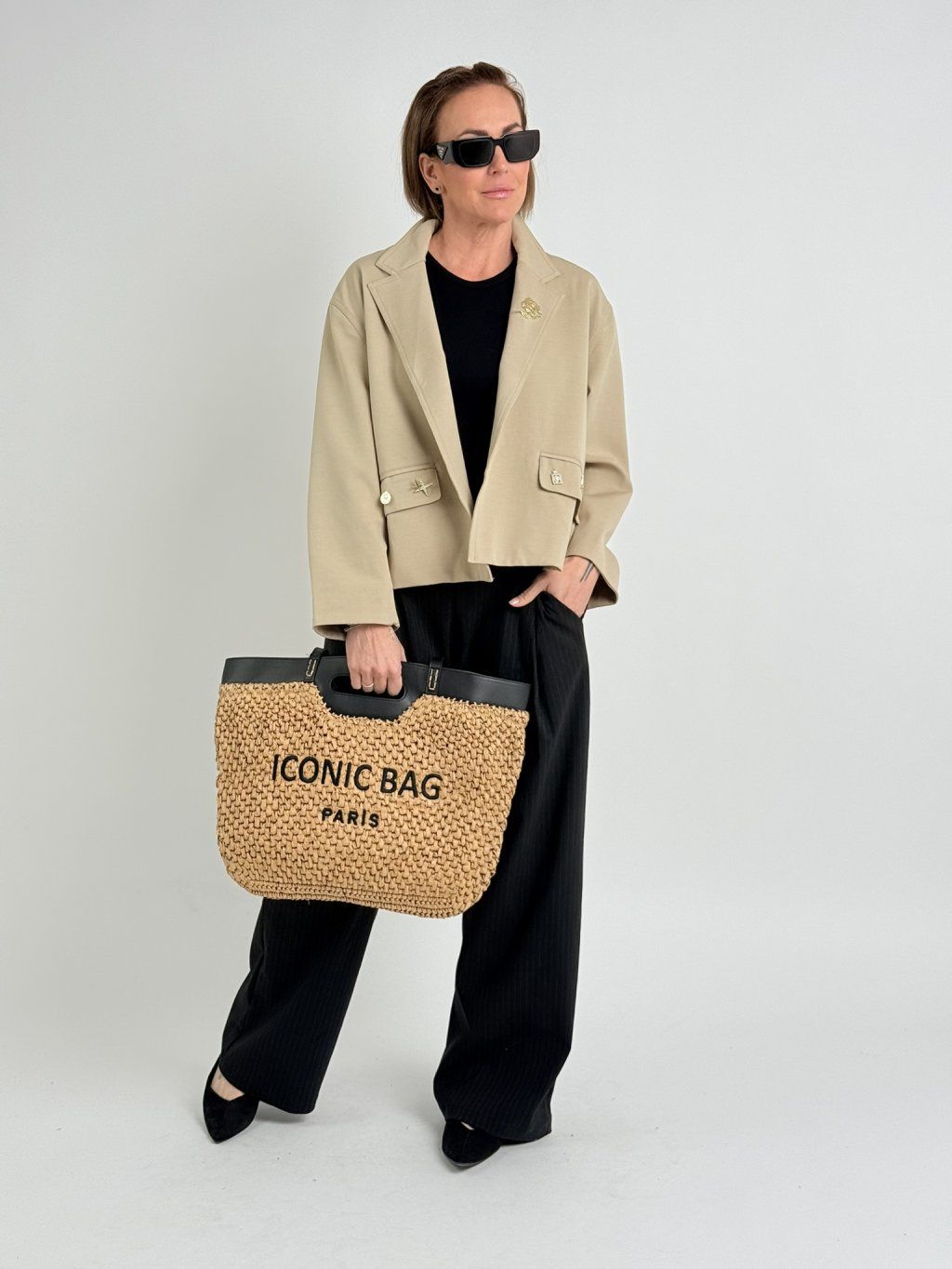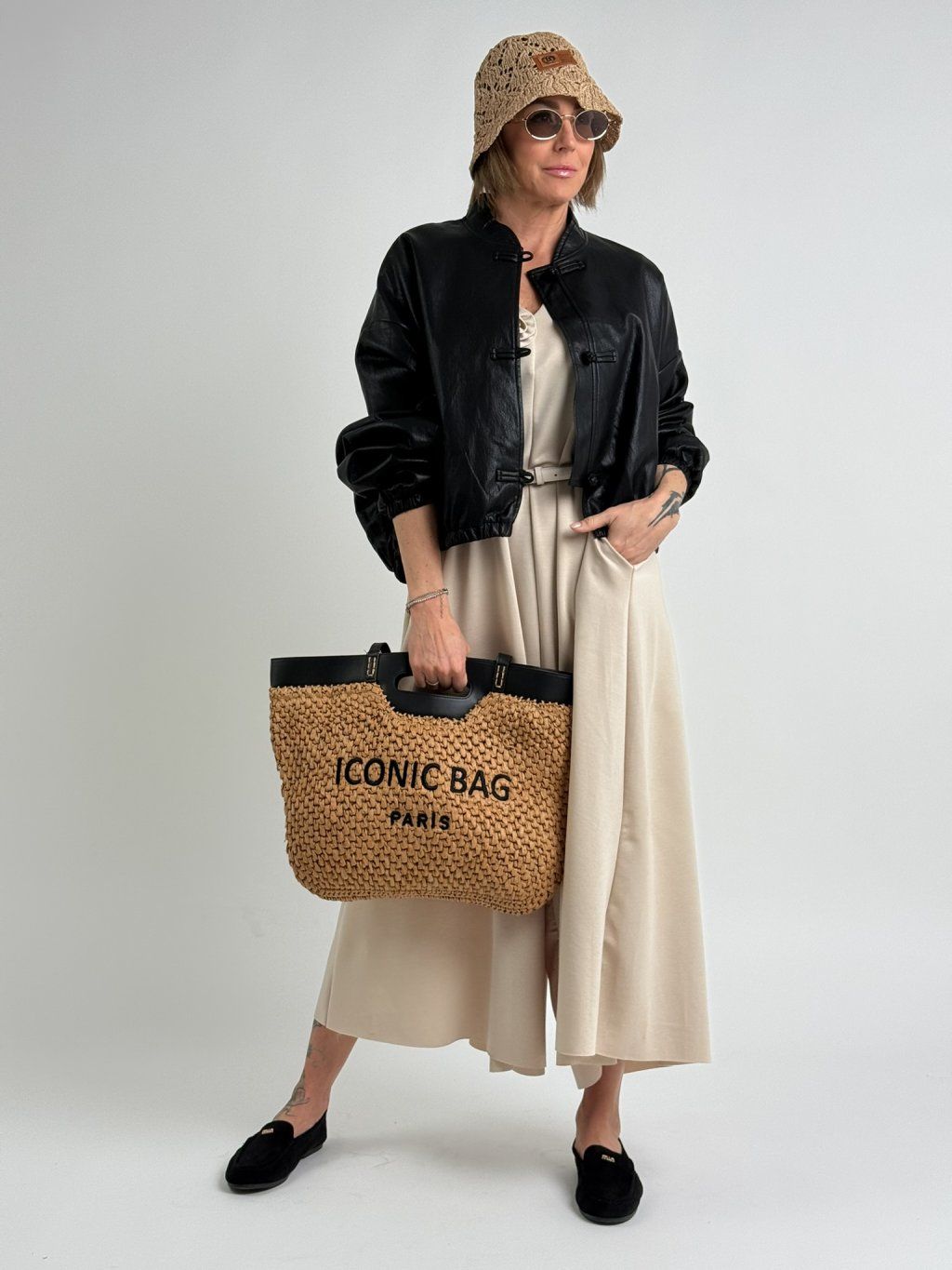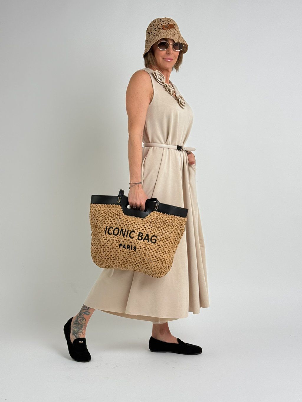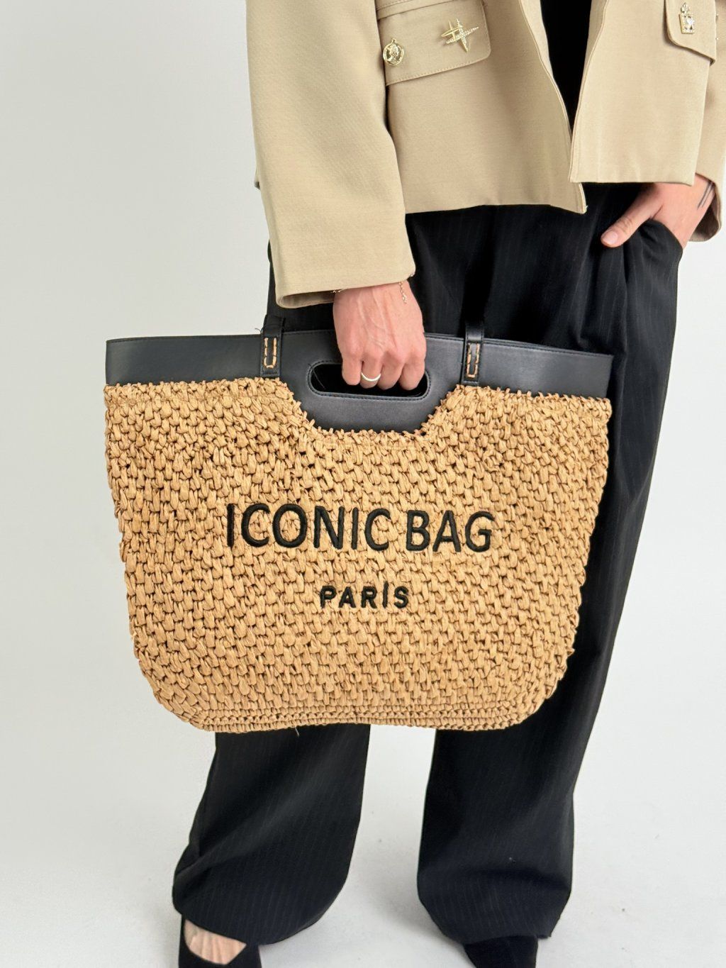 Větší, přírodní kabela kombinovaná s černou koženkou, se zapínáním na zip a delšími uchy, na přední straně s černým nápisem.
