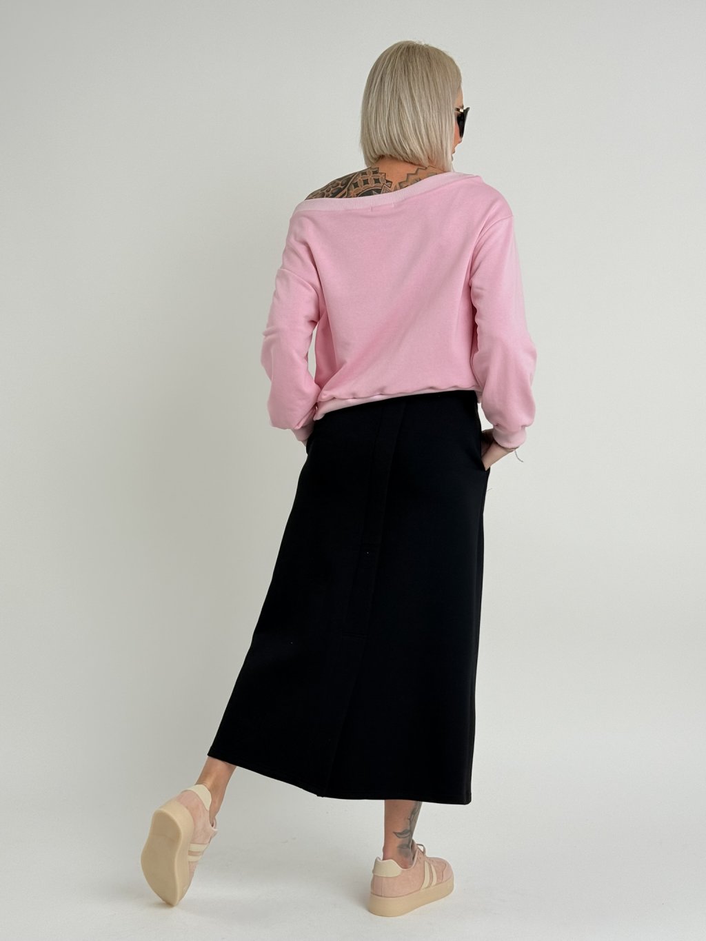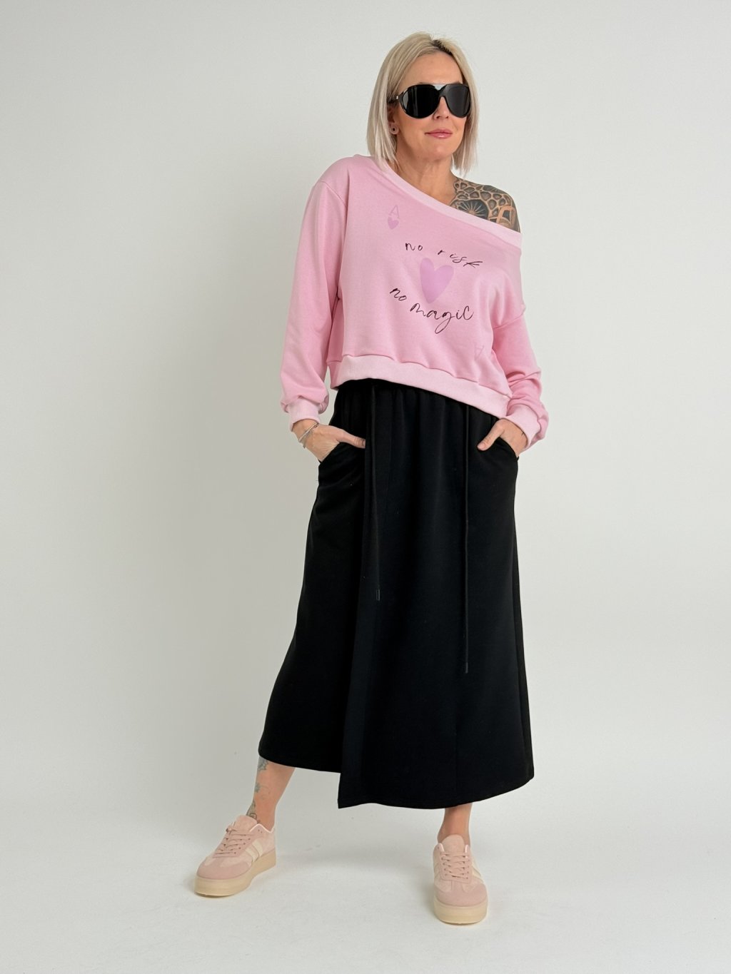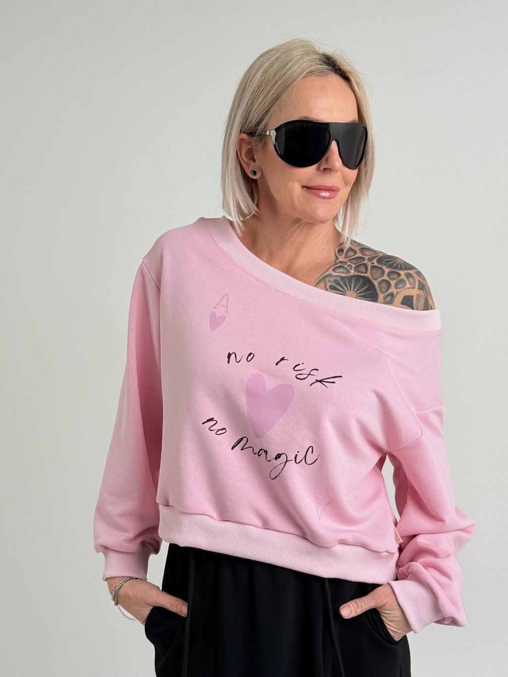 Krátká mikina s lodičkovým výstřihem s nápletem, který lemuje i rukávy a dolní kraj mikiny. Na předním dílu je jemný nápis.