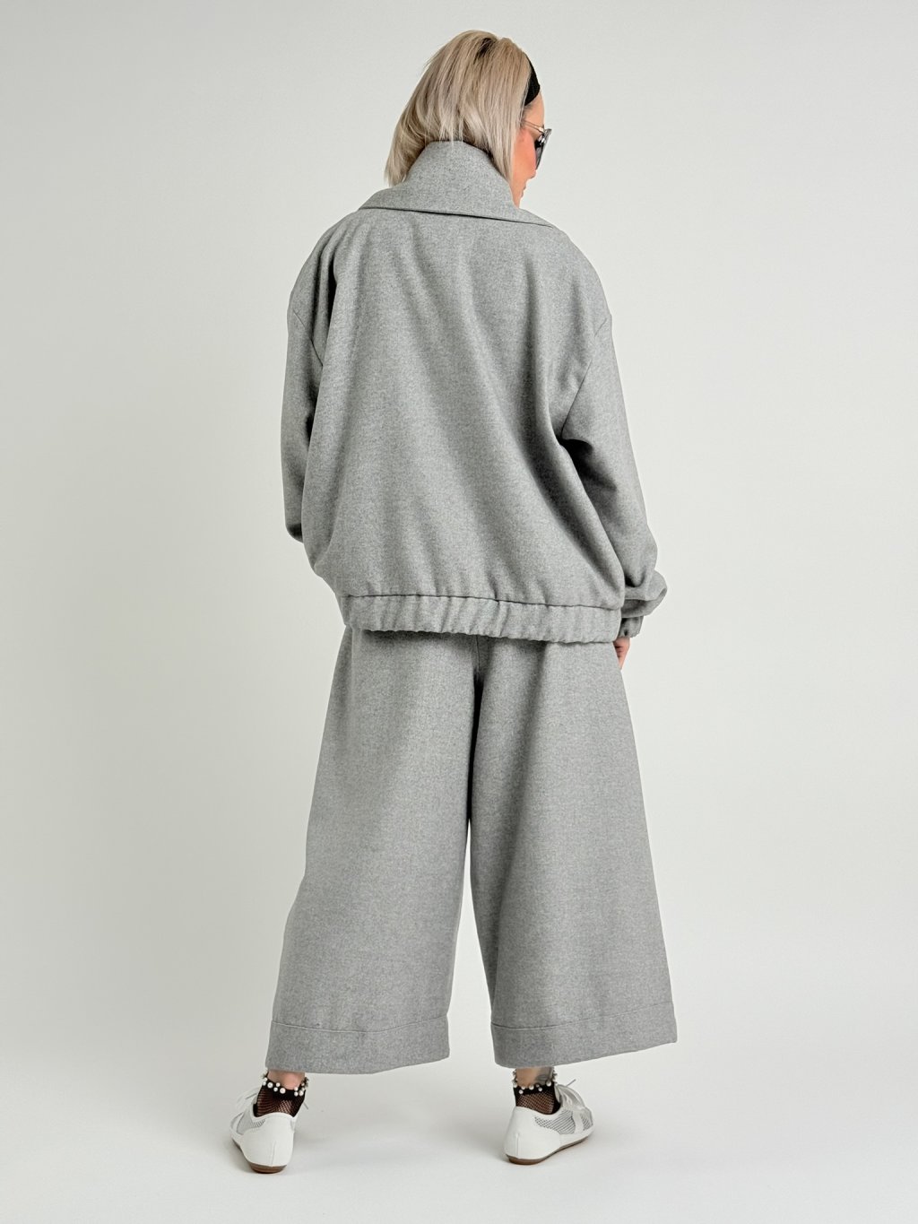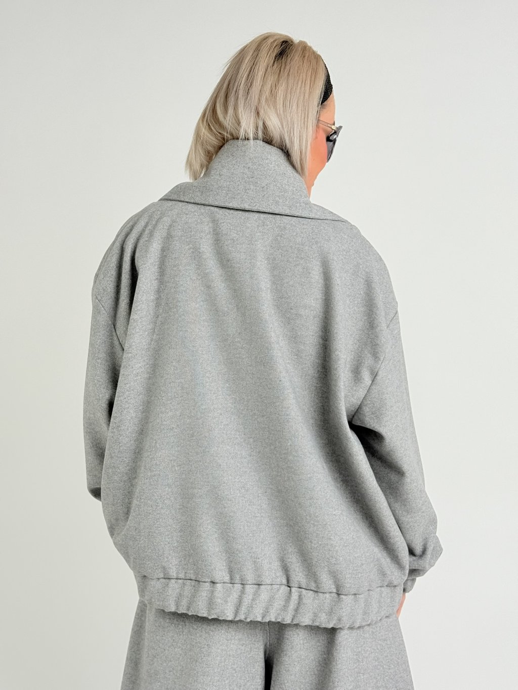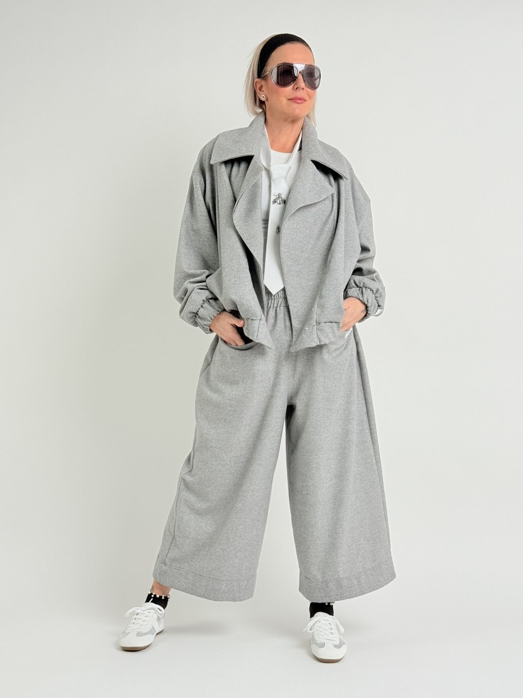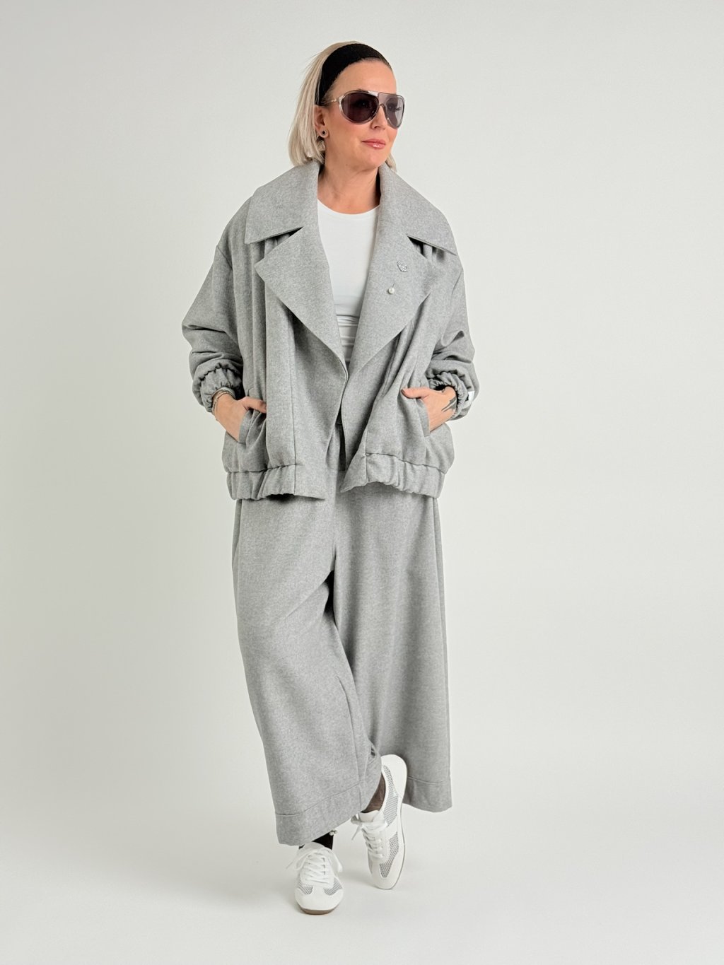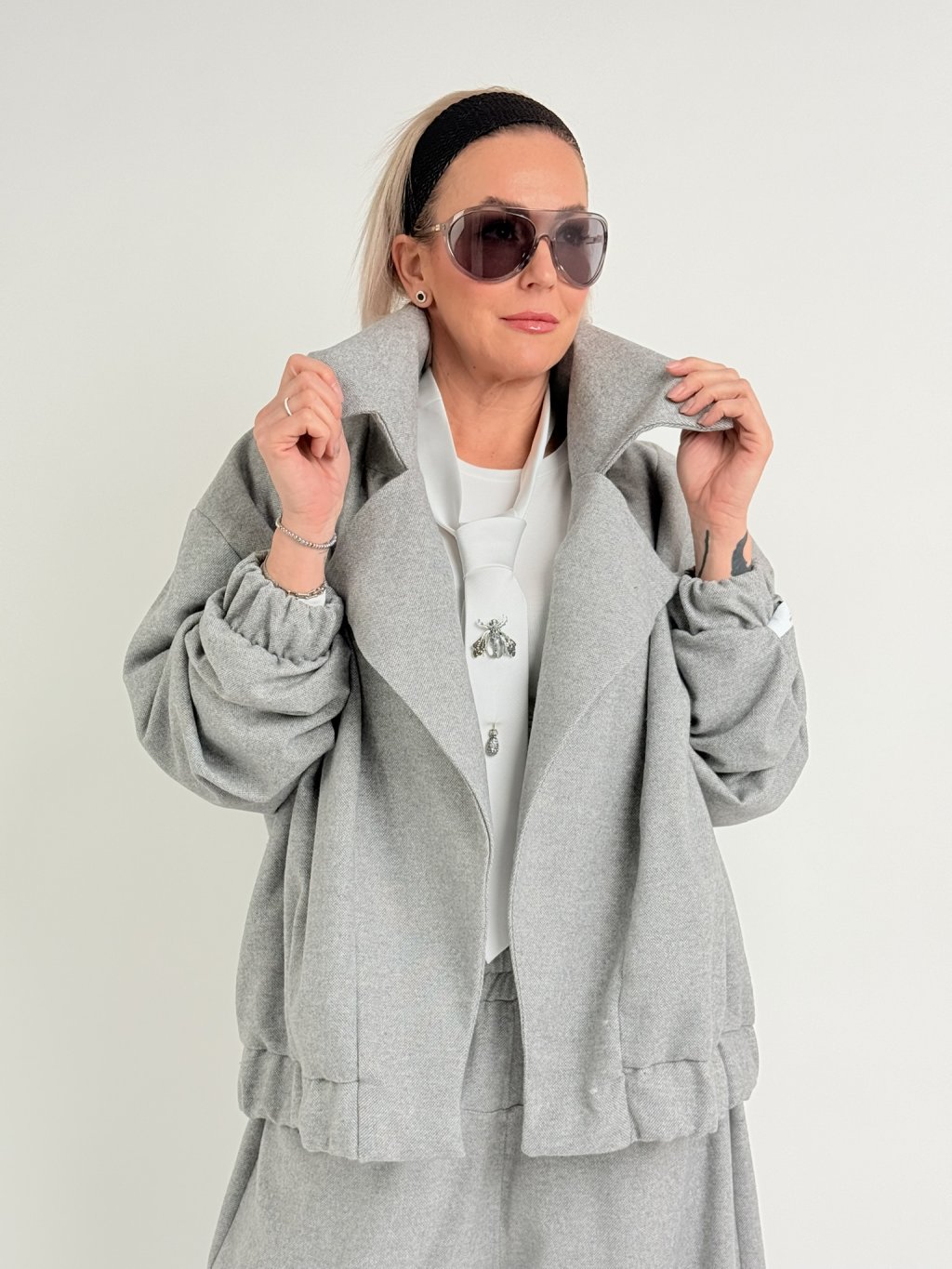 Luxusní bunda s podšívkou, velkými klopami, bez zapínání, s gumou v dolní části i u rukávů a postranními, všitými kapsami. Komplet s kalhotami THESE.