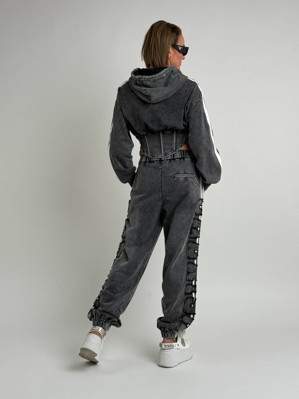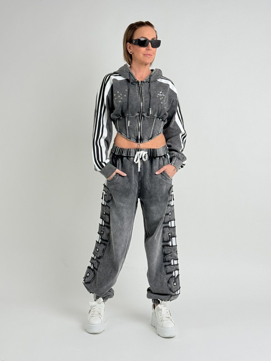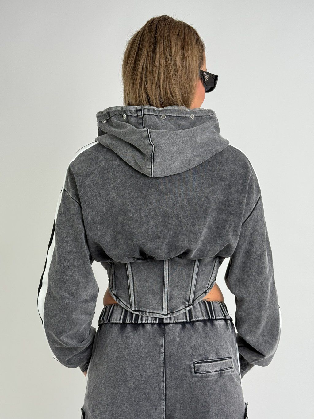Šedá mikina v délce do pasu, se zapínáním na zip, s vykrojenými boky,  dlouhým rukávem a kapucí, která je zdobena , stejně jako přední díl, kovovými cvočky.