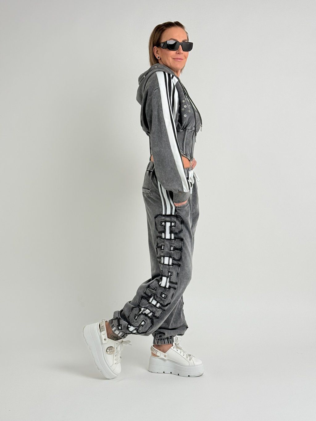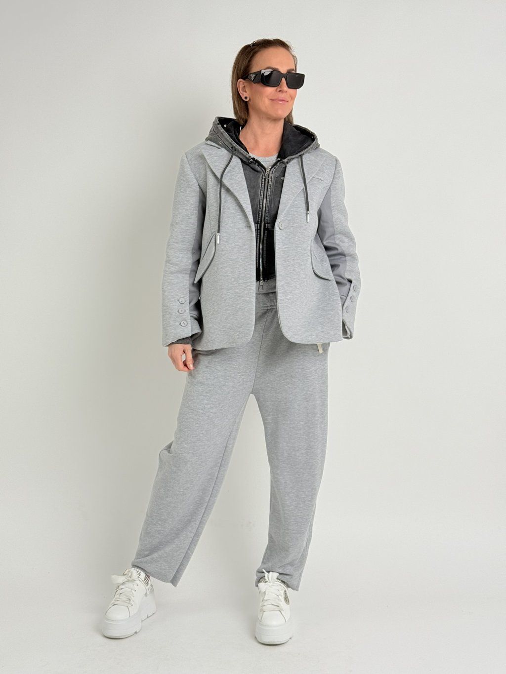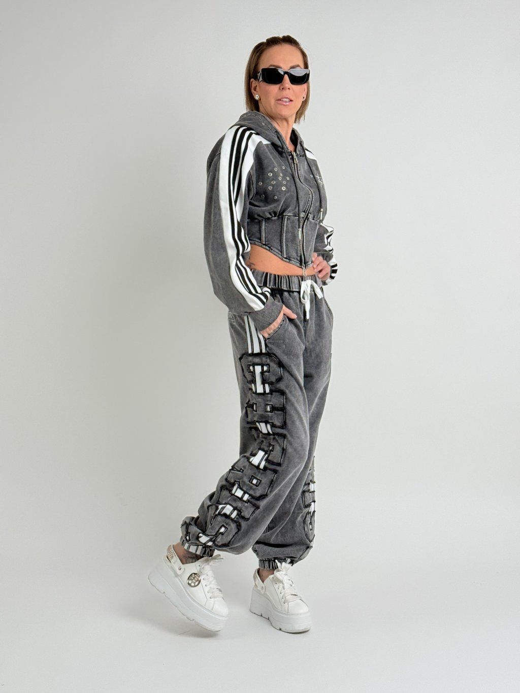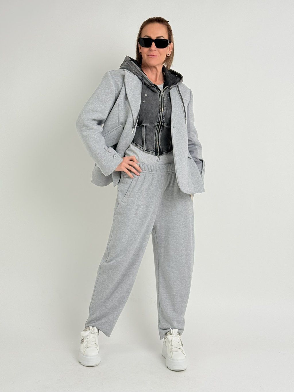 Šedá mikina v délce do pasu, se zapínáním na zip, s vykrojenými boky,  dlouhým rukávem a kapucí, která je zdobena , stejně jako přední díl, kovovými cvočky.