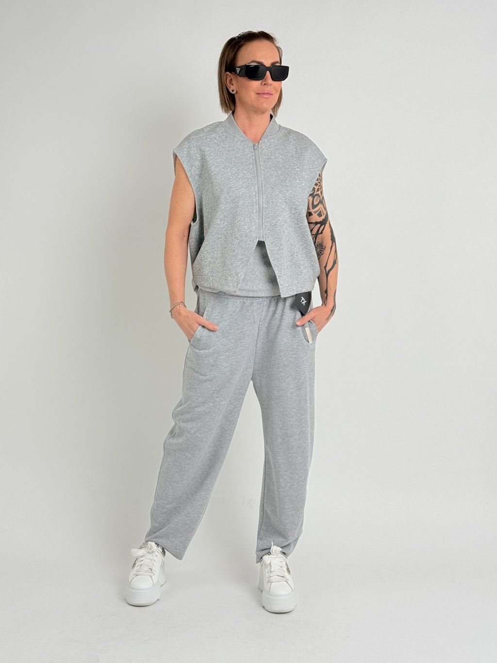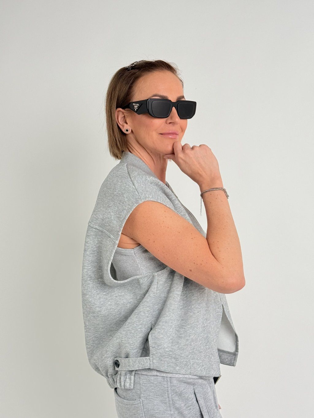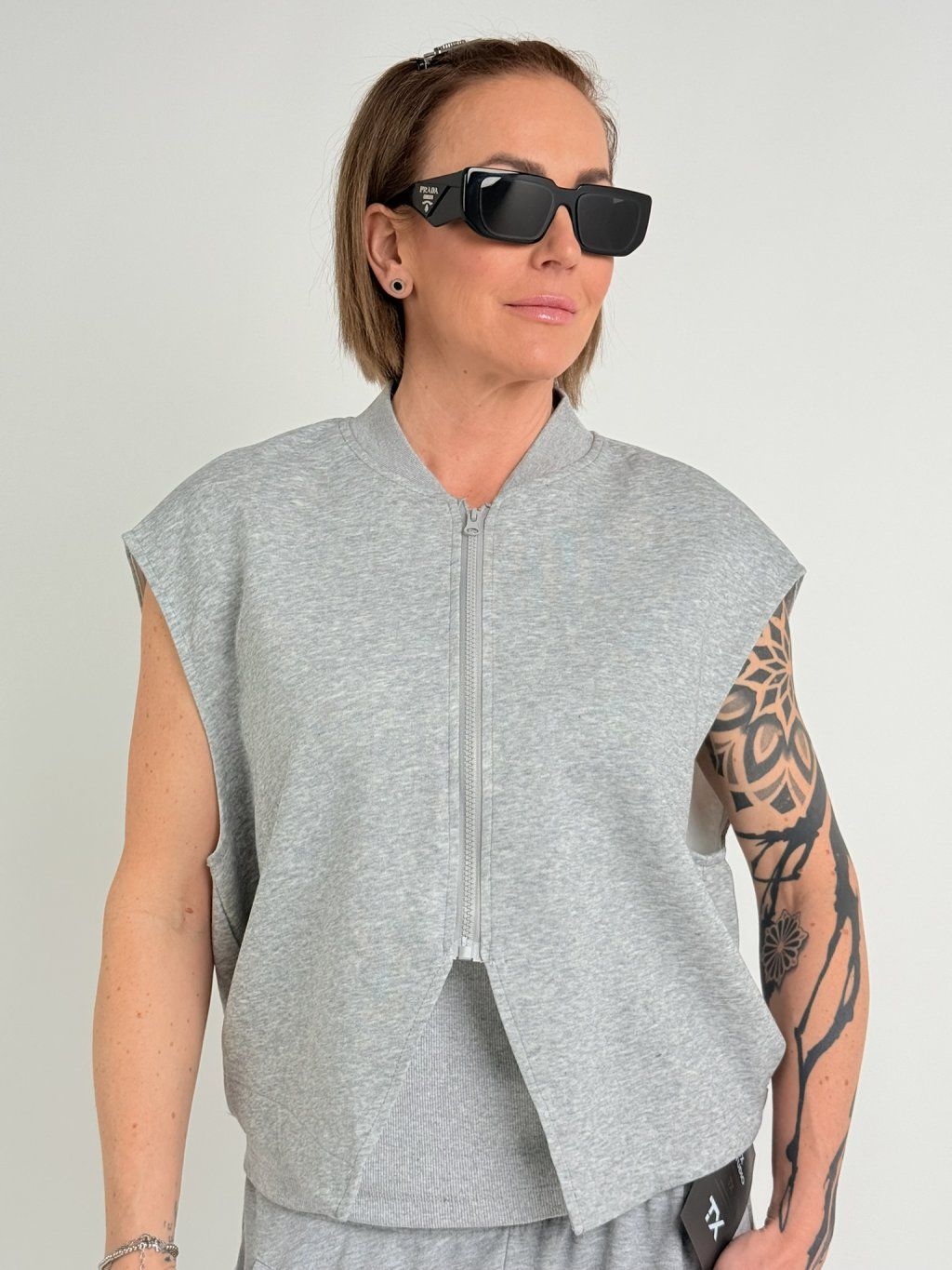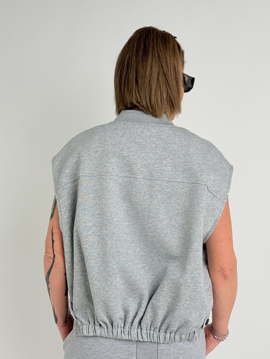 Mikinová vesta s většími průramky, se zapínáním na zip, dolní, zadní okraj do gumy, na bocích rozparky s páskem, který se zapíná na knoflík.
