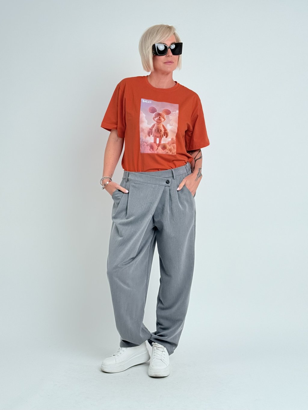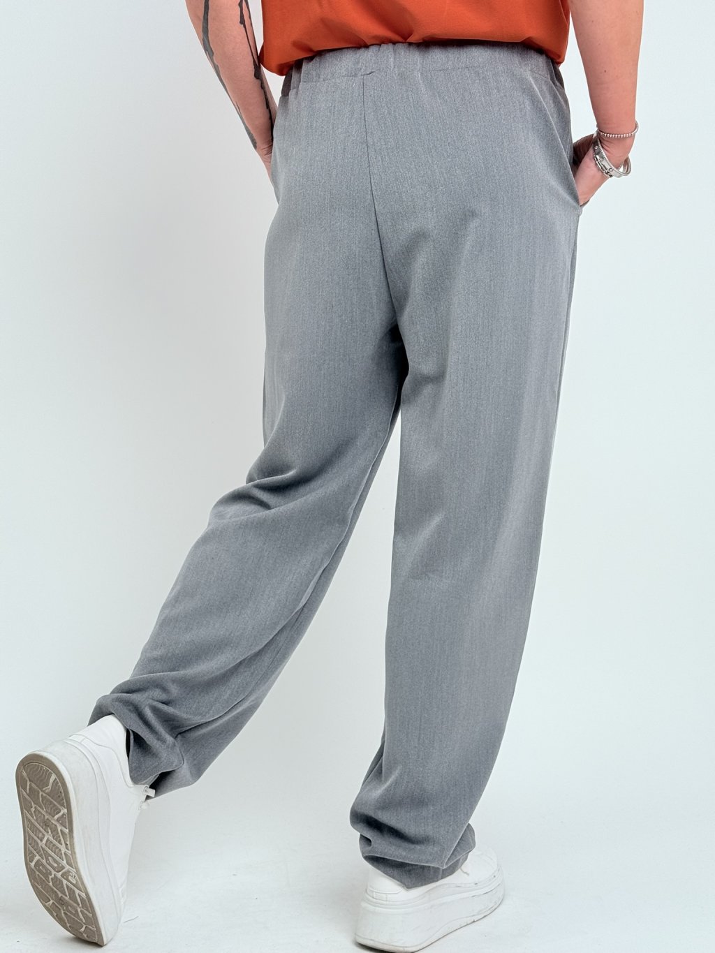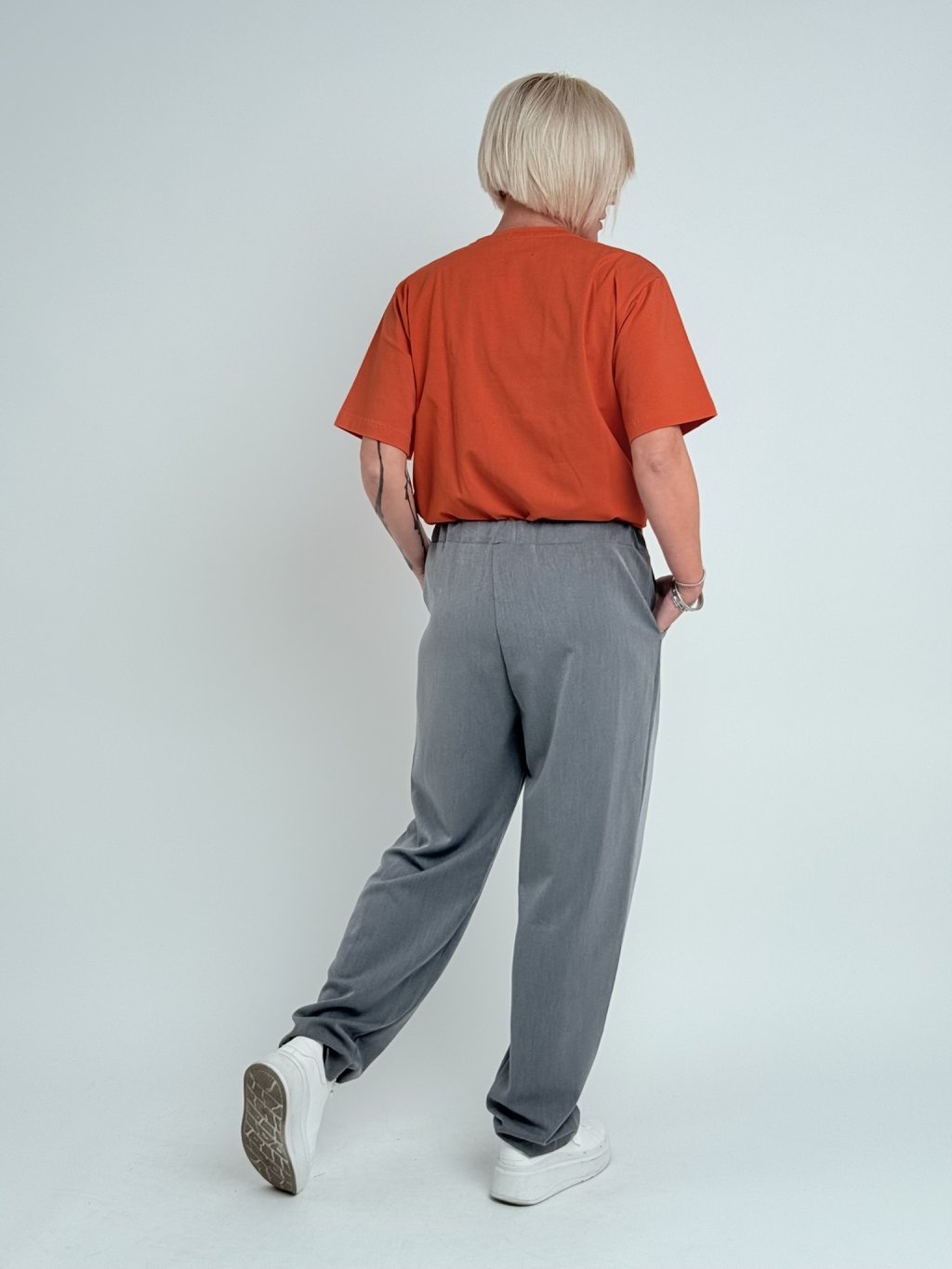 Pohodlné, zajímavé kalhoty, vpředu s překladem, vzadu v pase s gumou.