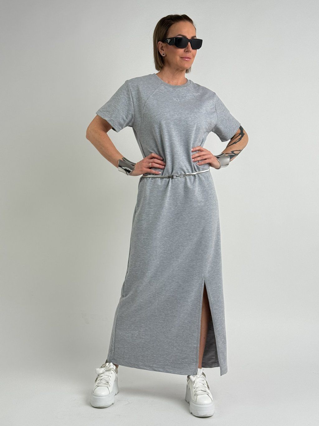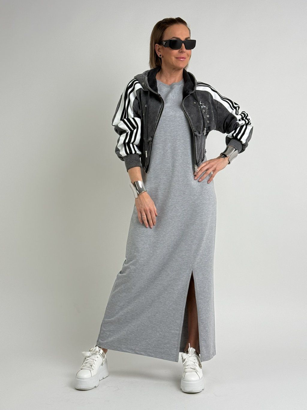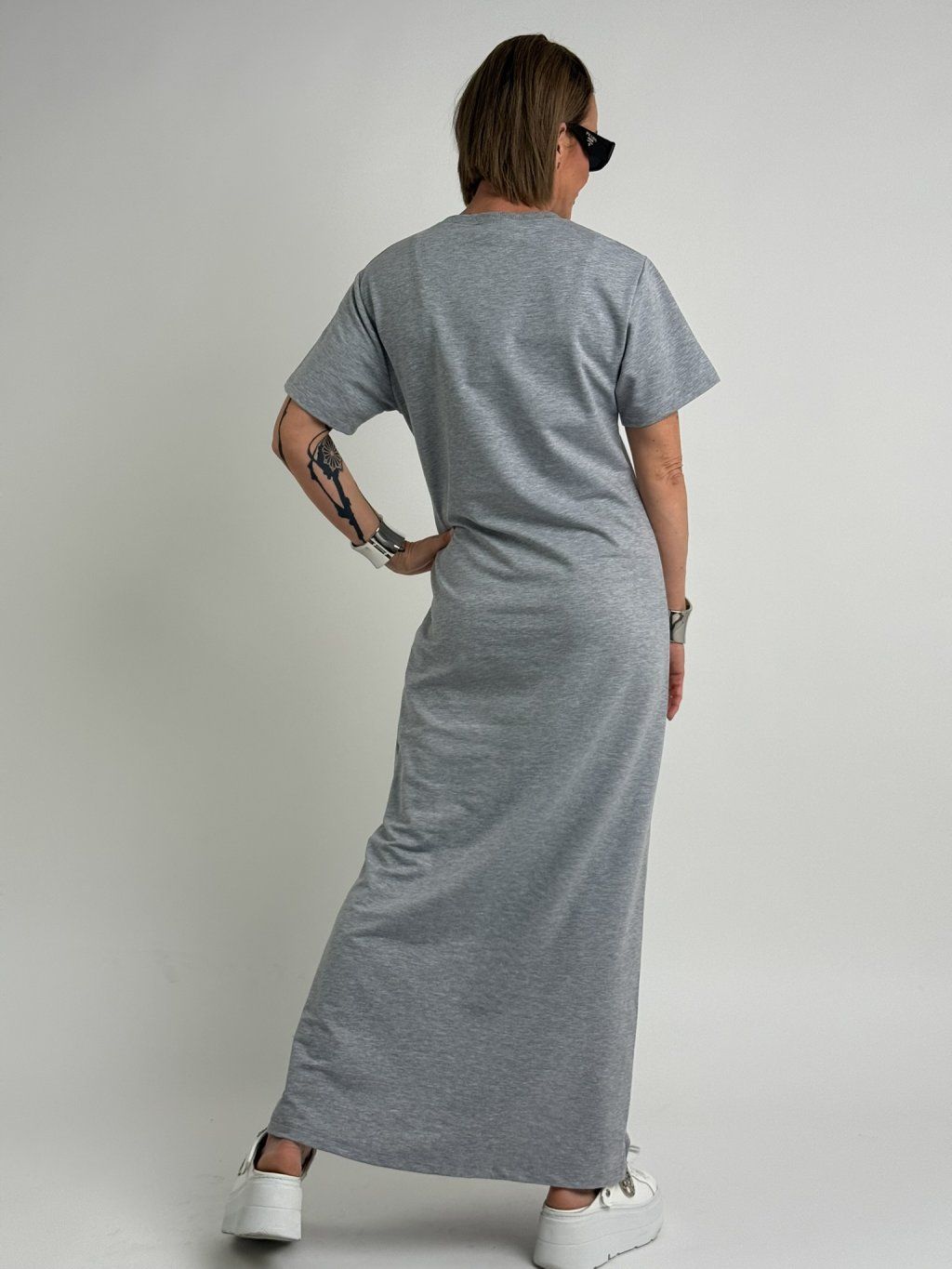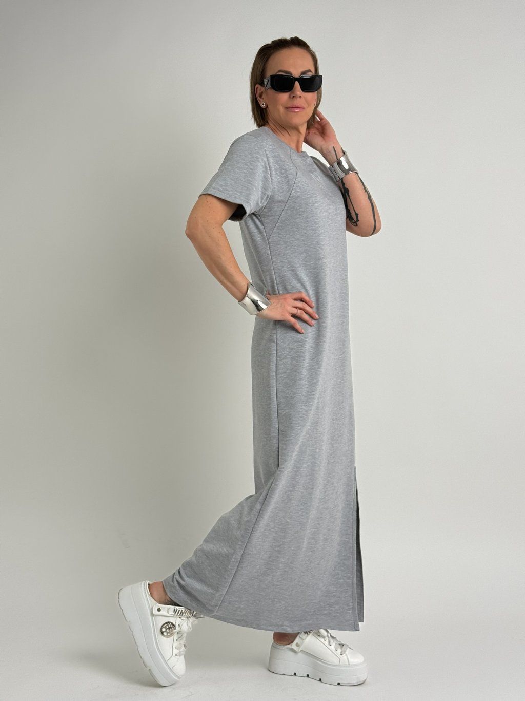Jednoduché, bavlněné, dlouhé šaty s rozparkem, krátkým rukávem a drobnou výšivkou pod výstřihem.