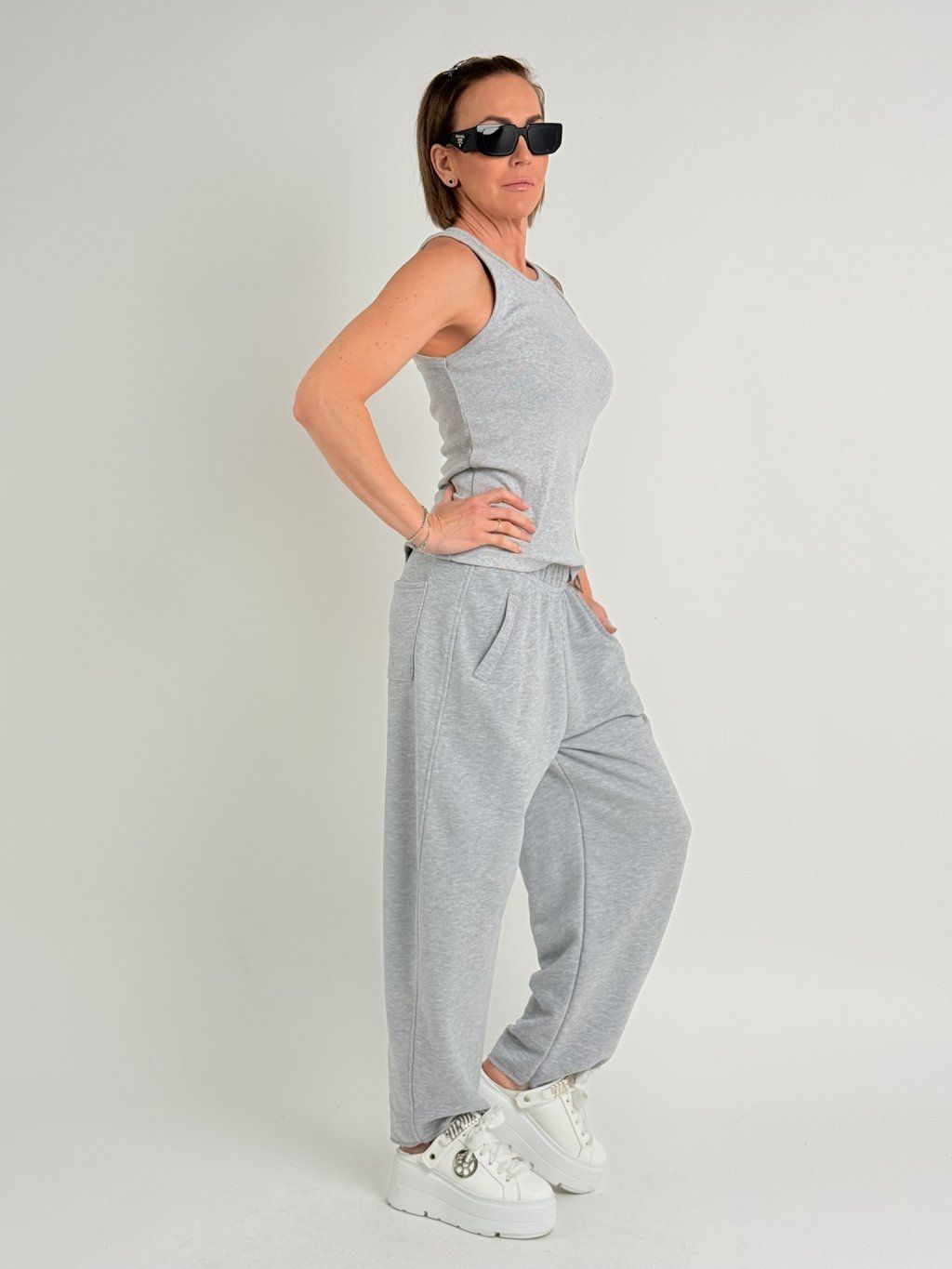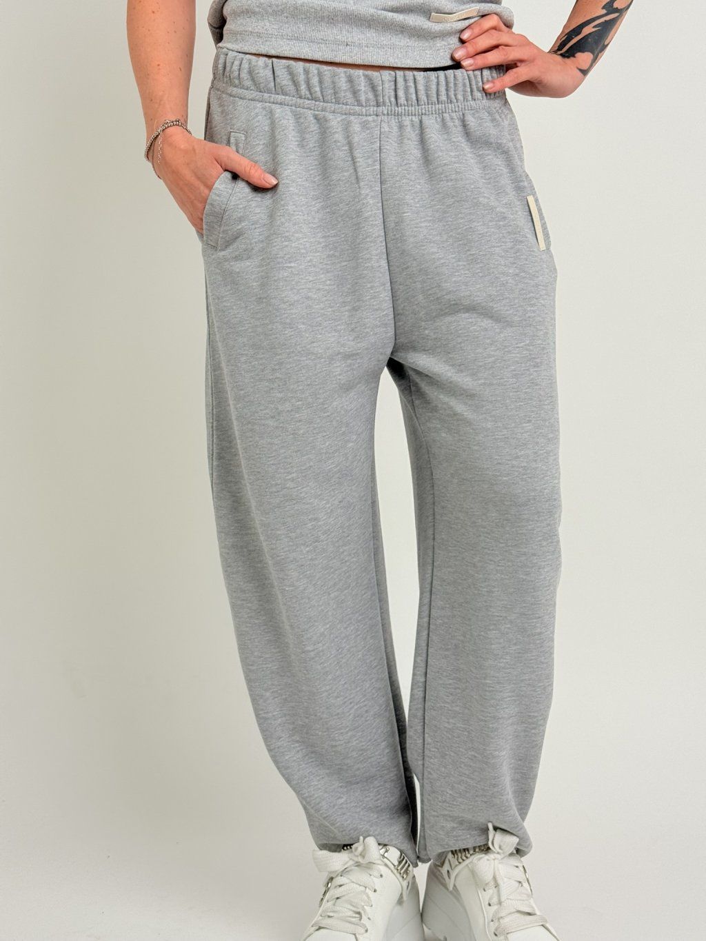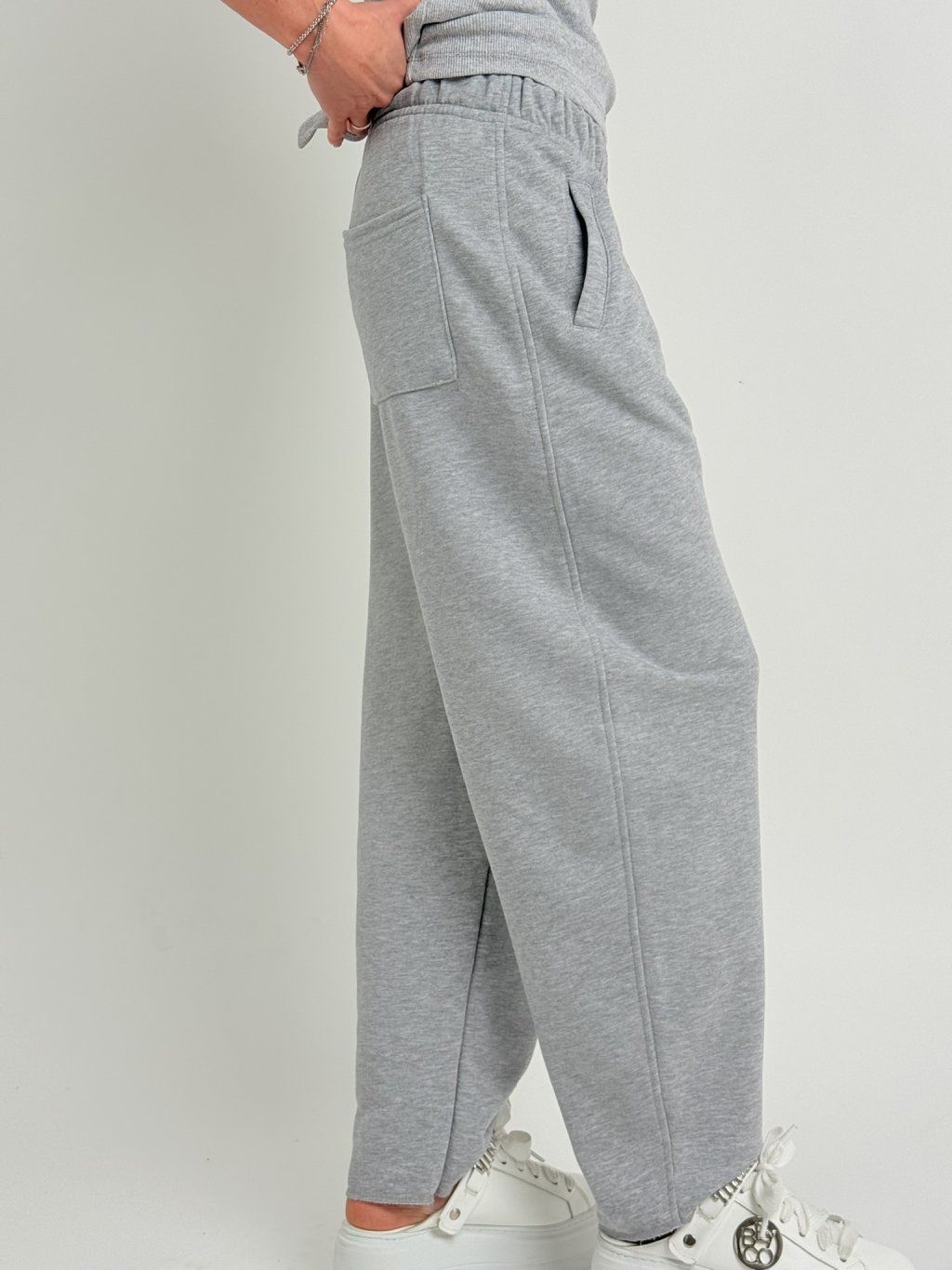 Tepláky v balonovém střihu, v pase do gumou a tkanicí na stažení, s postranními kapsami.