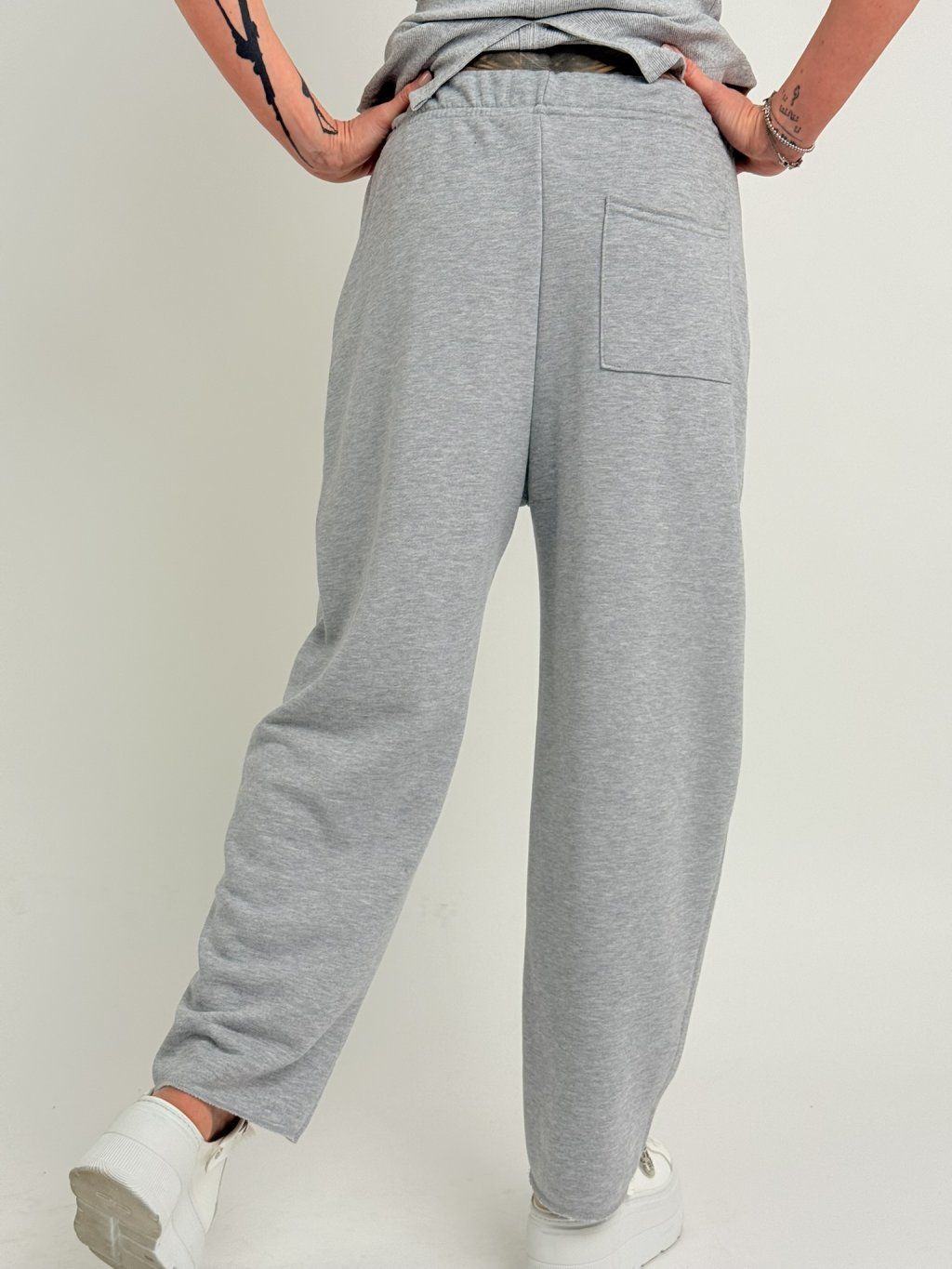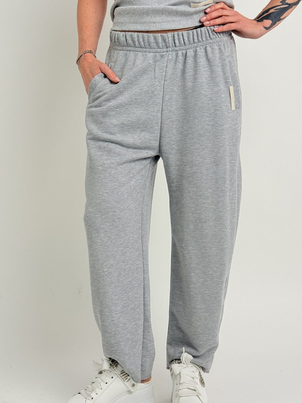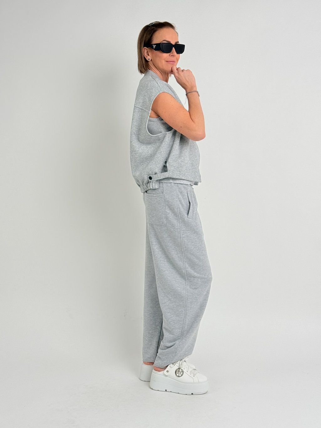 Tepláky v balonovém střihu, v pase do gumou a tkanicí na stažení, s postranními kapsami.