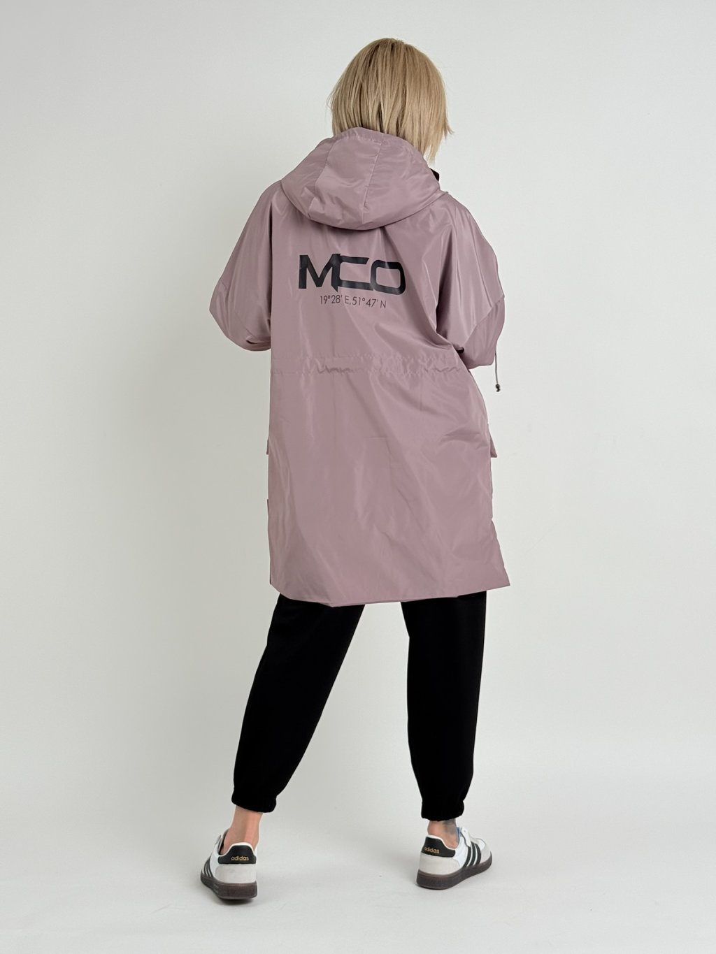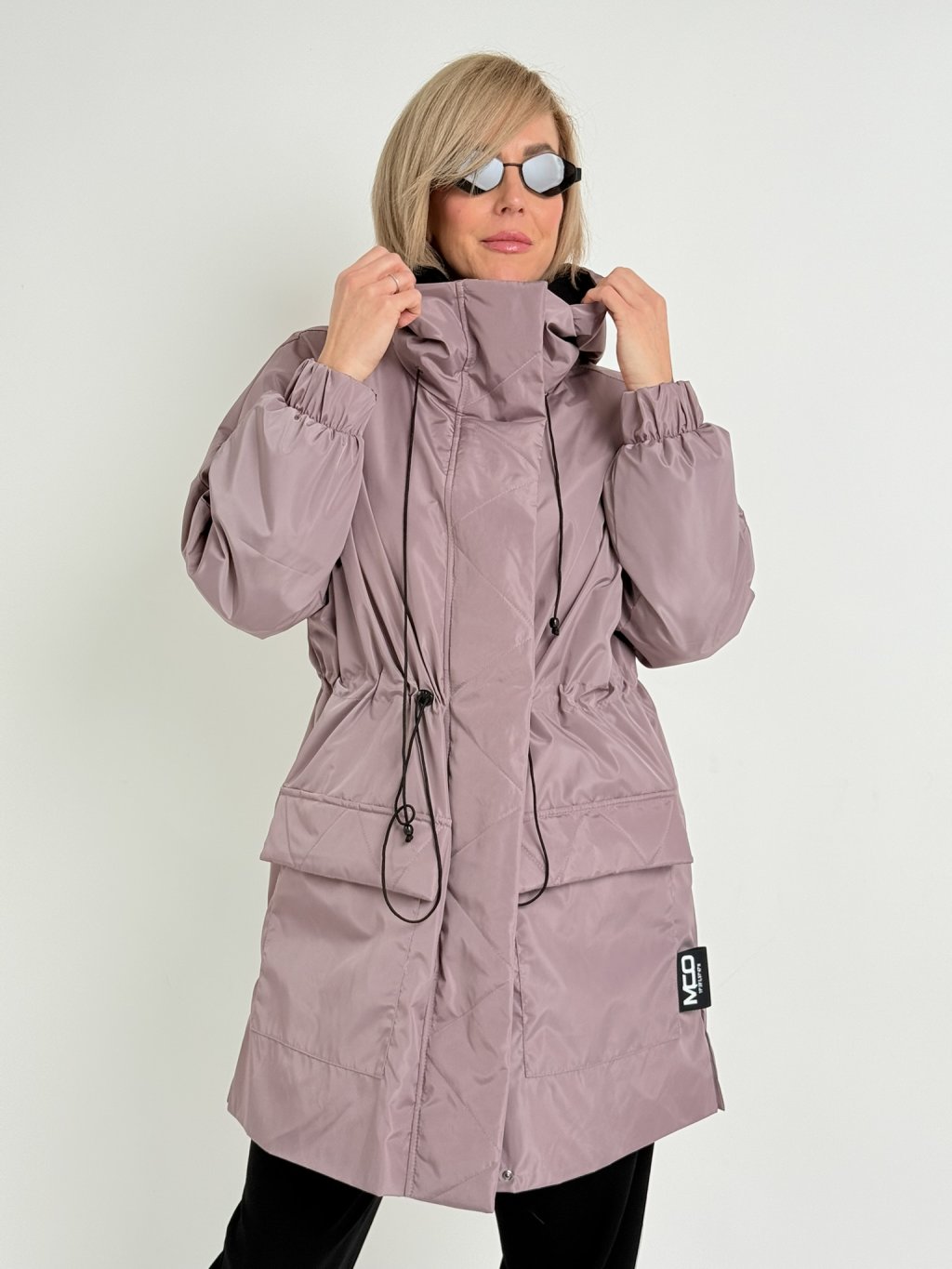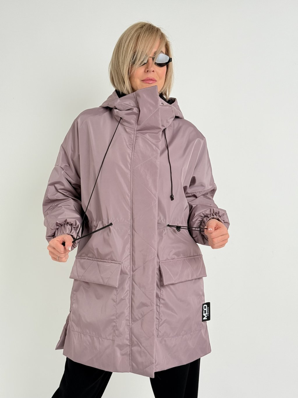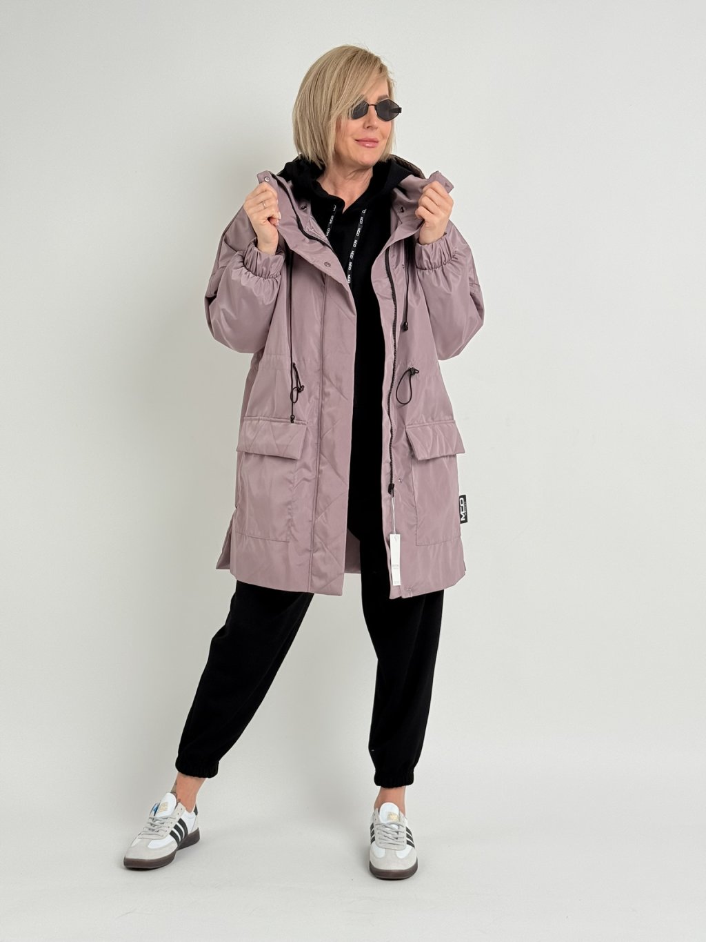 Šusťáková párka s kapucí, našitými kapsami, pasem se šńůrkou na stažení, rukávem zakončeným gumou, se zapínáním na zip a patenty.