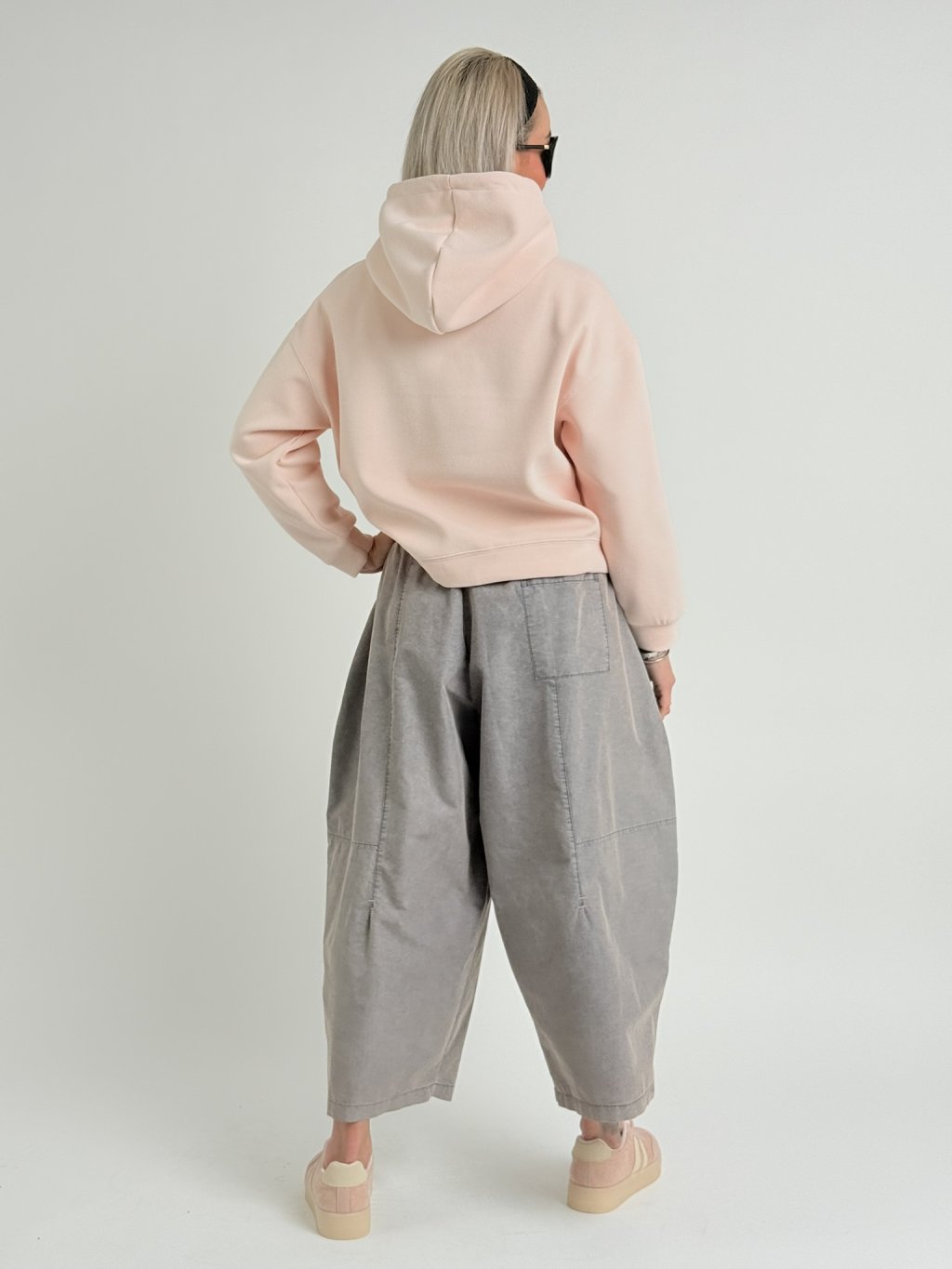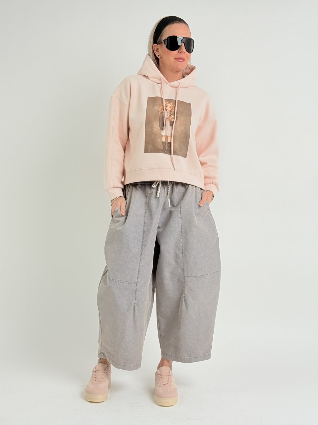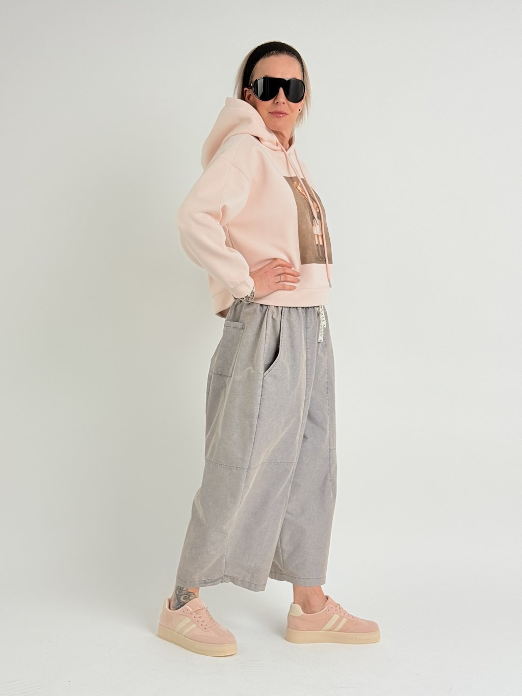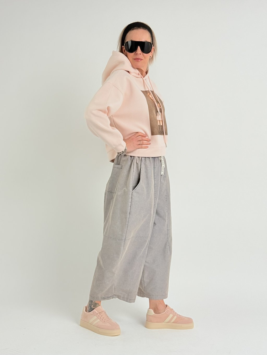 7/8 kalhoty v balonovém střihu, v pase do gumou a tkanicí na stažení, s postranními kapsami, vzadu s jednou kapsou..