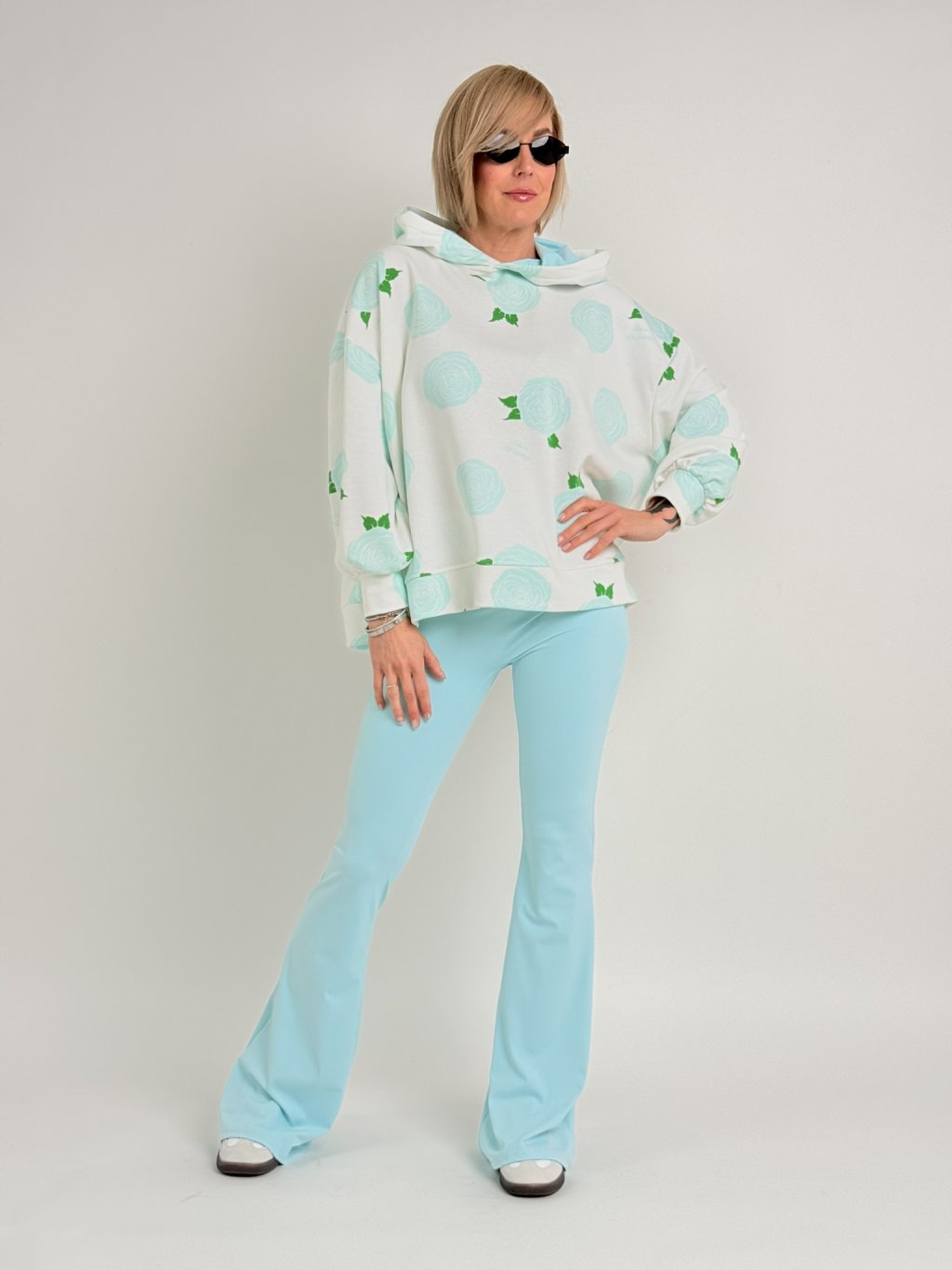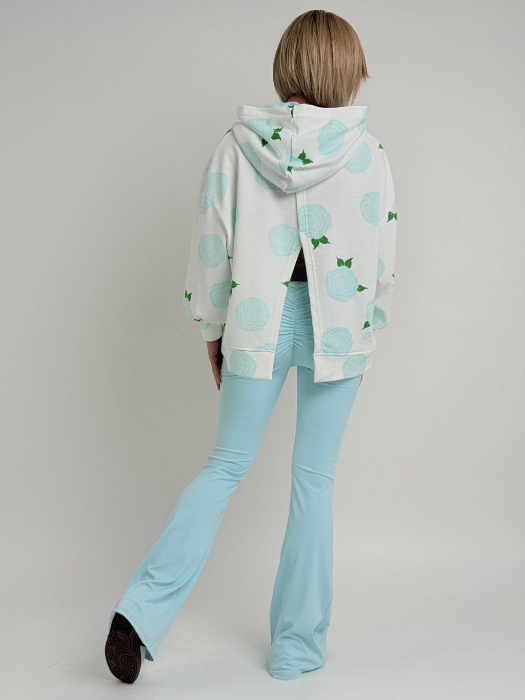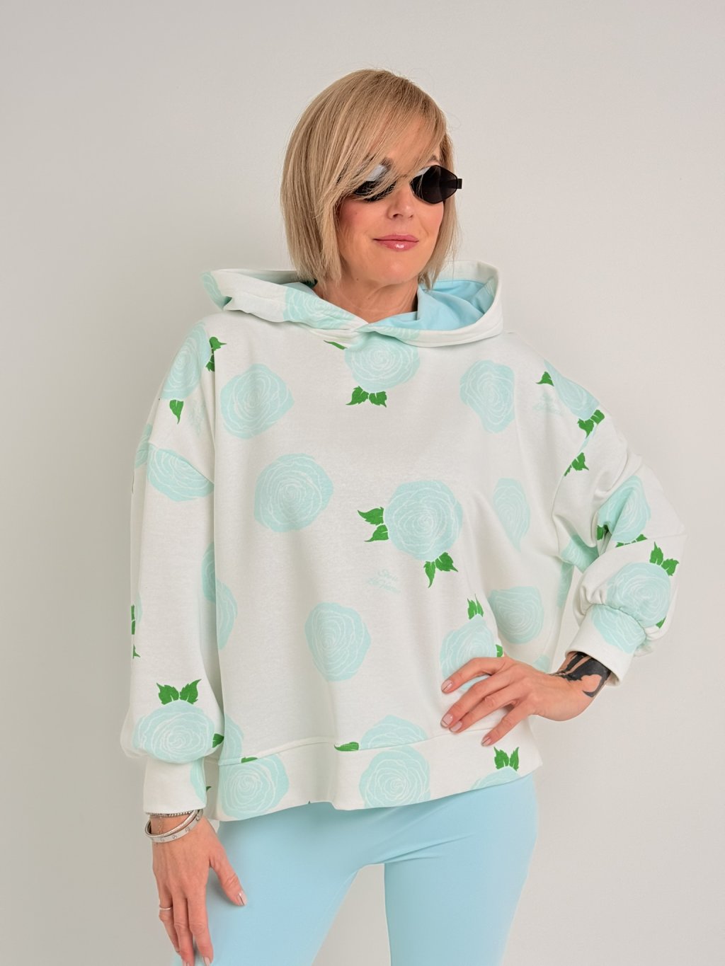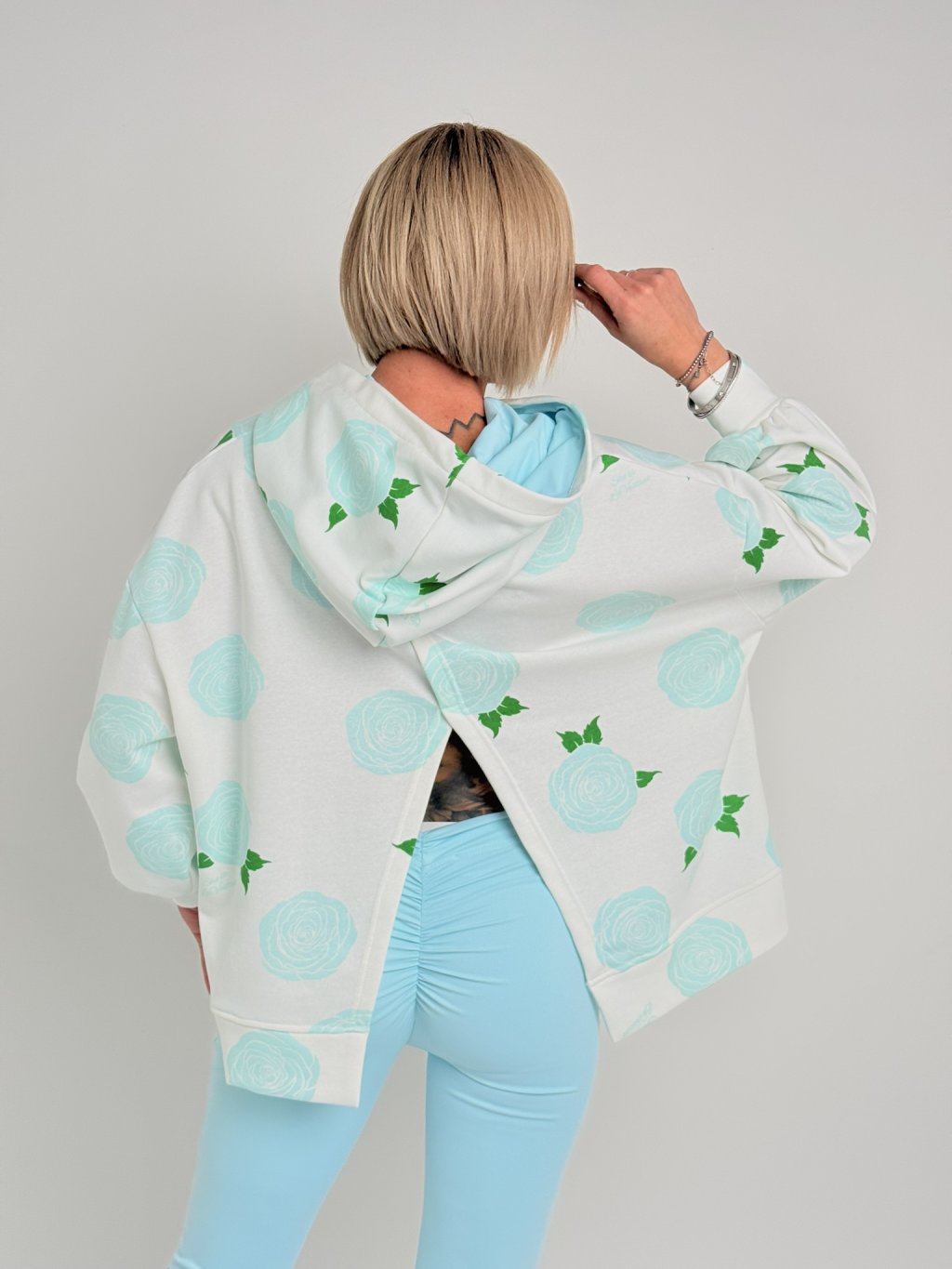 Oversize, smetanová mikina s mintovými květy, dlouhými rukávy a překříženým zadním dílem.