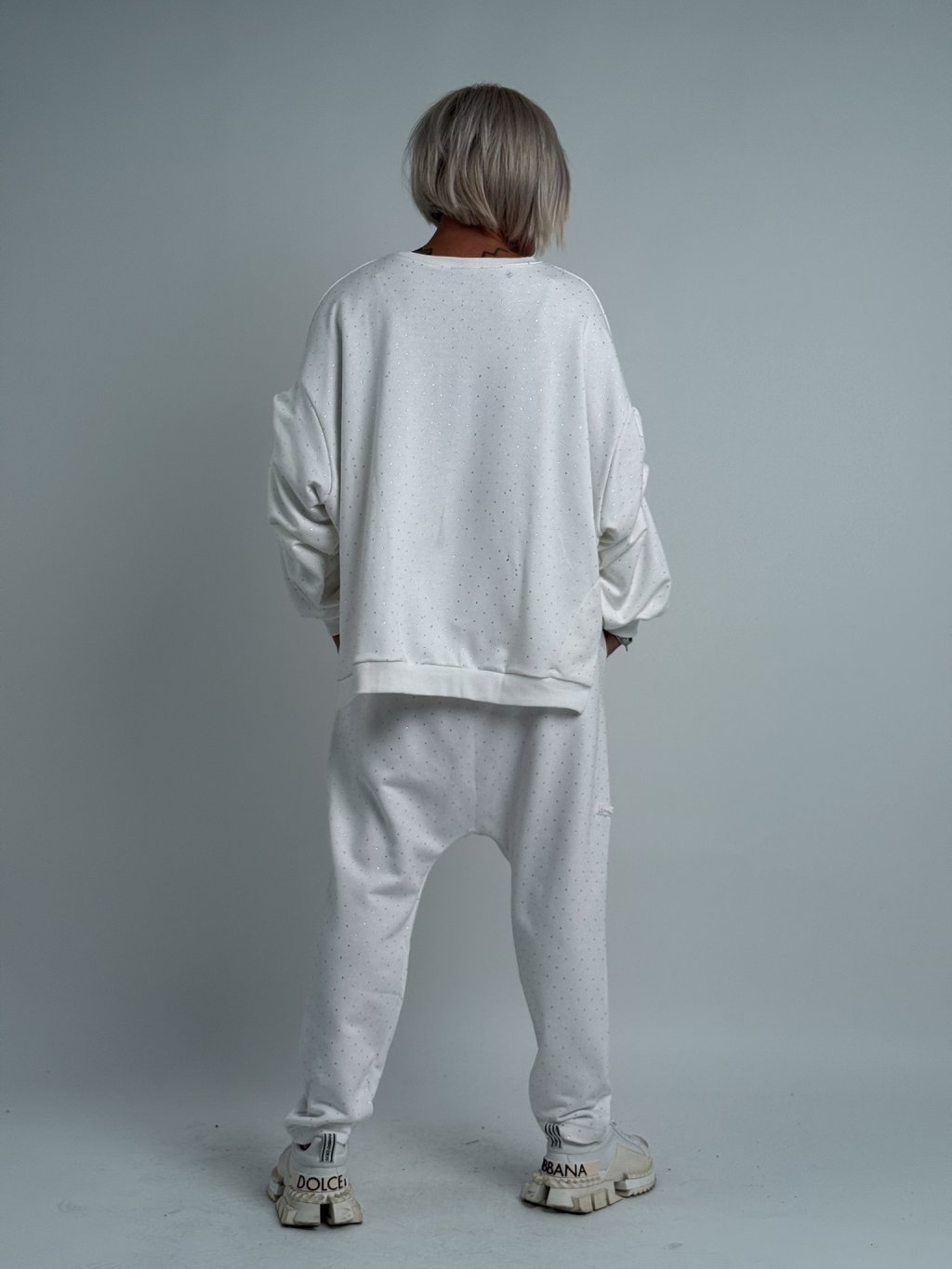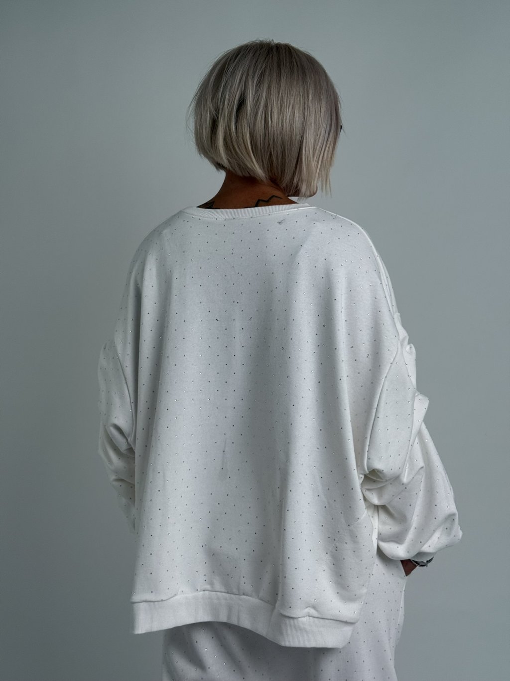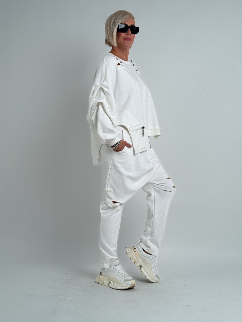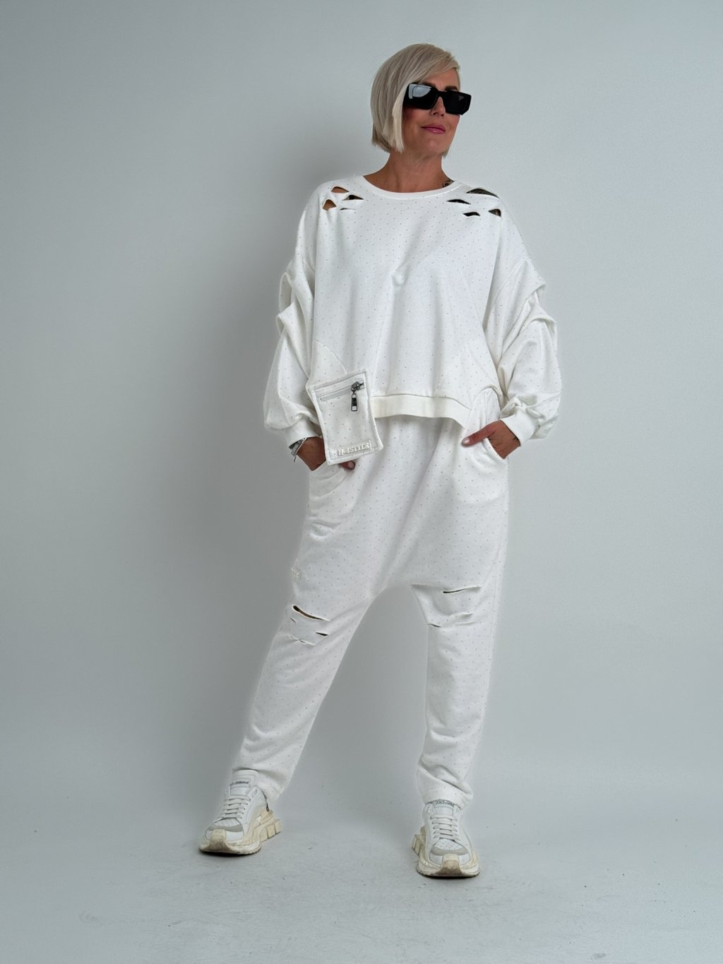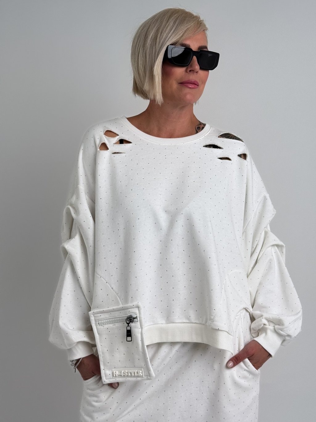 Super mikina s dlouhým rukávem, zajímavě řešeným dolním krajem, který zdobí kapsa se zipem. Celou mikinu zdobí průstřihy a drobné kamínky. MĚŘTE, TOPY ODPOVÍDAJÍ VĚTŠÍM VELIKOSTEM.