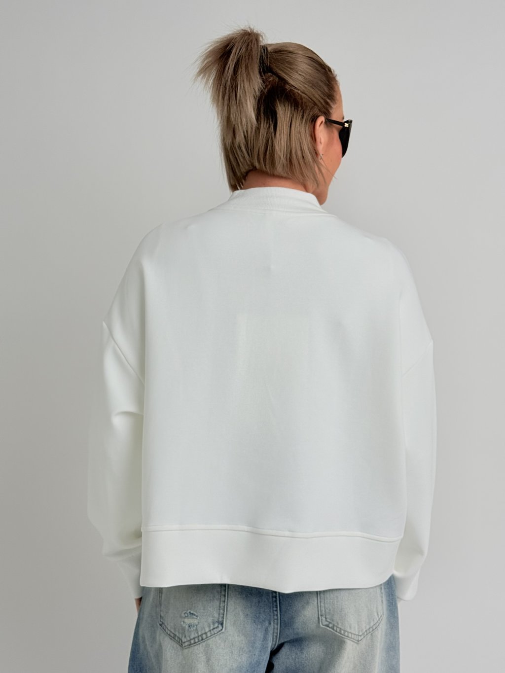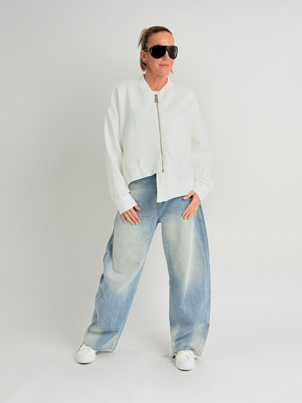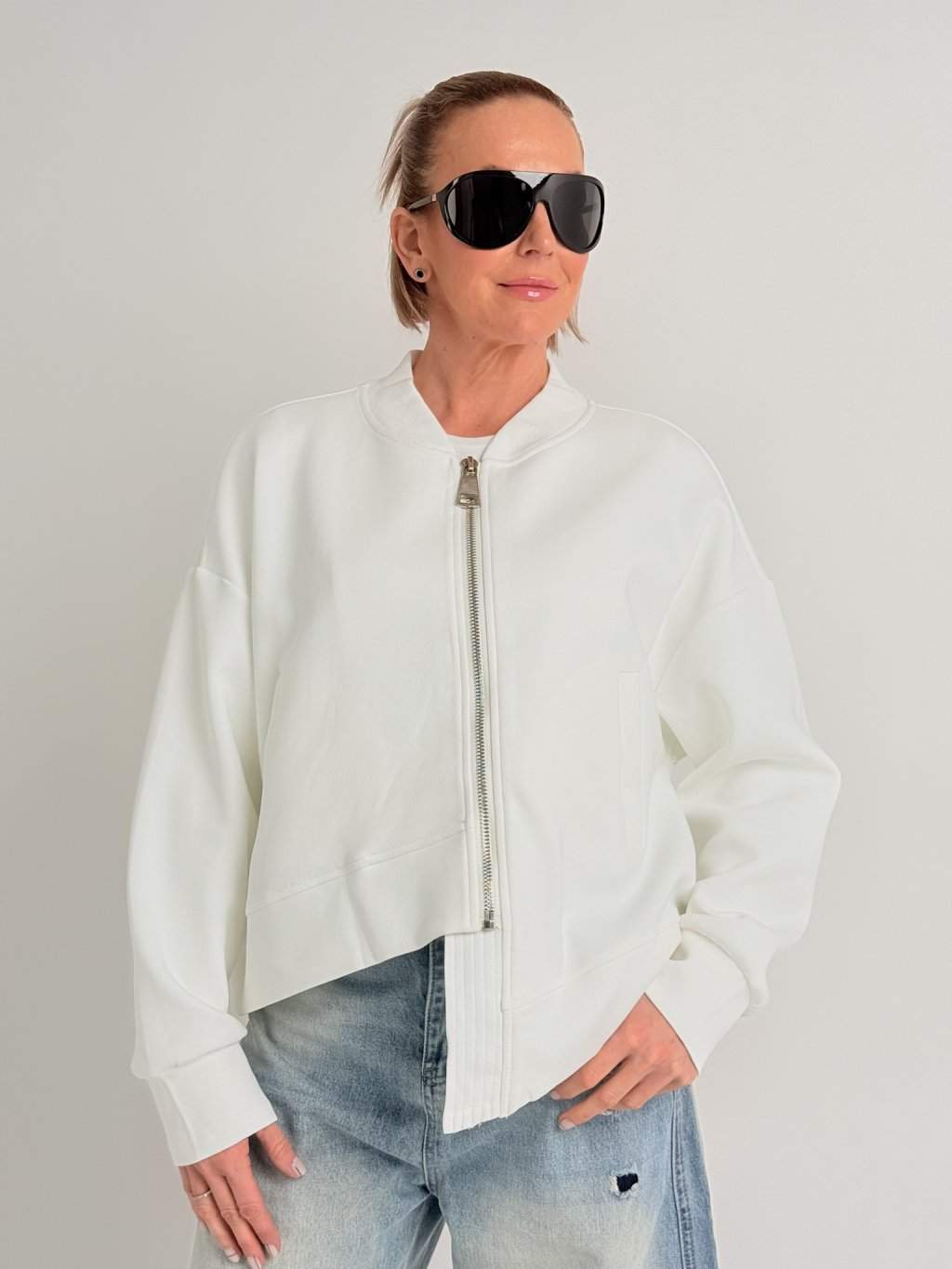 Volná, asymetrická mikina, s jedním delším cípem, zapínáním na zip, s kapsami a nápletem u krku.