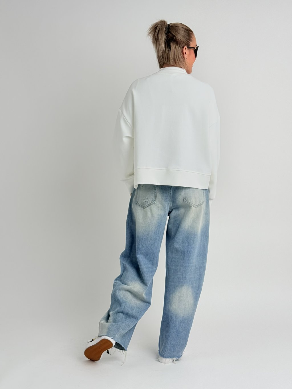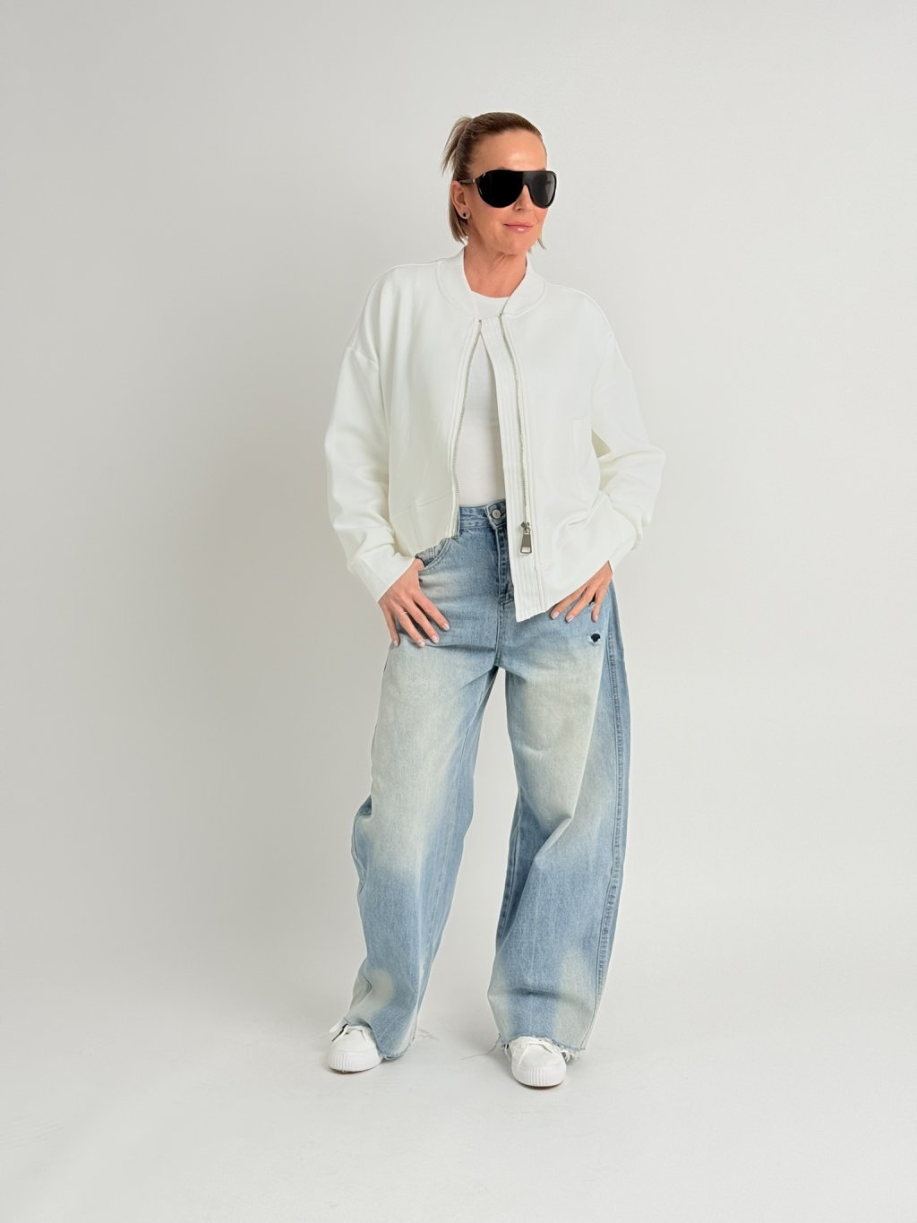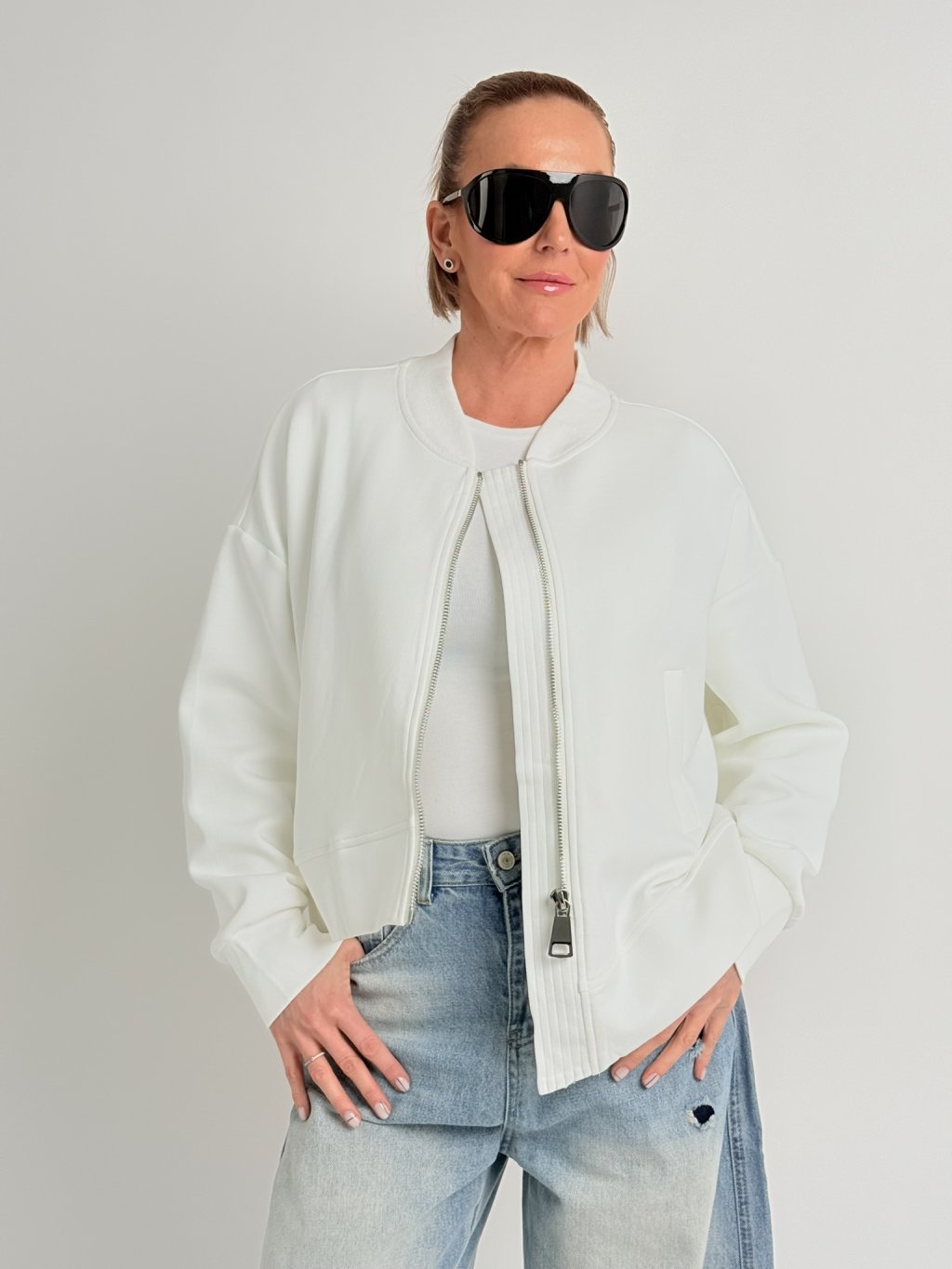 Volná, asymetrická mikina, s jedním delším cípem, zapínáním na zip, s kapsami a nápletem u krku.