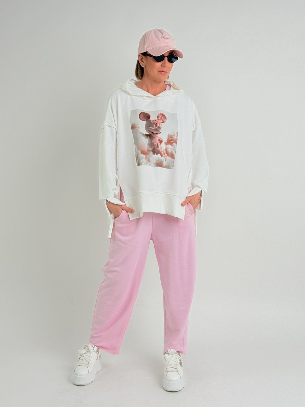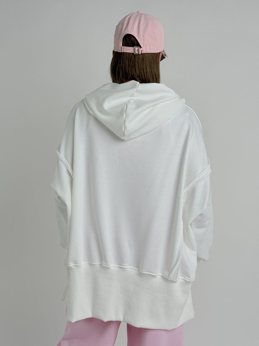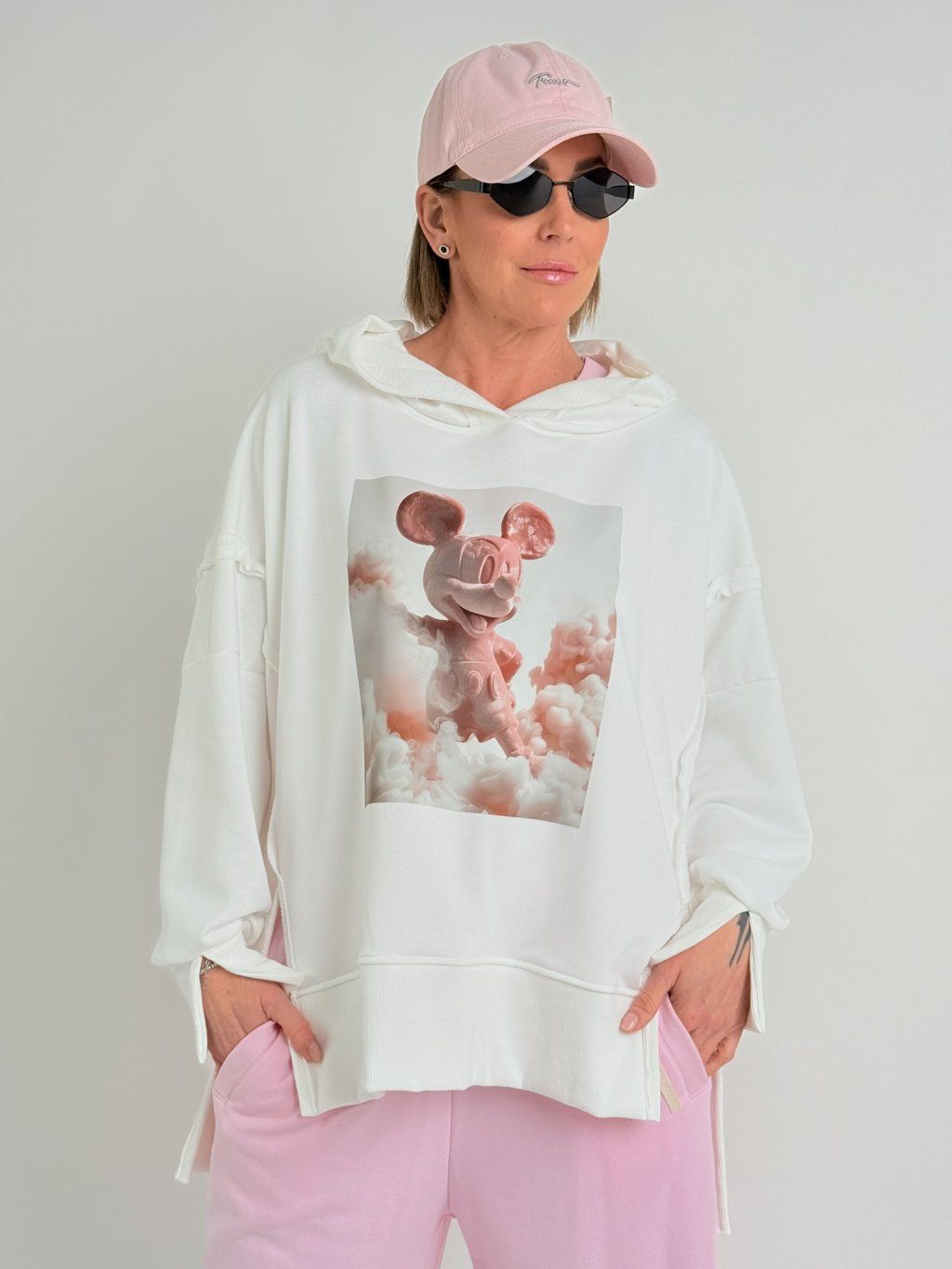 Delší mikina s potiskem na předním dílu, s kapucí, na rukávech i dolním okraji s náplety s rozparky.