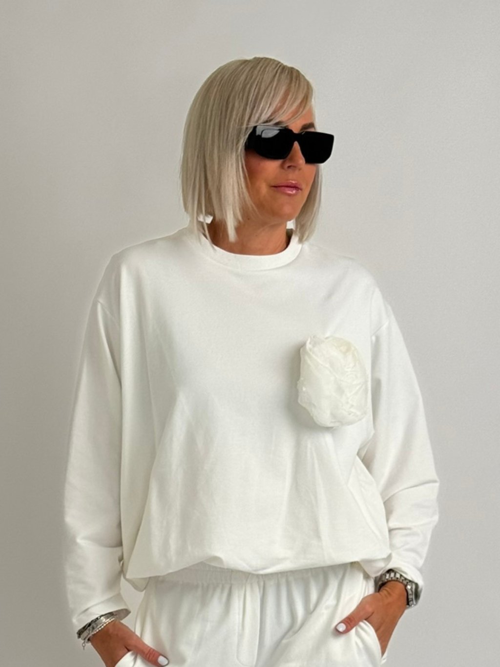 Super, oversize mikina s tylovou podšívkou, v dolním kraji do gumy, s odepínací aplikací květu na předním dílu a rukávy lehce staženými gumičkou.