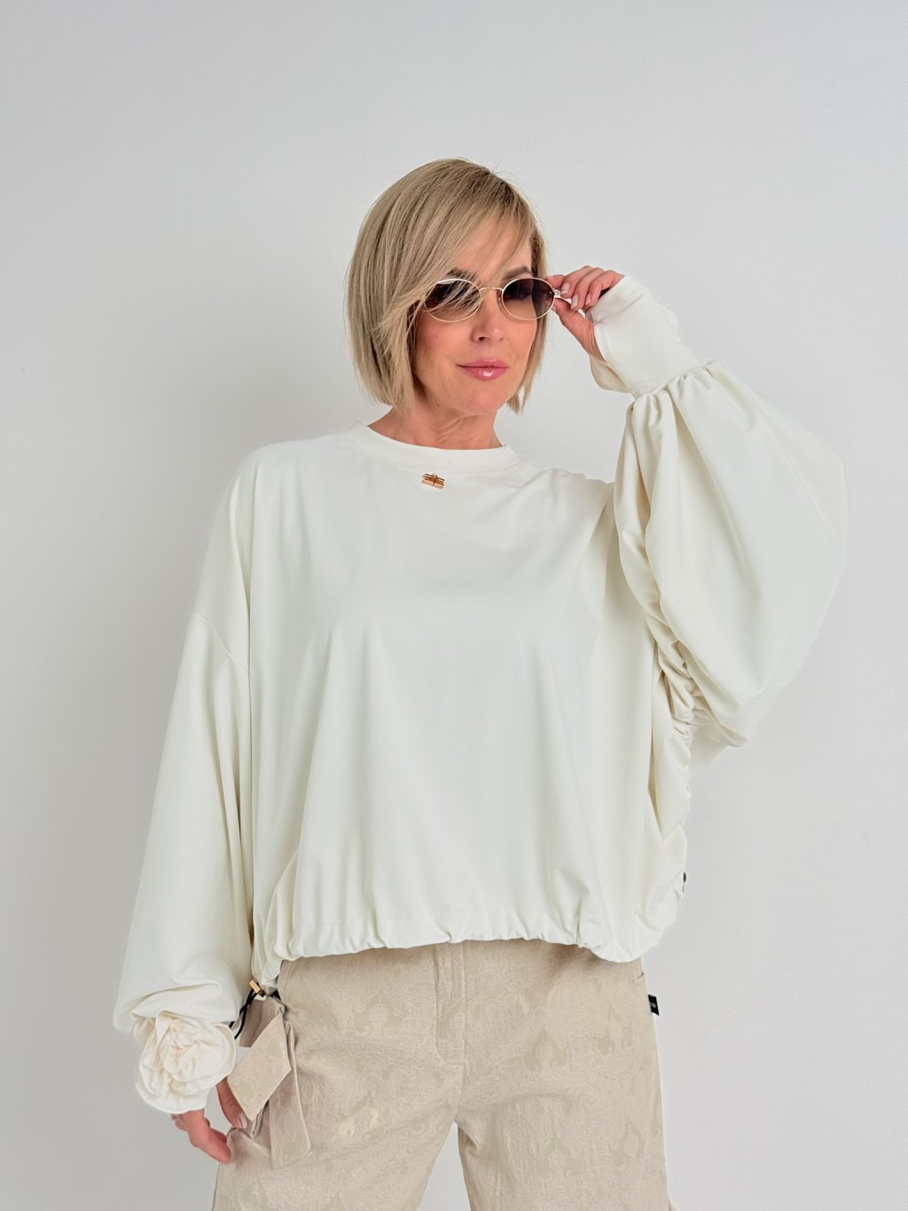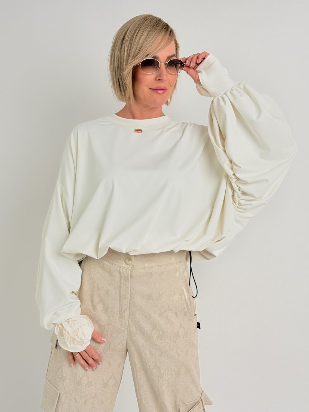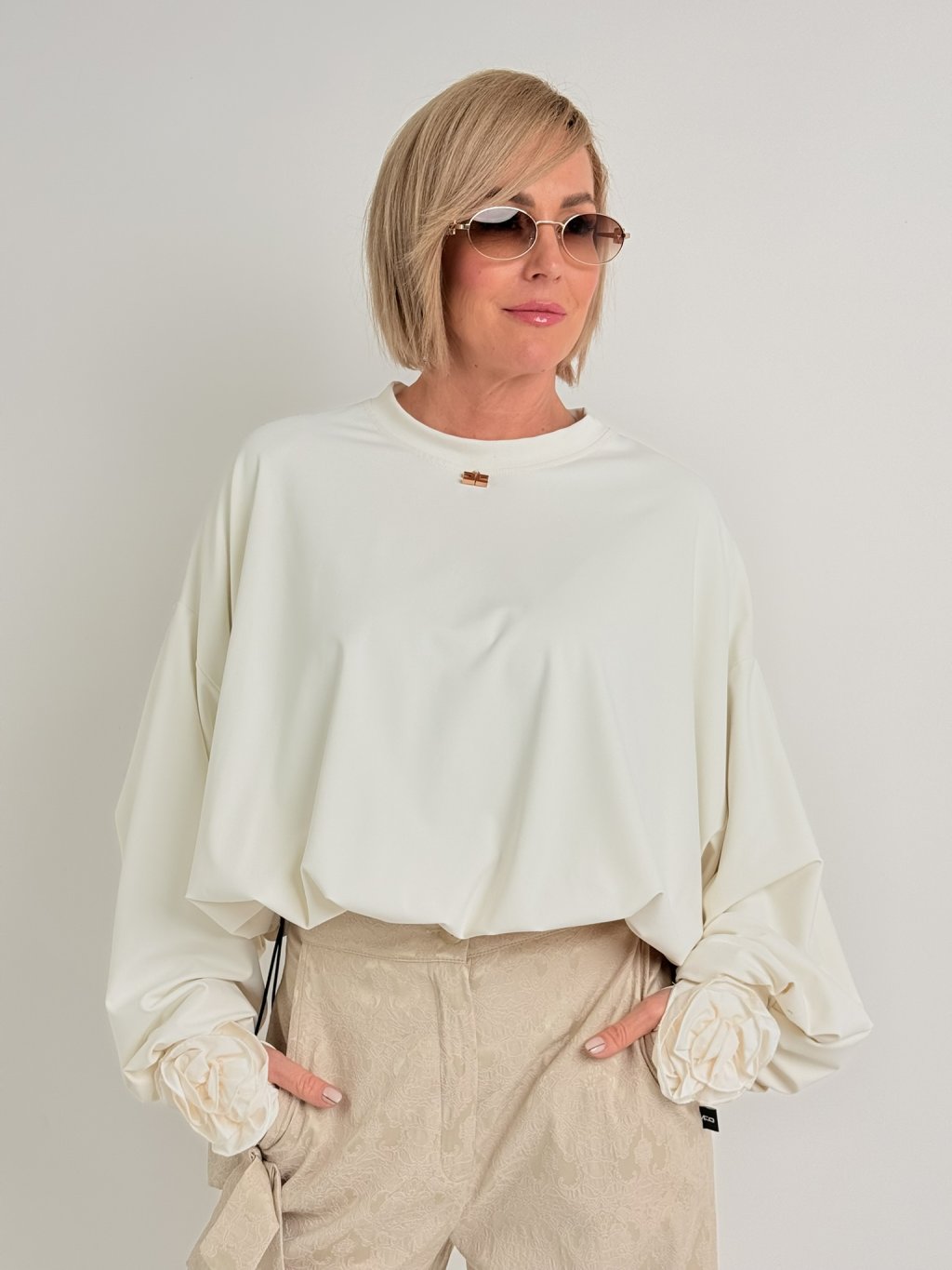 Oversize tunika v netopýřím střihu, s nabíranými rukávy zakončenými manžetou s aplikací květu, v pase na stažení,