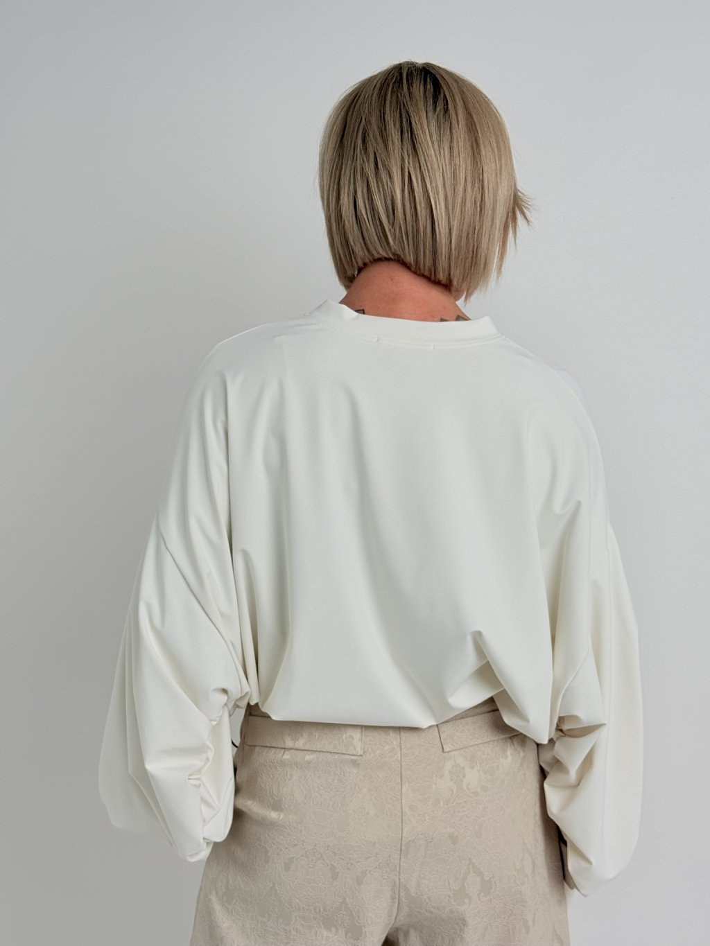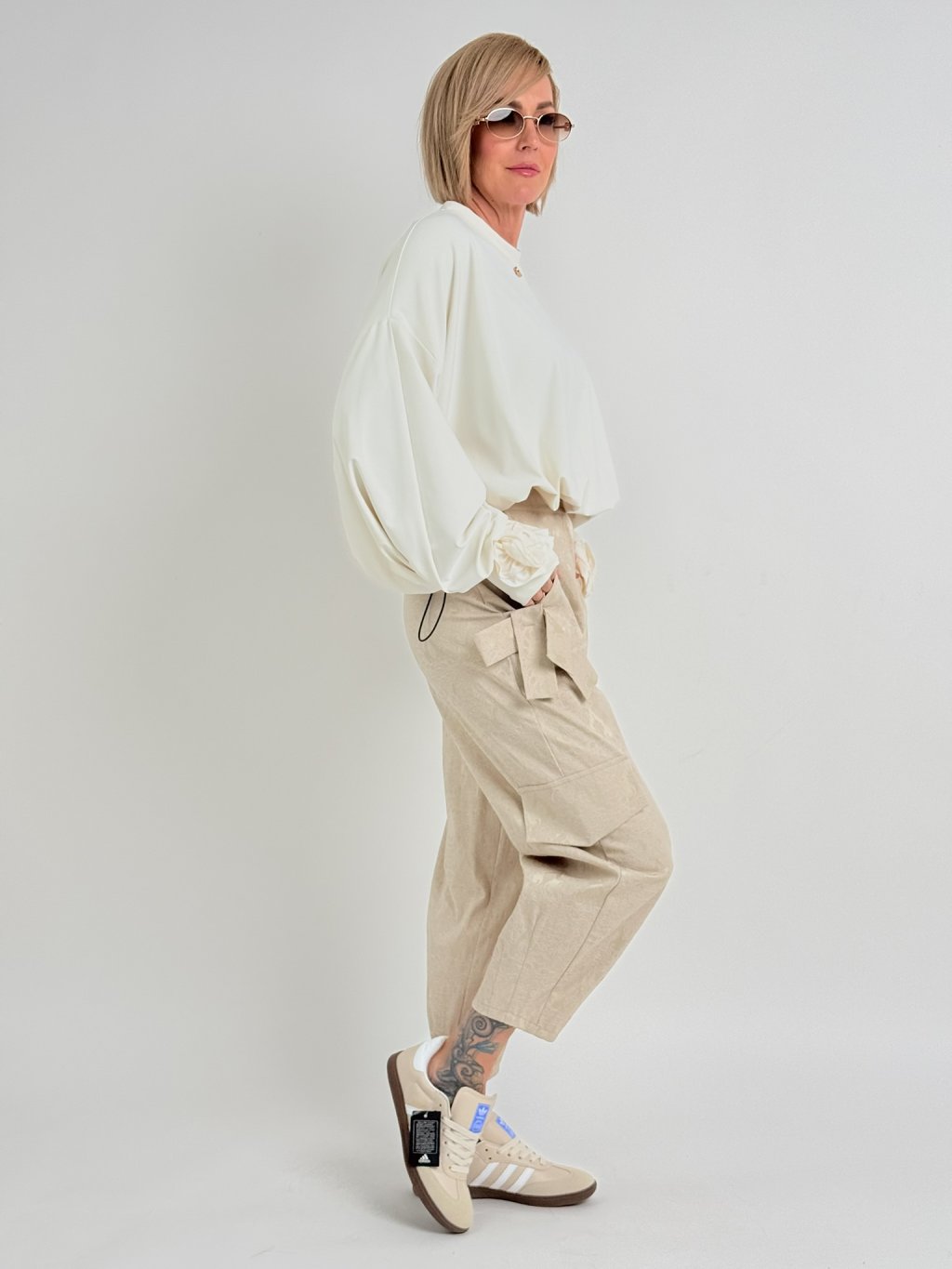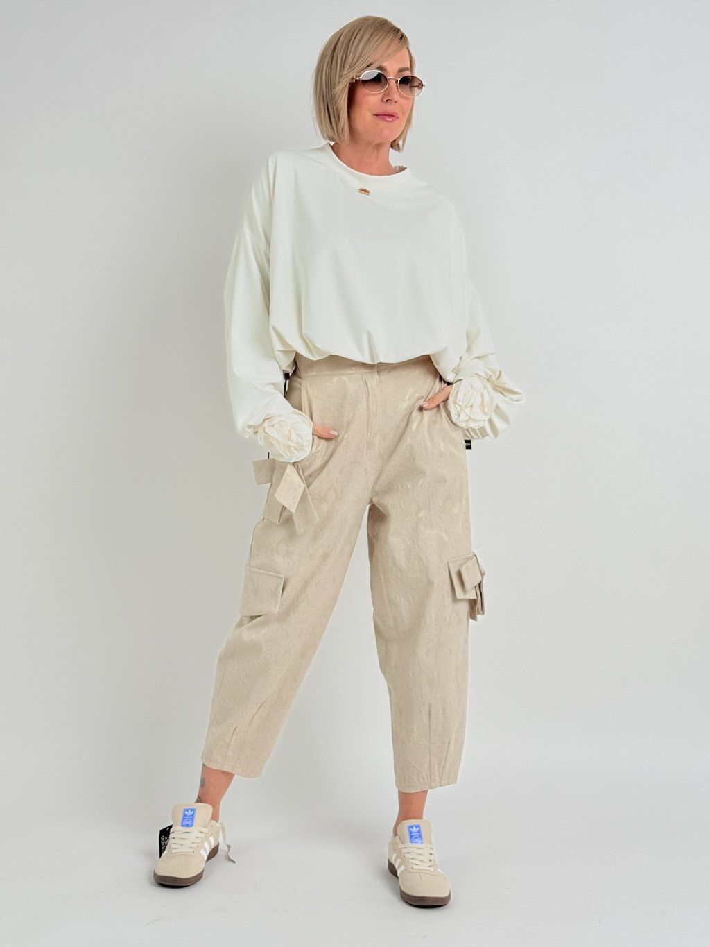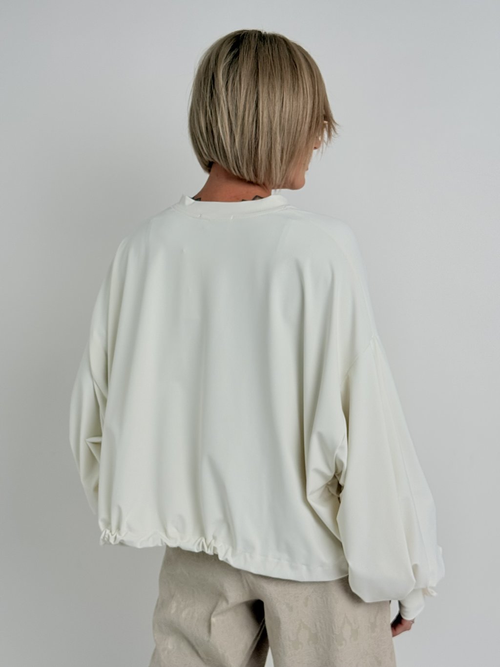Oversize tunika v netopýřím střihu, s nabíranými rukávy zakončenými manžetou s aplikací květu, v pase na stažení,