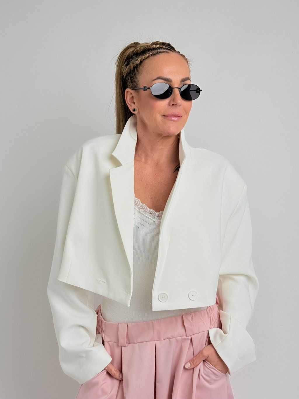 Luxusní, kratší, oversize sako s klopami, se zapínáním na 2 knoflíky, s ramenními vycpávkami.