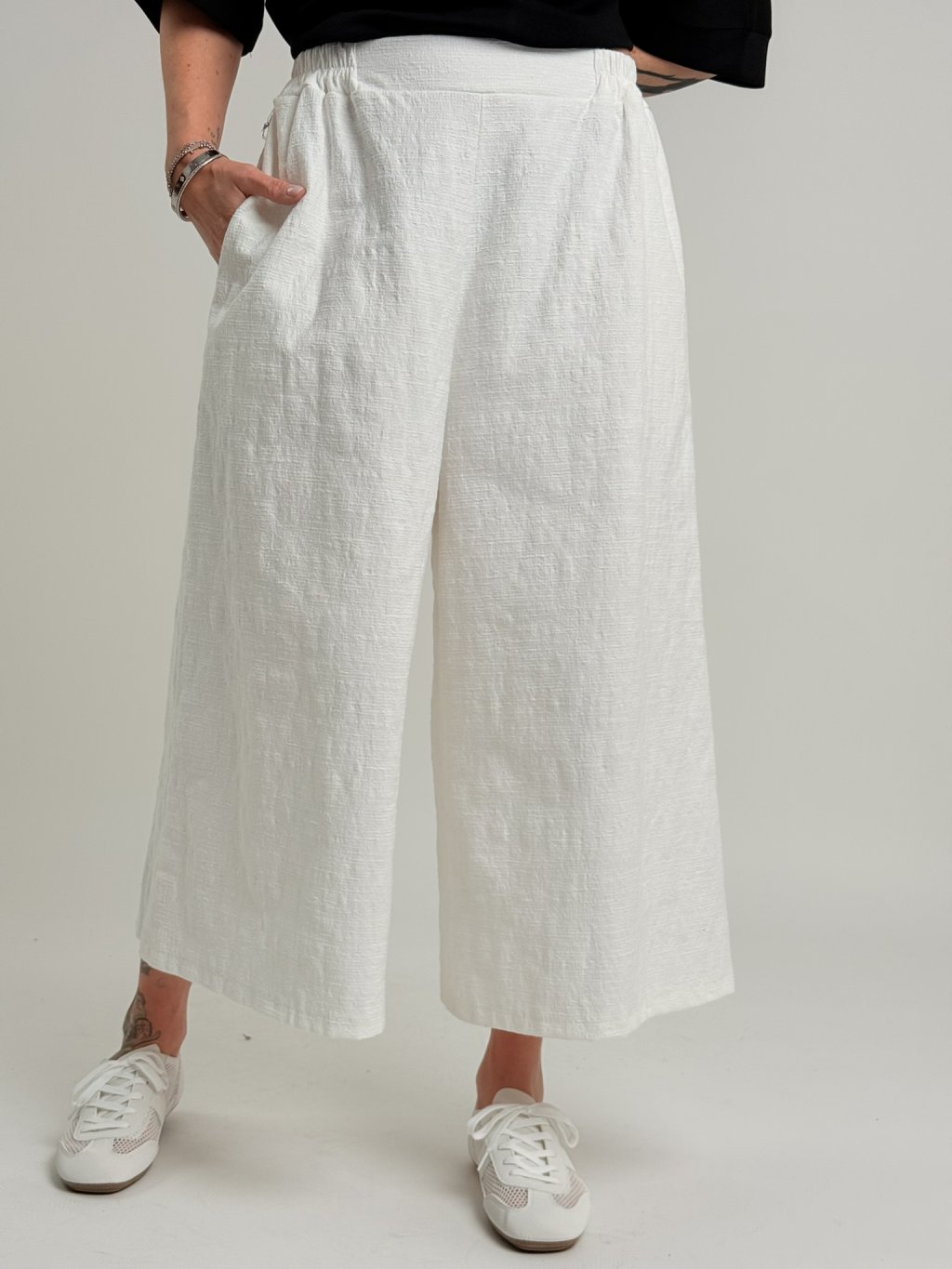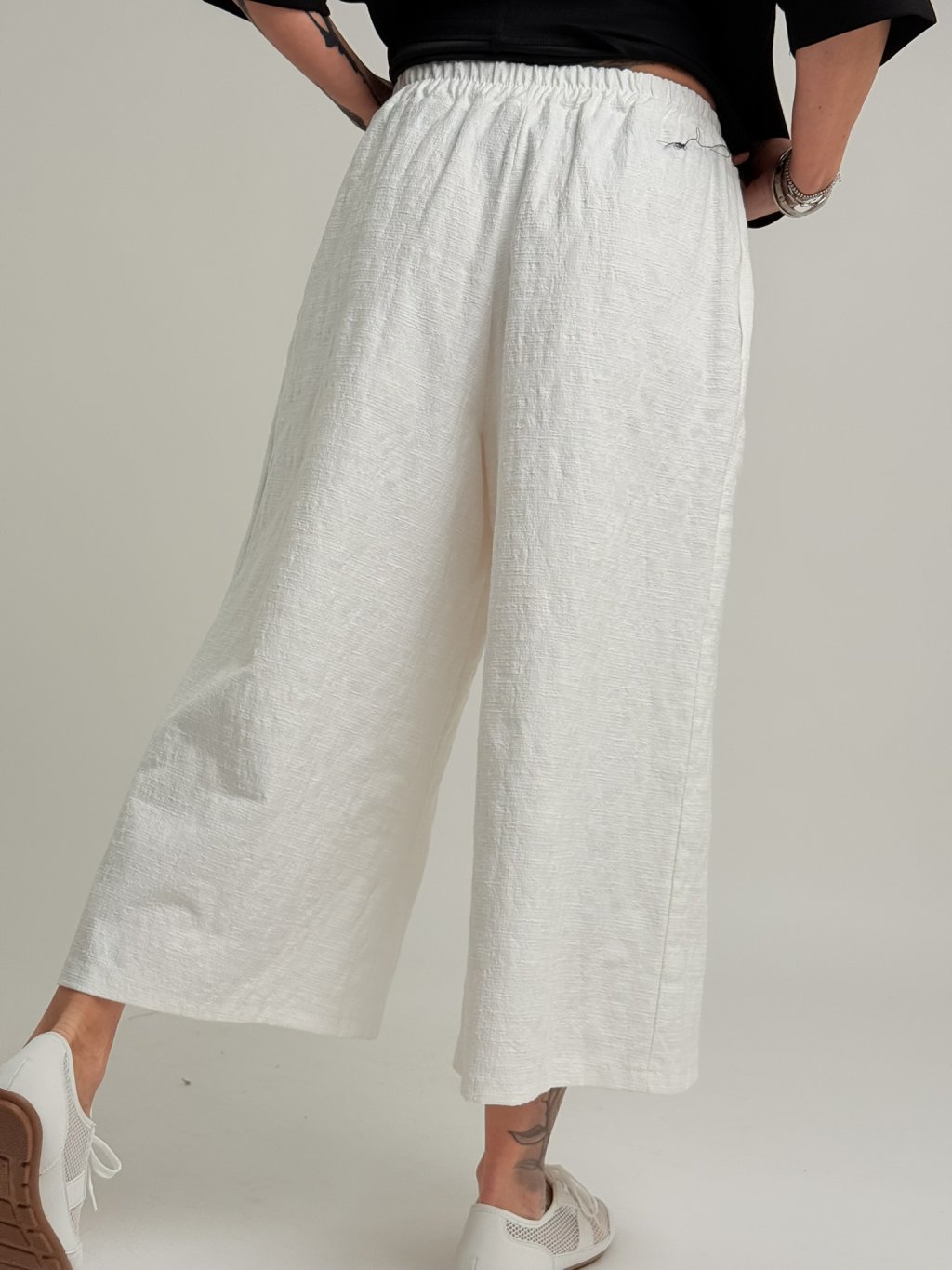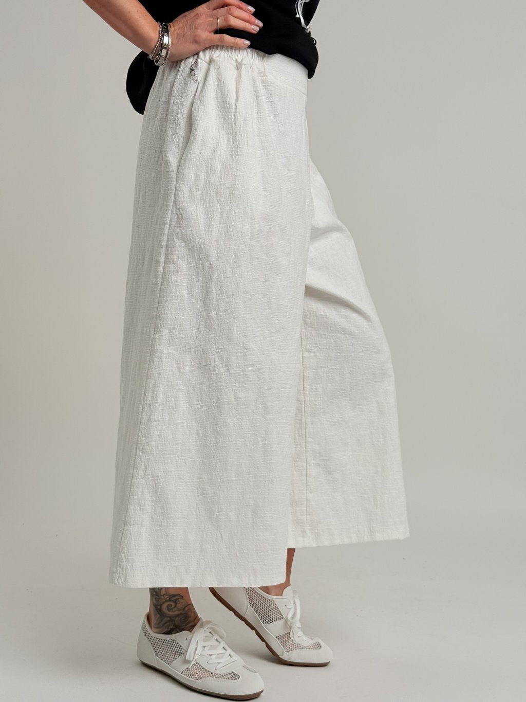Dokonalé, široké kalhoty, v pase s gumou a postranními kapsami, vpředu s protiskladem.
