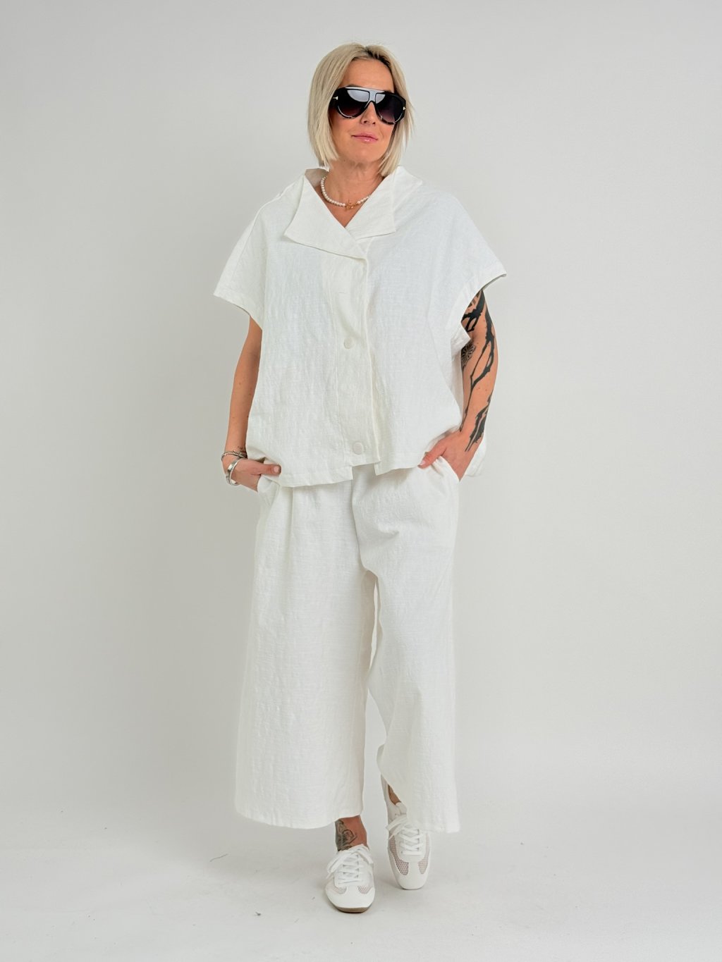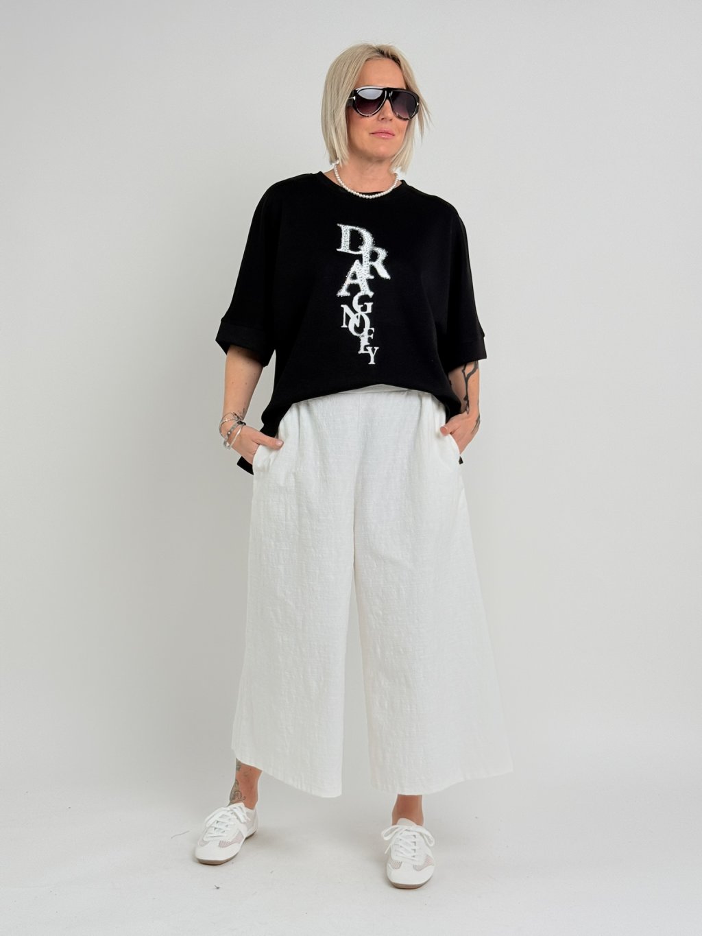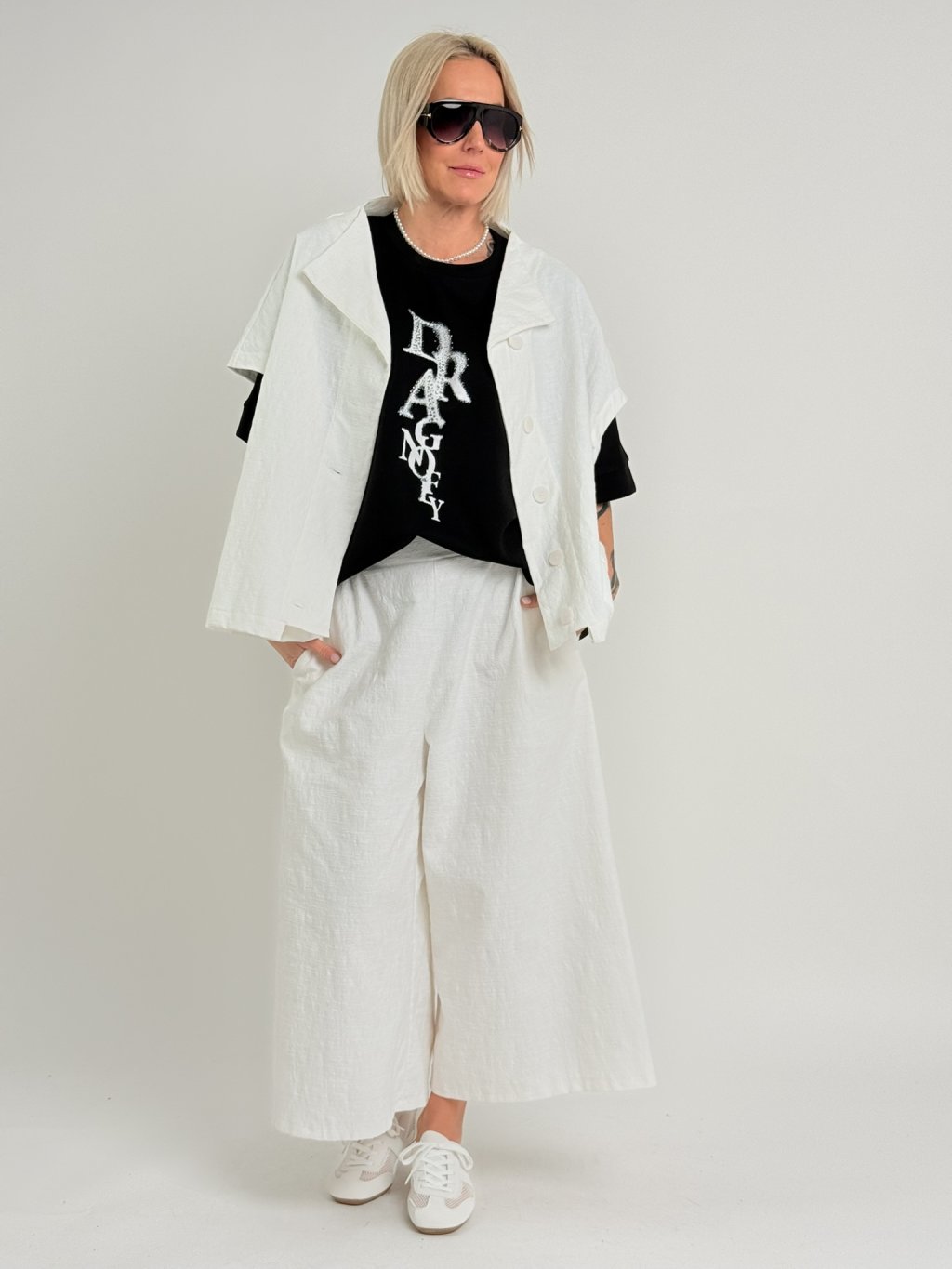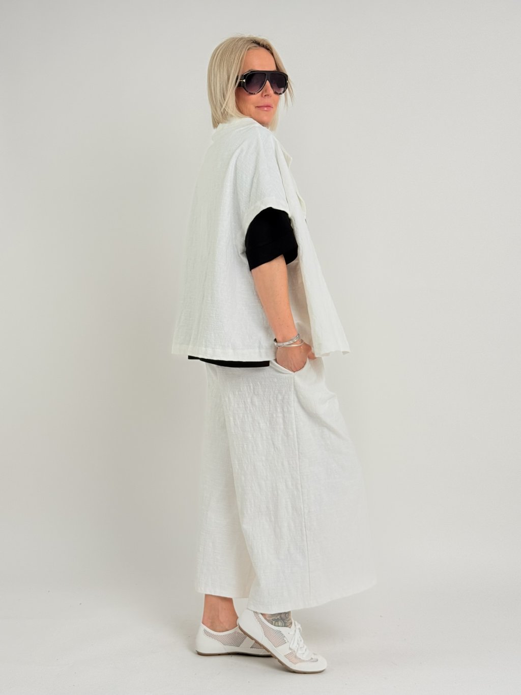 Dokonalé, široké kalhoty, v pase s gumou a postranními kapsami, vpředu s protiskladem.
