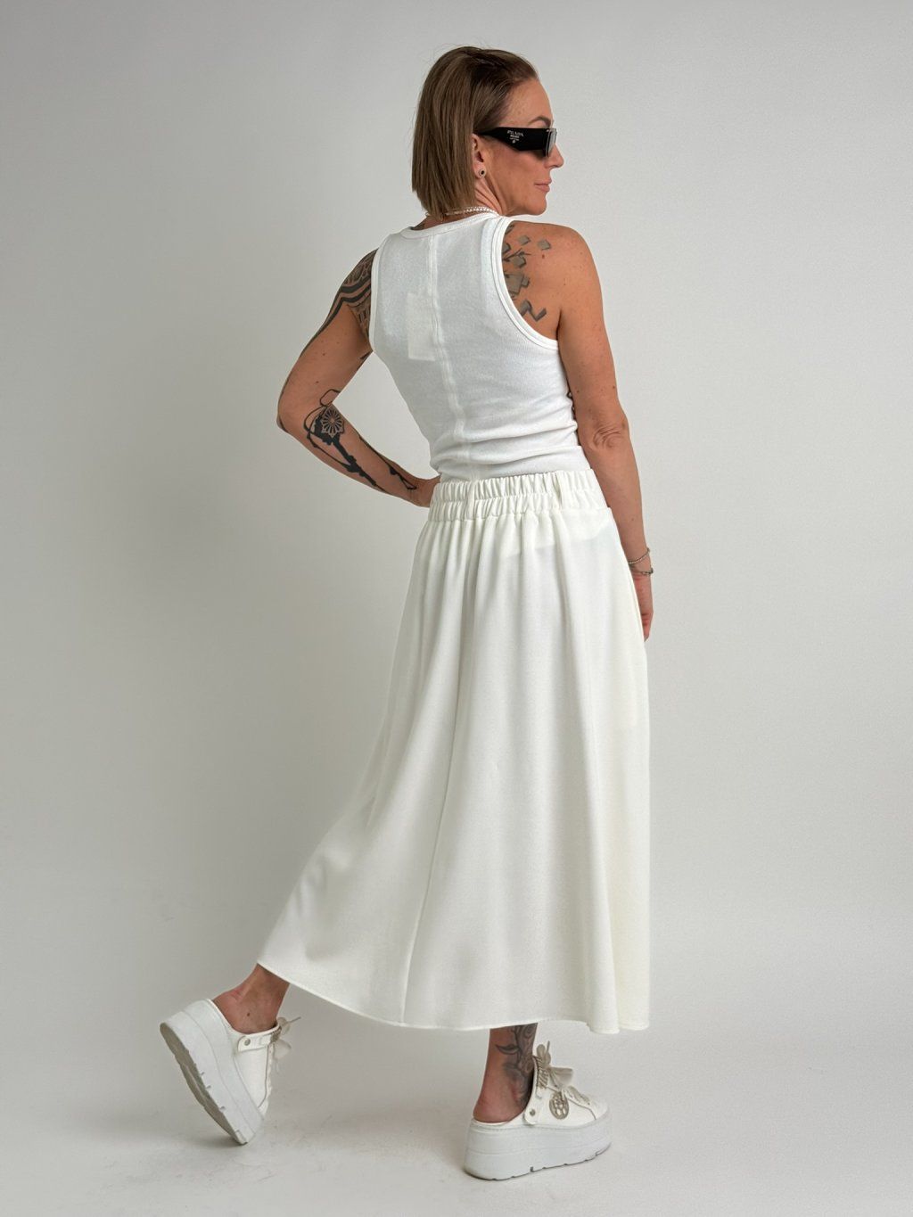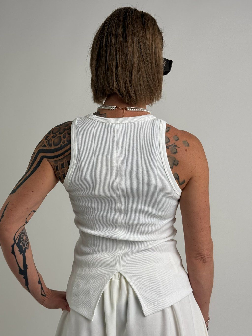Jednoduché tílko s kulatým výstřihem, prostředkem zadního dílu prochází šev, který končí rozparkem.