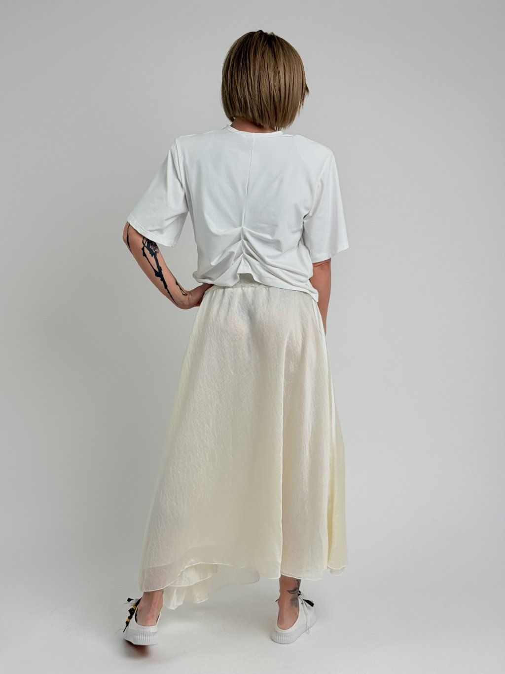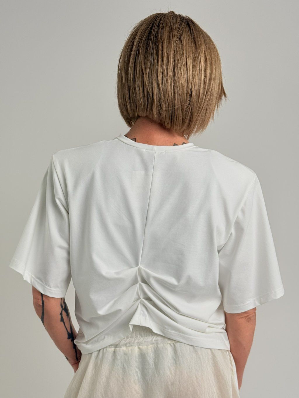 Dokonalé triko s rukávek k lokti, ramenními vycpávkami, řaseným zadním dílem a uvnitř pásek na zmenšení šířky.