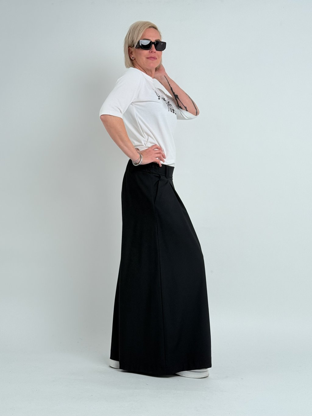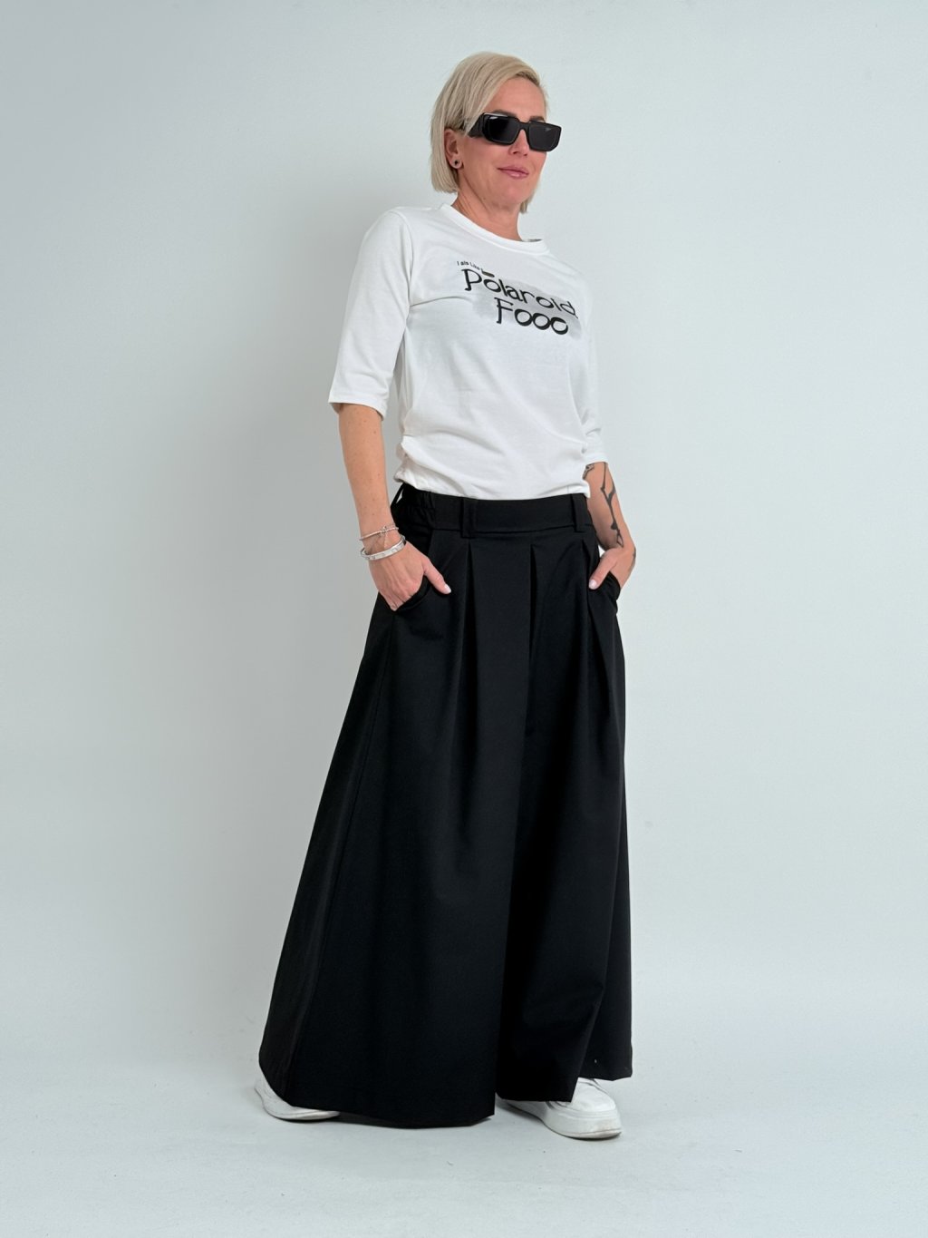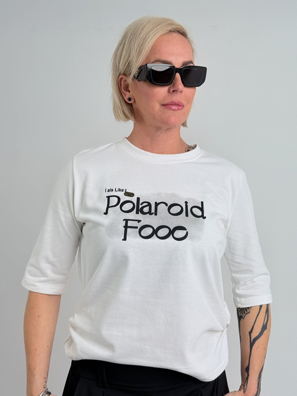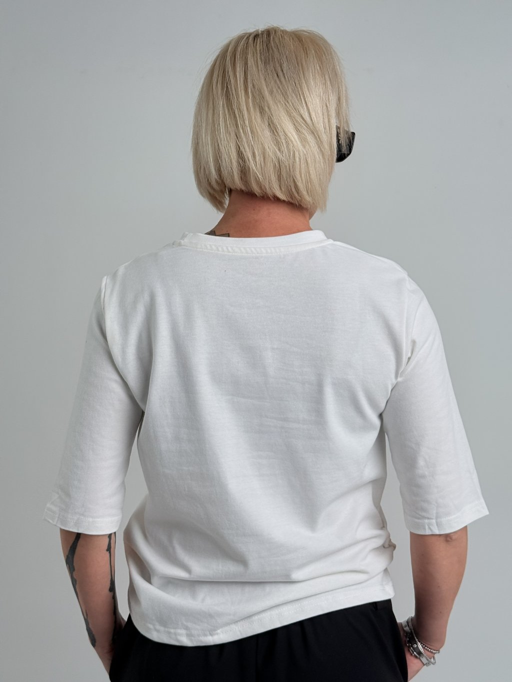 Jednoduché, příjemné, hodně pružné triko, vpředu s potiskem, s rukávem k lokti a po stranách lehce nařasené.