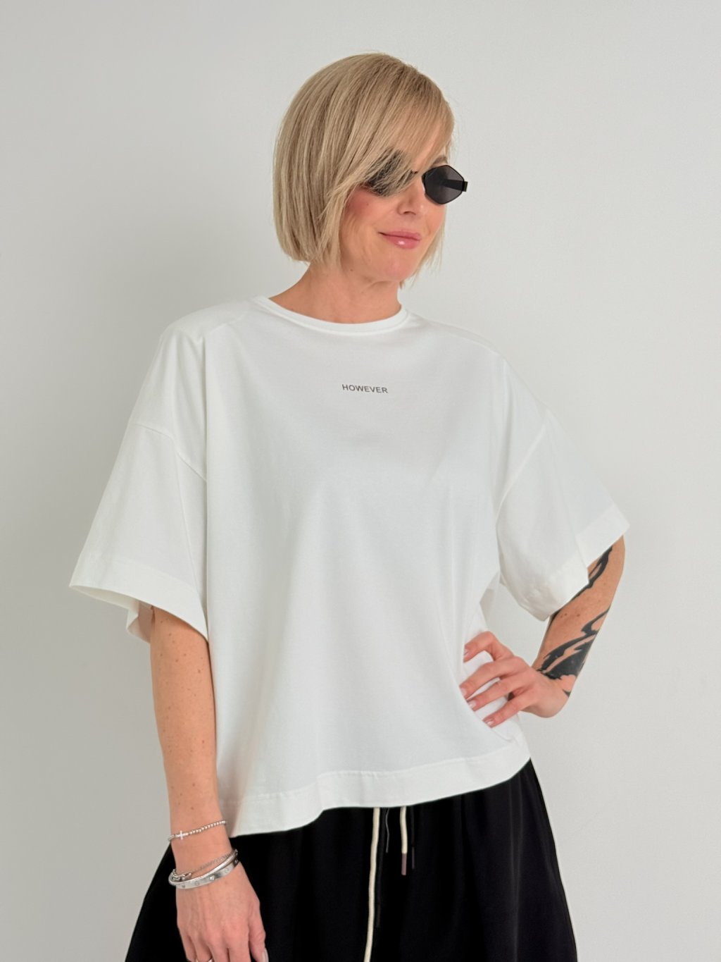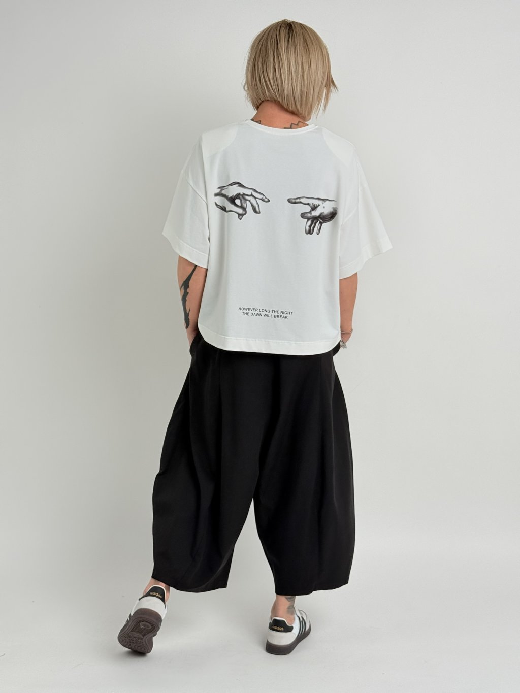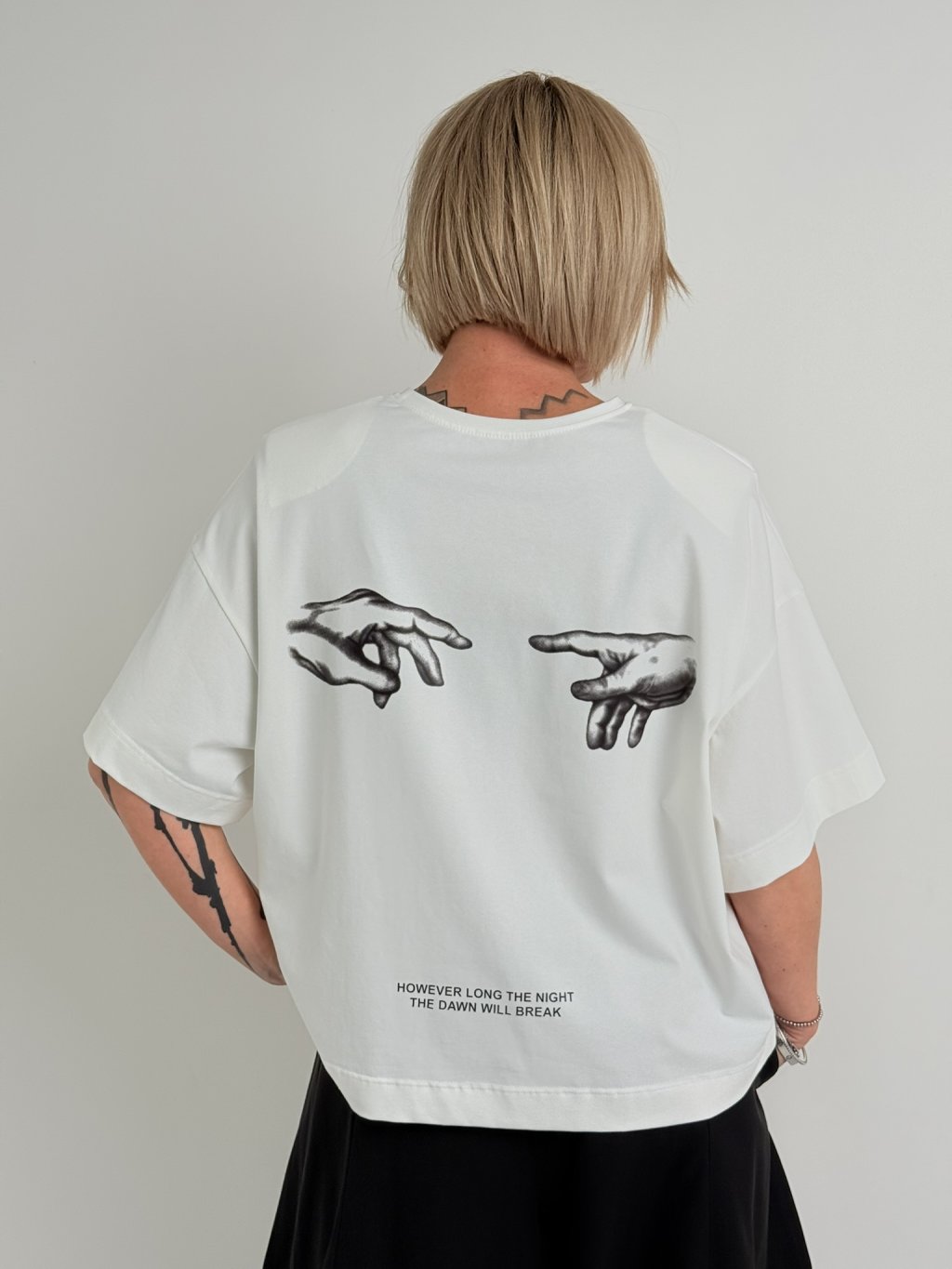 Volnější, delší triko s kulatým výstřihem, rukávem k lokti, s ramenními vycpávkami, s jemným nápisem vpředu a potiskem rukou vzadu.
